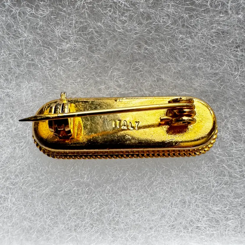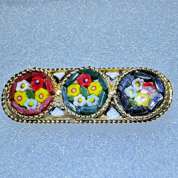 Vintage Italian oval micro mosaic floral bouquet brooch. Absolutely beautiful. Gold rope wrapping around the brooch and in between three different circles with floral bouquets in each. One has black background with a four flower bouquet, one has green background with a five flower bouquet, one had red background with a five flower bouquet. Stamped Italy on the back of the brooch. Measuring 1.25”x.50”.