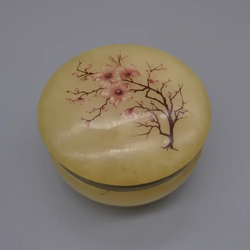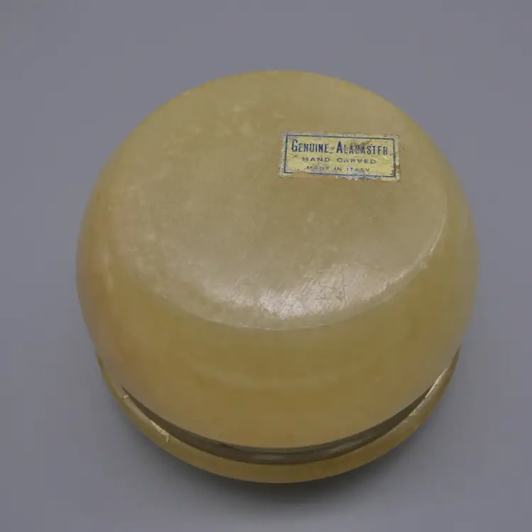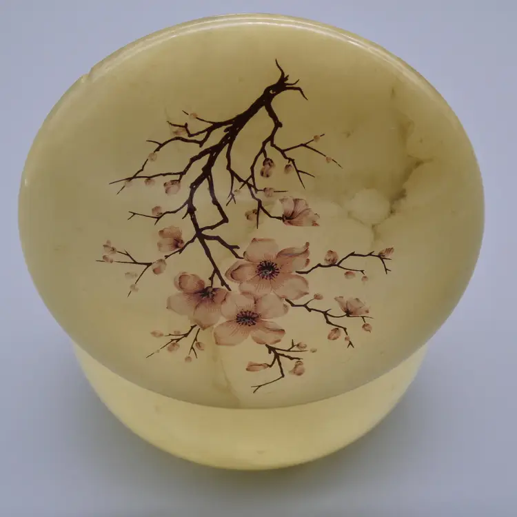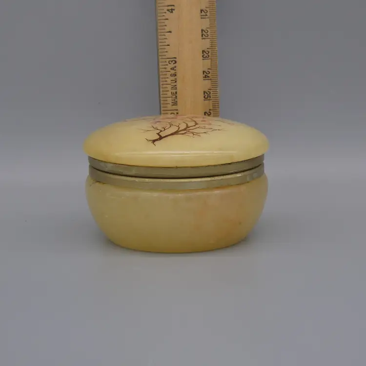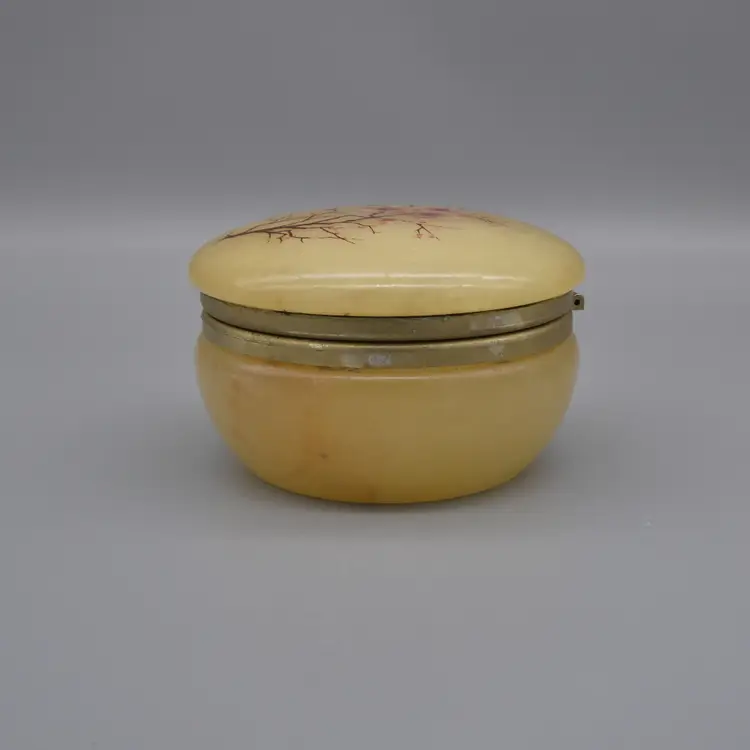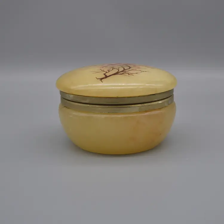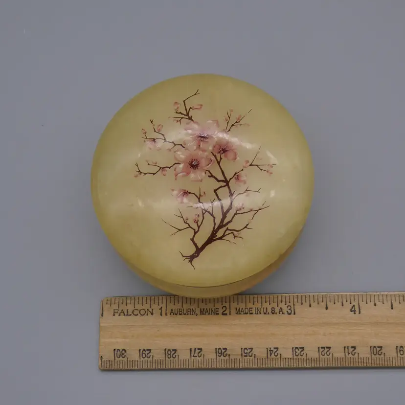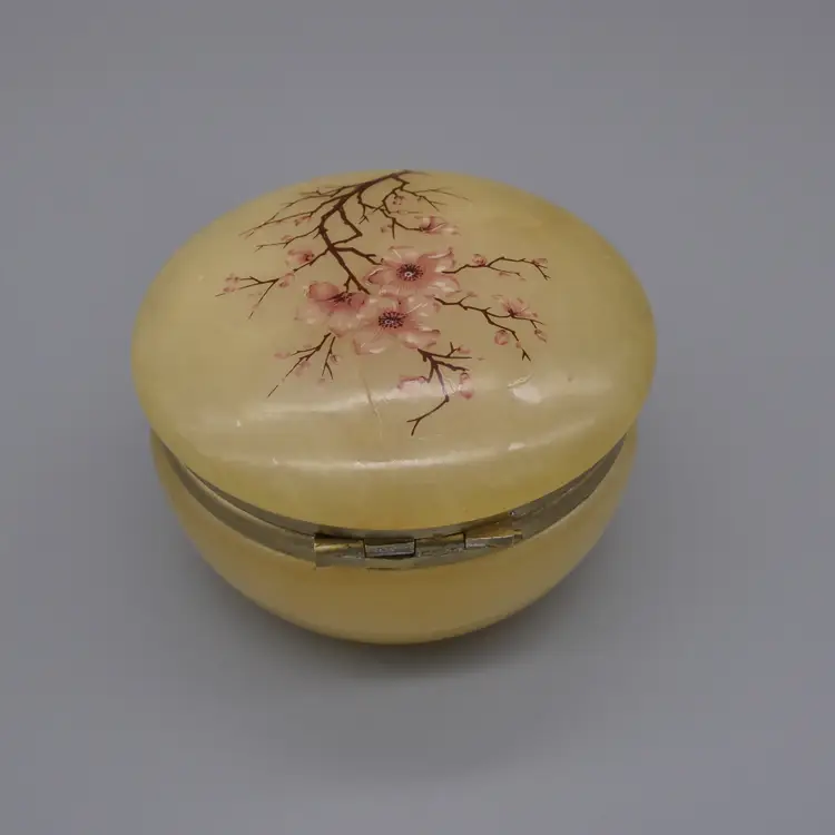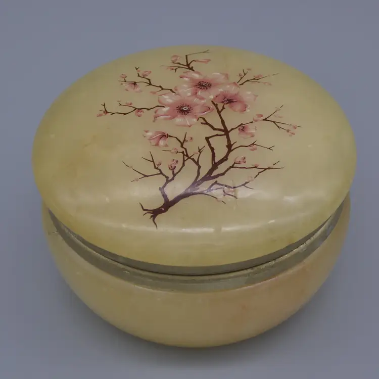 Featuring a gorgeous pink cherry blossom trinket dish Hand-carved genuine alabaster with hand painted metallic gold around the metal rims Hinged lid features a hand painted cherry blossom tree branch Flowers are shades of pink and white with brown tree limbs Alabaster is a blonde color and has natural inclusions present (flaws within the stone itself) Perfect size to stash those precious little things Original sticker label reads: Genuine Alabaster, Hand-Carved, Made in Italy Measures overall about 3-1/4" in diameter x 2-1/8" tall Inside bottom depth is about 1" as well as a slight recess in the lid x 2-5/8" across Weighs about 11 ounces before being packaged to ship