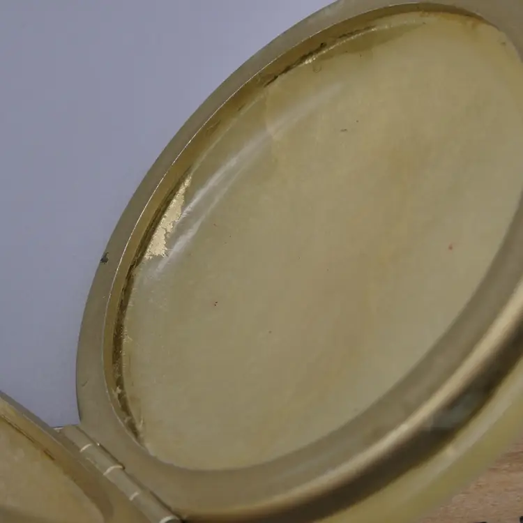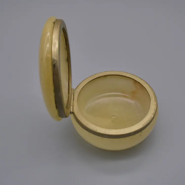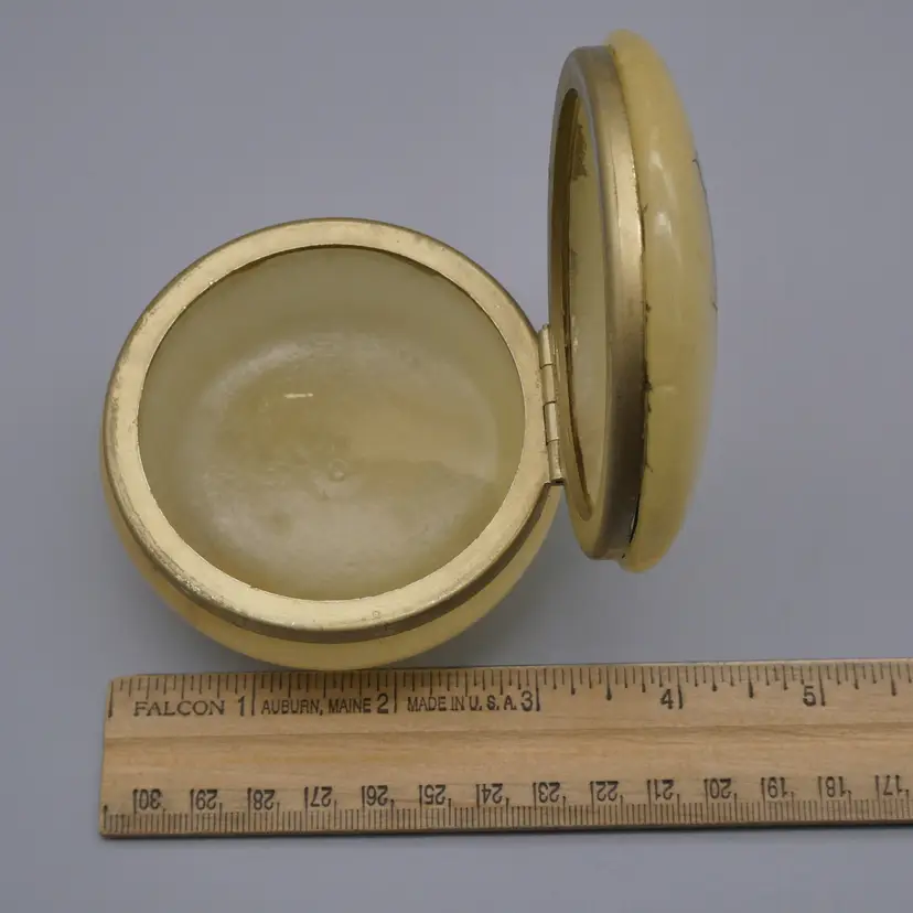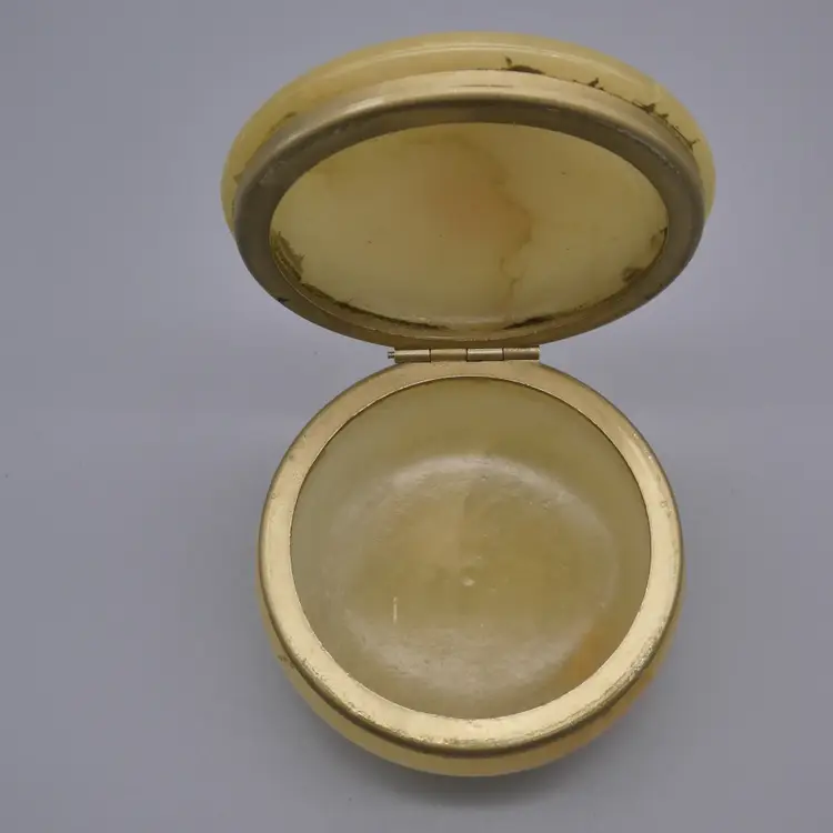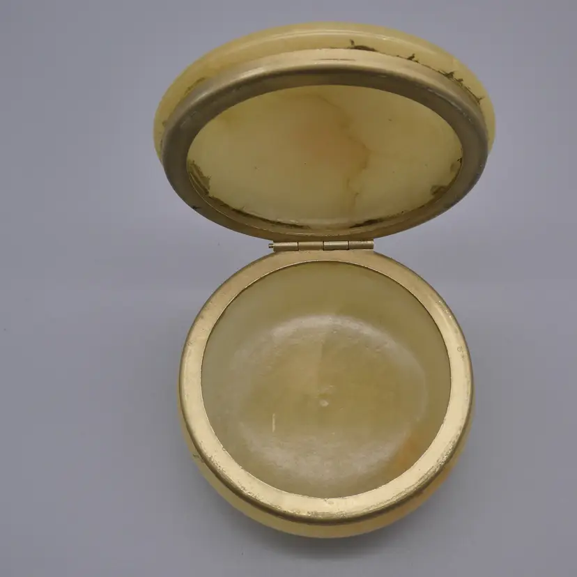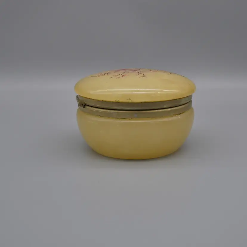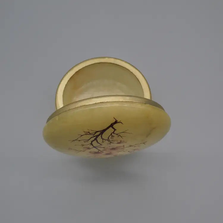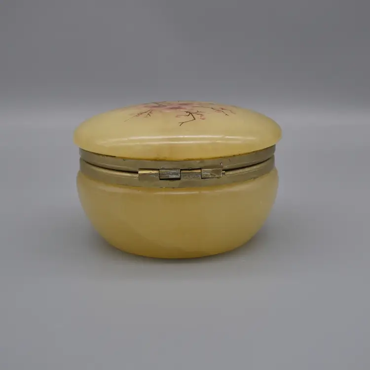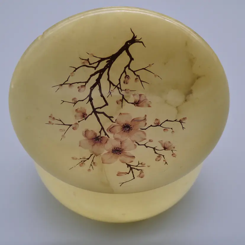 Featuring a gorgeous pink cherry blossom trinket dish Hand-carved genuine alabaster with hand painted metallic gold around the metal rims Hinged lid features a hand painted cherry blossom tree branch Flowers are shades of pink and white with brown tree limbs Alabaster is a blonde color and has natural inclusions present (flaws within the stone itself) Perfect size to stash those precious little things Original sticker label reads: Genuine Alabaster, Hand-Carved, Made in Italy Measures overall about 3-1/4" in diameter x 2-1/8" tall Inside bottom depth is about 1" as well as a slight recess in the lid x 2-5/8" across Weighs about 11 ounces before being packaged to ship