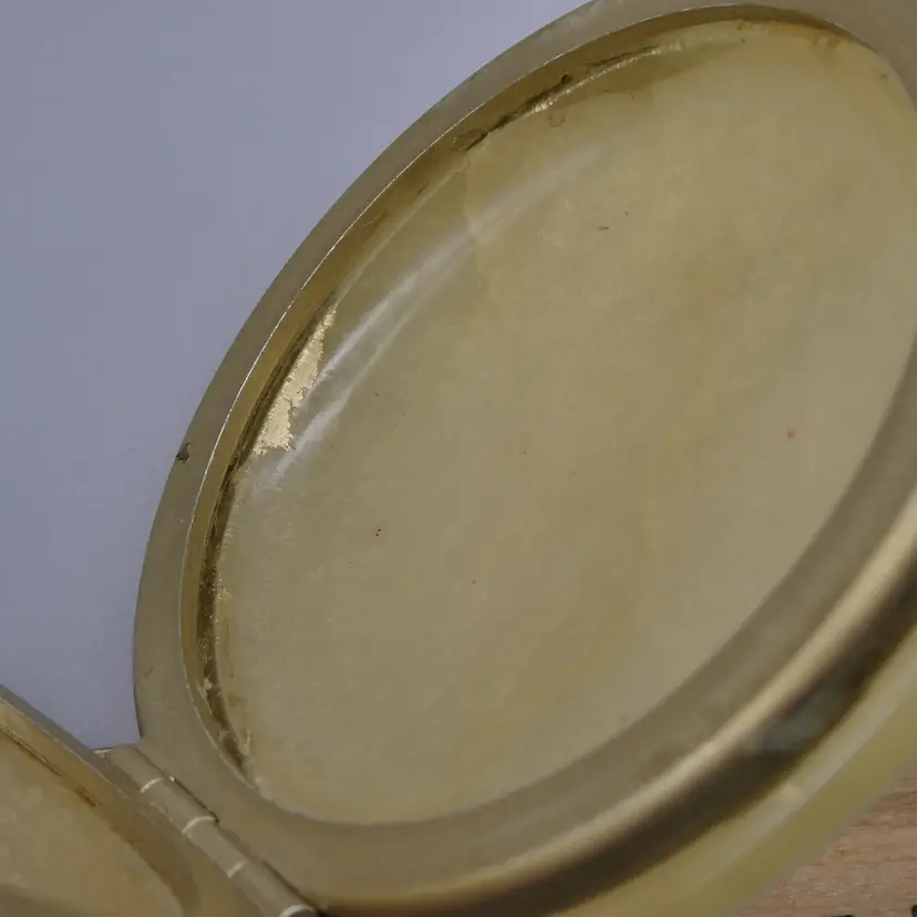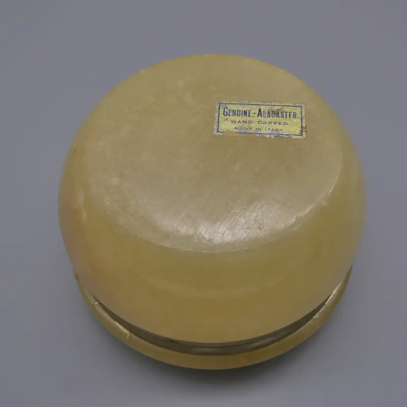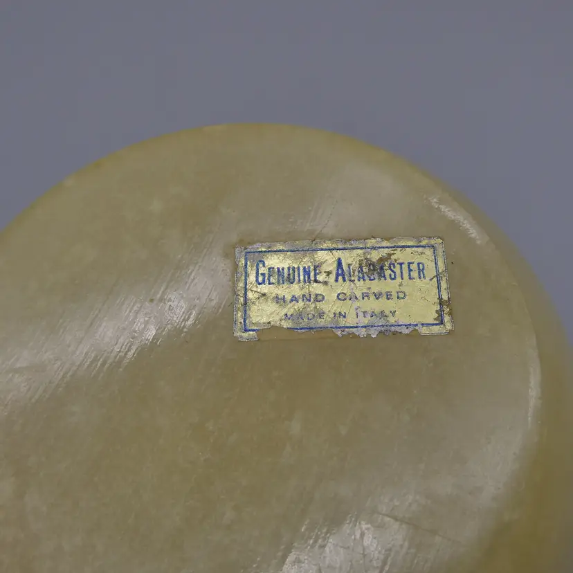 Overall, good vintage condition with signs of age/use/wear to include surface scratches/scuffs, gilt work is a little sloppy (see pics) with some gold loss, tiny knicks around the upper rim and what may be a small chip on the upper edge (could be a natural inclusion). Hand painted, so expect minor imperfections, especially with the gold gilt. Hand carved, so expect minor imperfections with the alabaster.