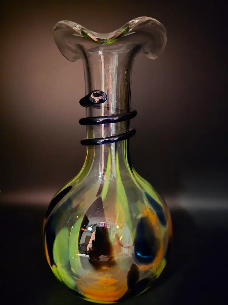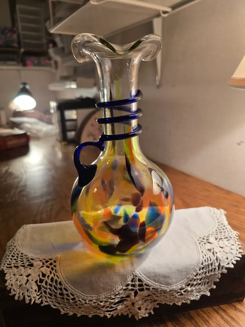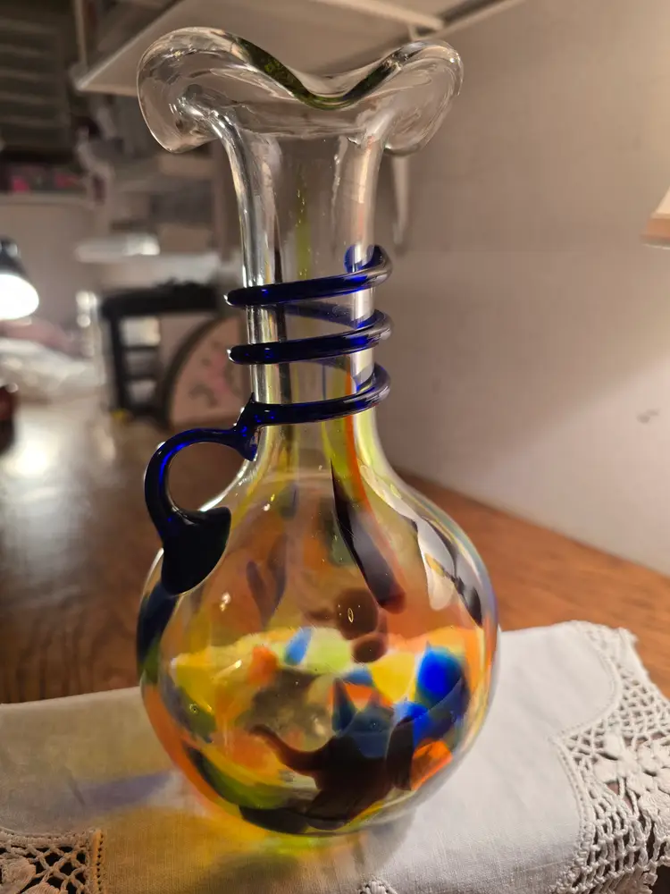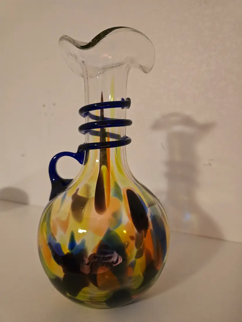 This vintage hand blown glass vase is made in the Italian Murano-style design. It has a colorful confetti pattern and a cobalt swirled applied handle. The ruffled edge adds lovely touch to this 9 inch tall vase. It has a glossy finish with bubbles scattered throughout the glass. In perfect vintage condition. There are no chips or imperfections.