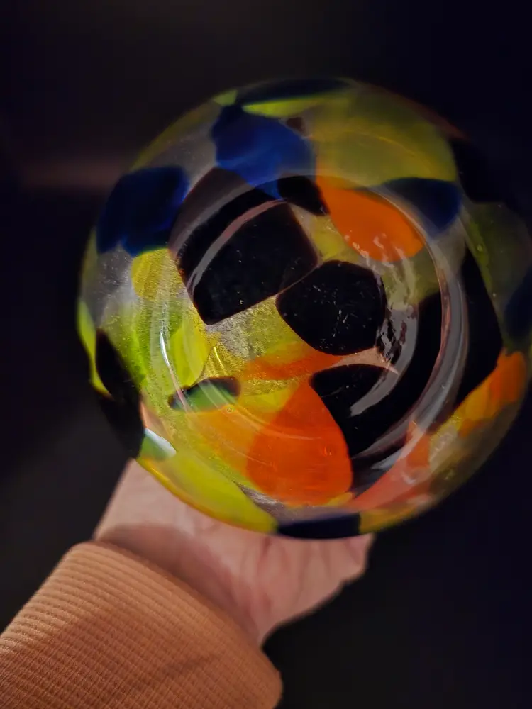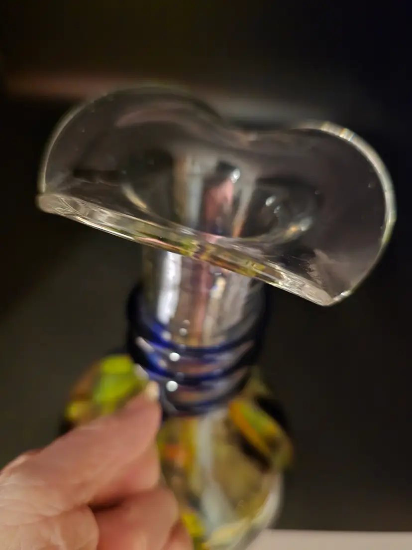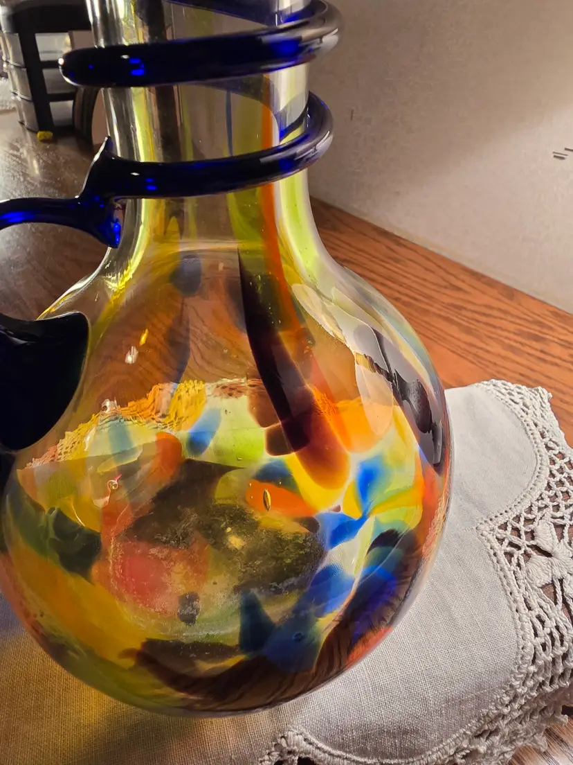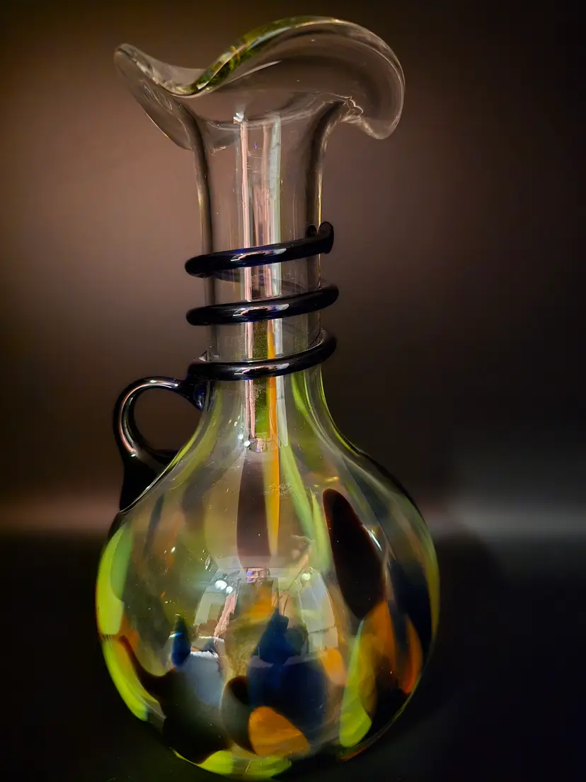 This vintage hand blown glass vase is made in the Italian Murano-style design. It has a colorful confetti pattern and a cobalt swirled applied handle. The ruffled edge adds lovely touch to this 9 inch tall vase. It has a glossy finish with bubbles scattered throughout the glass. In perfect vintage condition. There are no chips or imperfections.