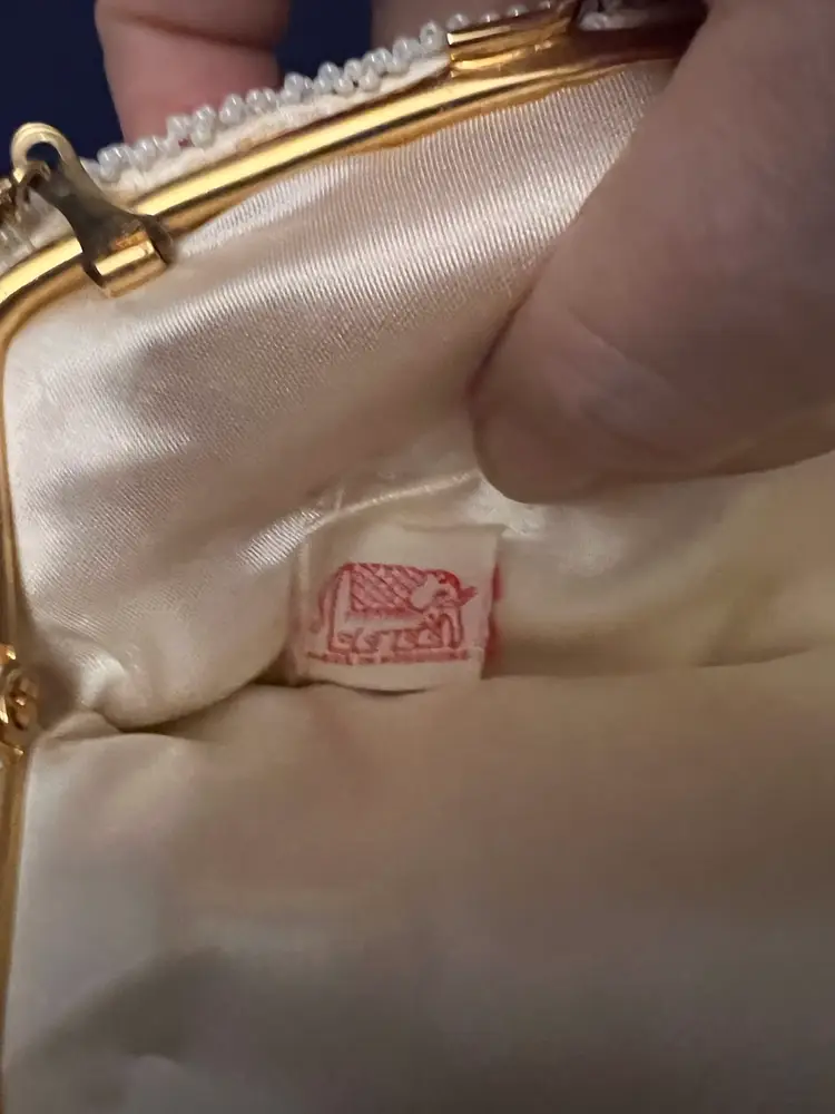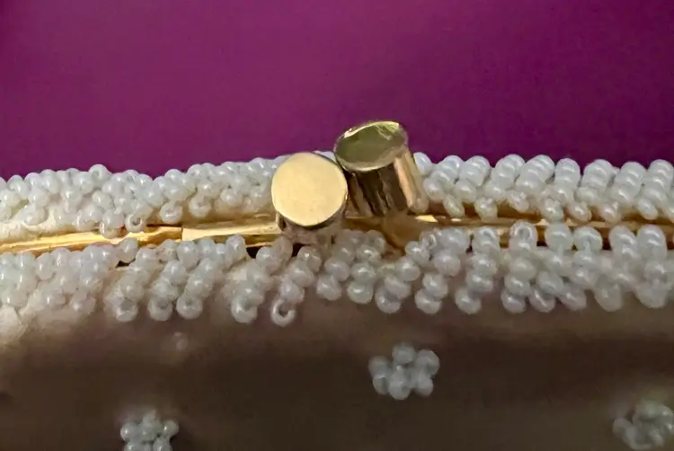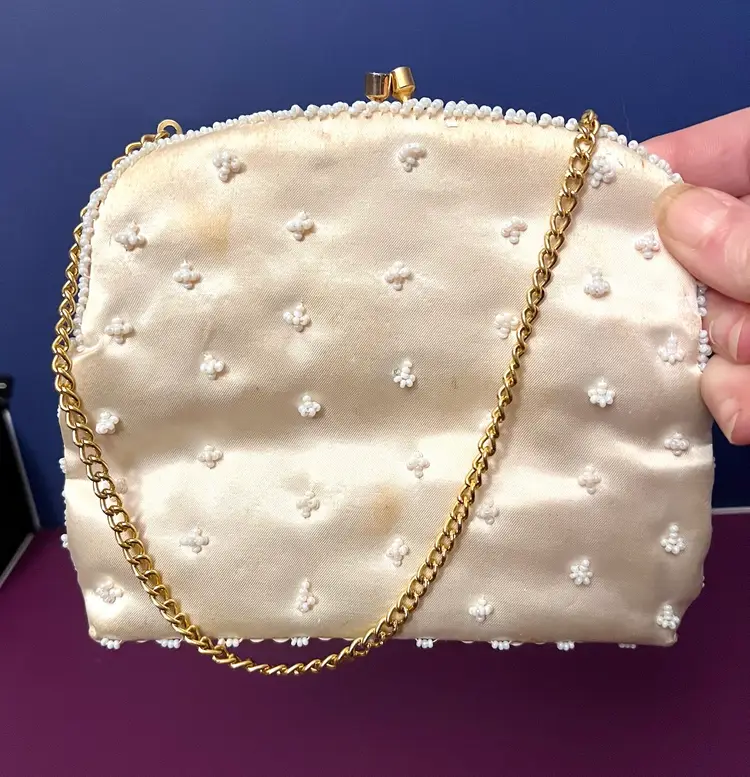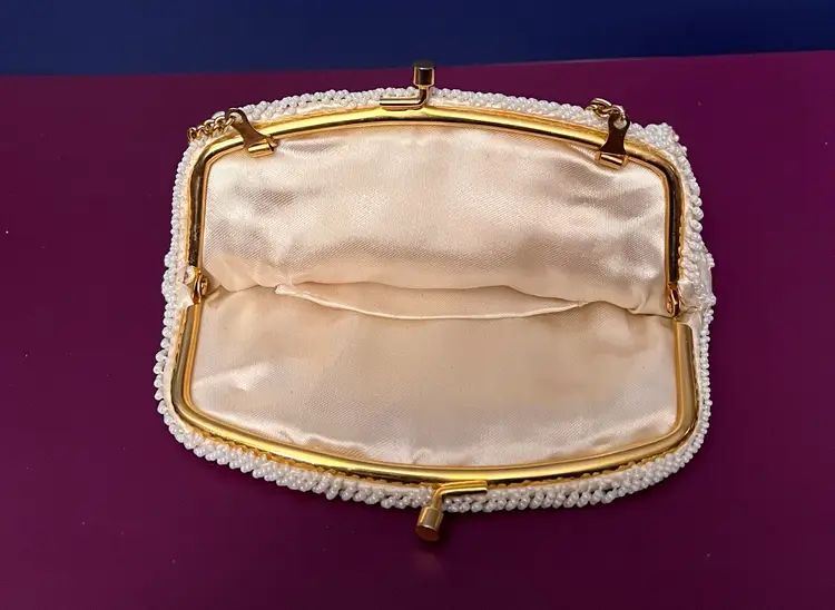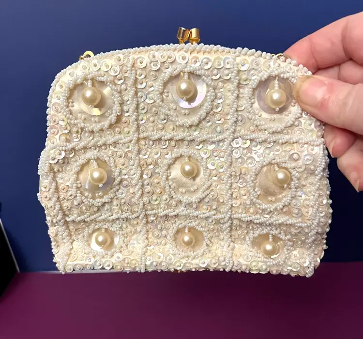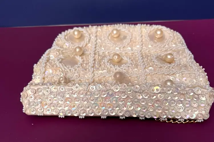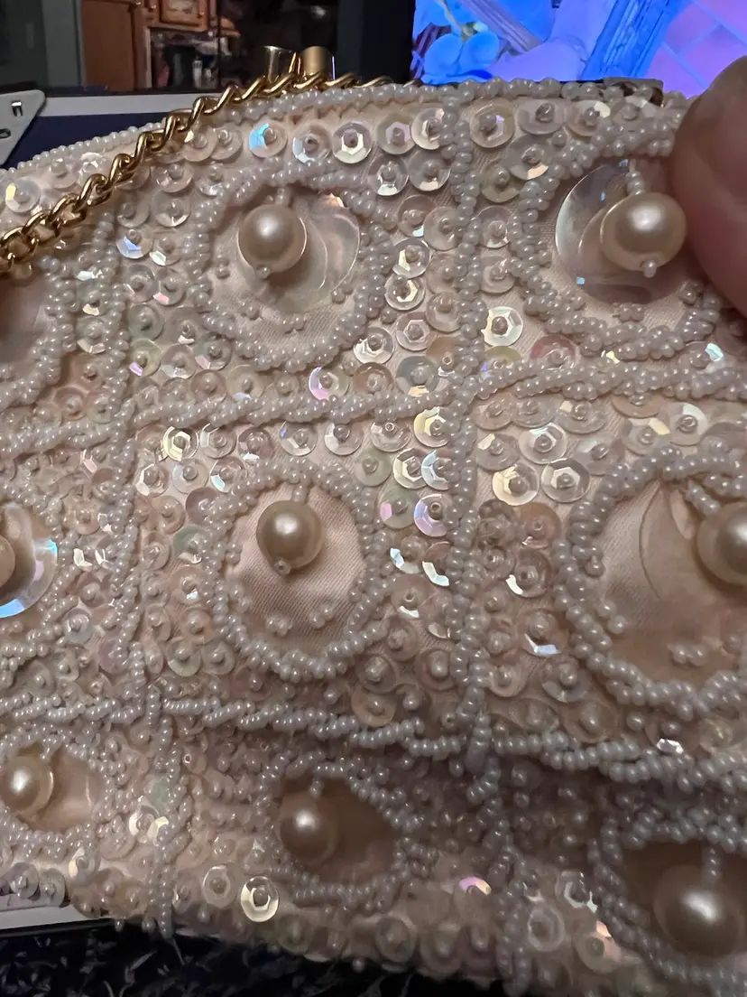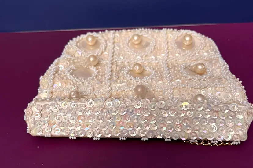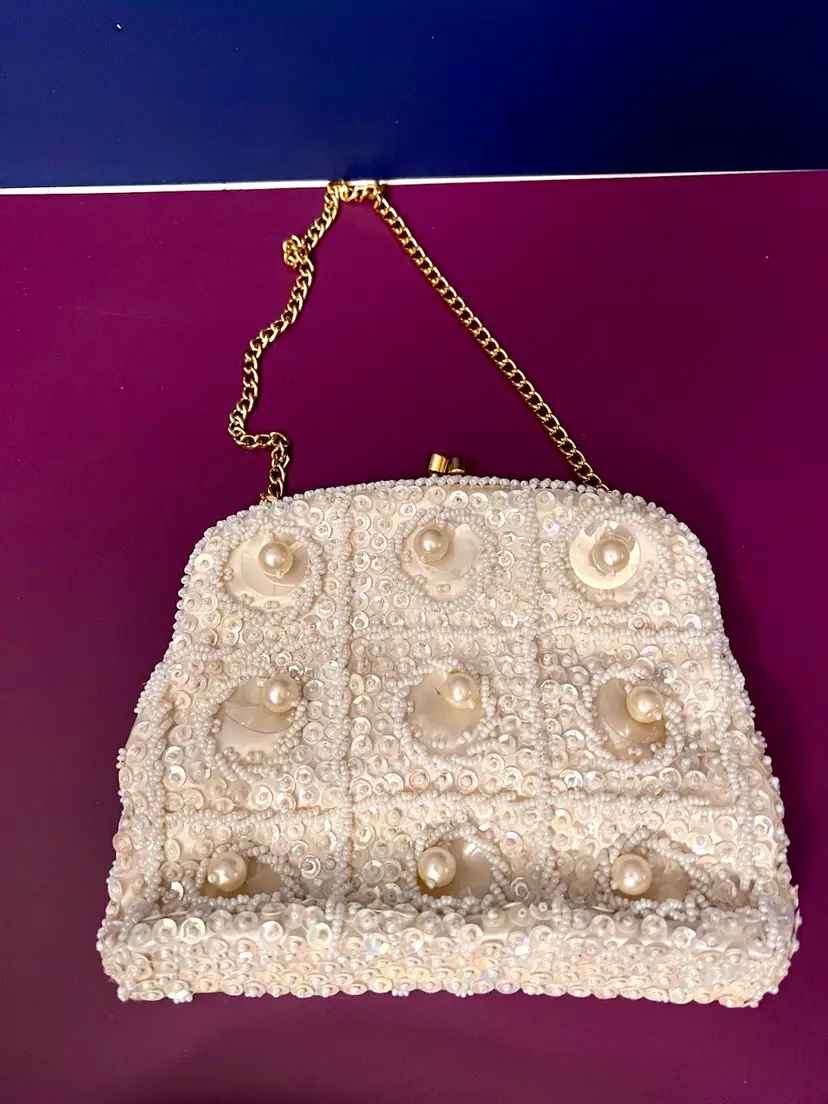 Elegant small Beaded and sequined purse with gold colored clasp and chain. Chain can be tucked inside. 6” x 5”