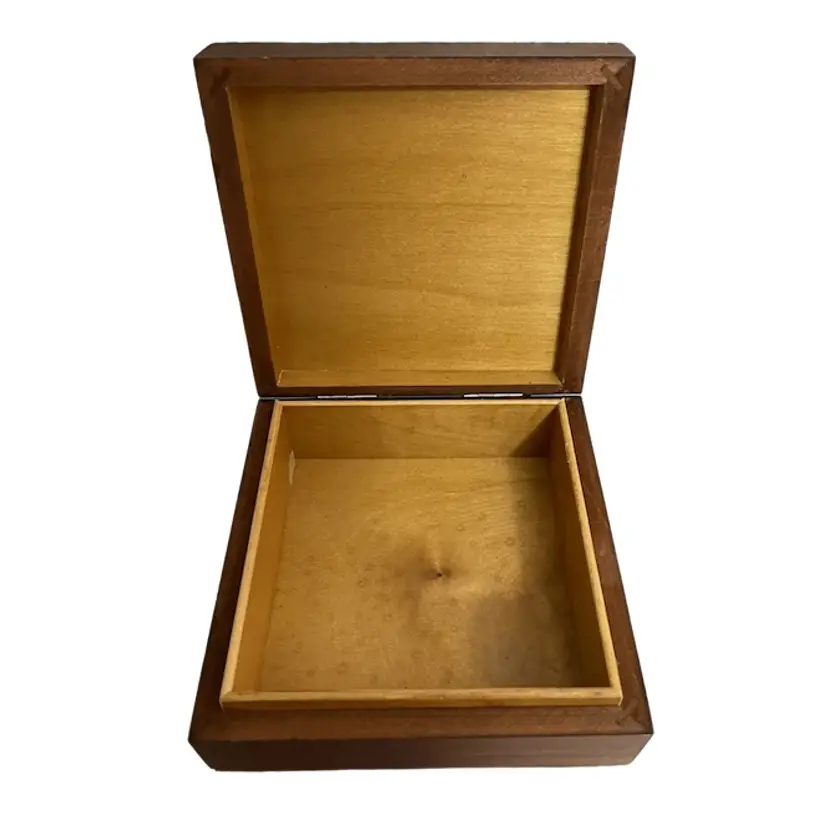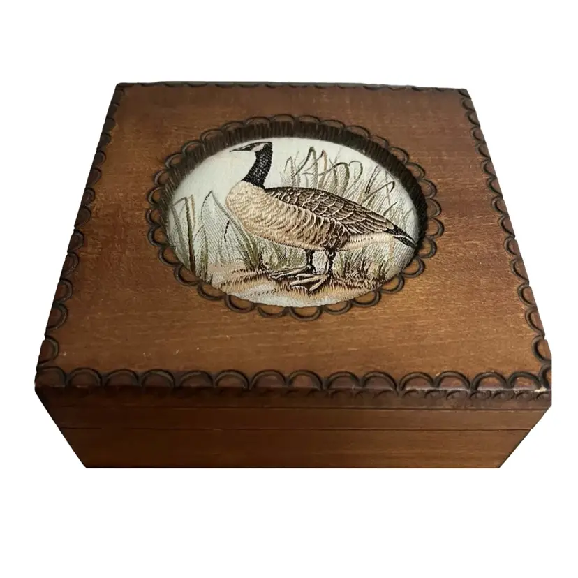 This exquisite box has a needle point silk inlay of a Canadian goose in reeds. The box is hinged and has a scalloped carved edge. It is very well made and has no maker marks.