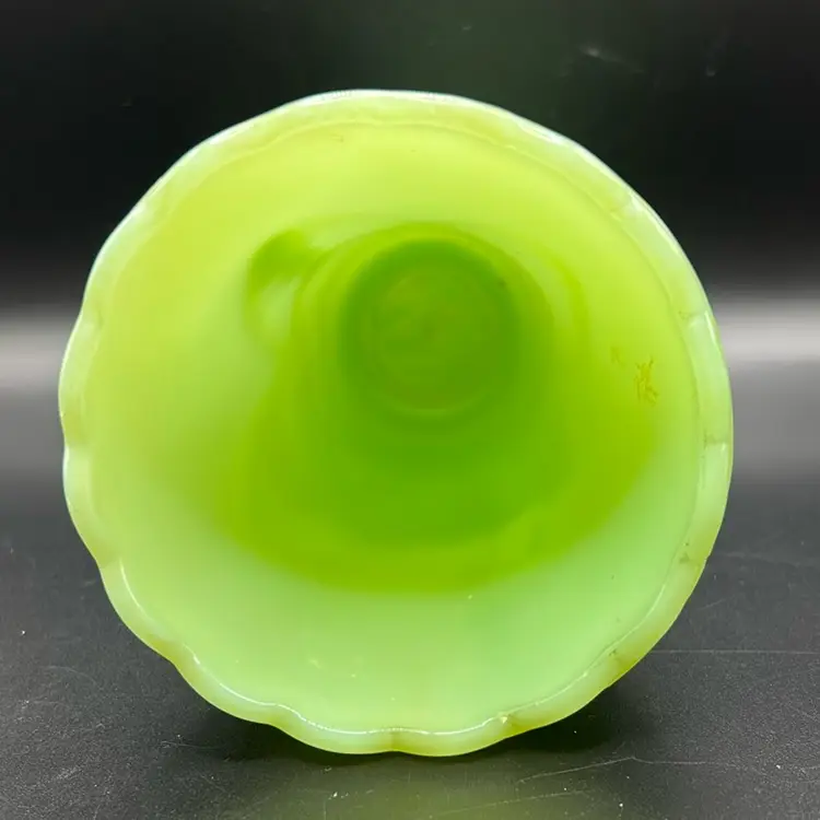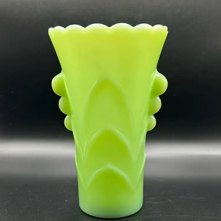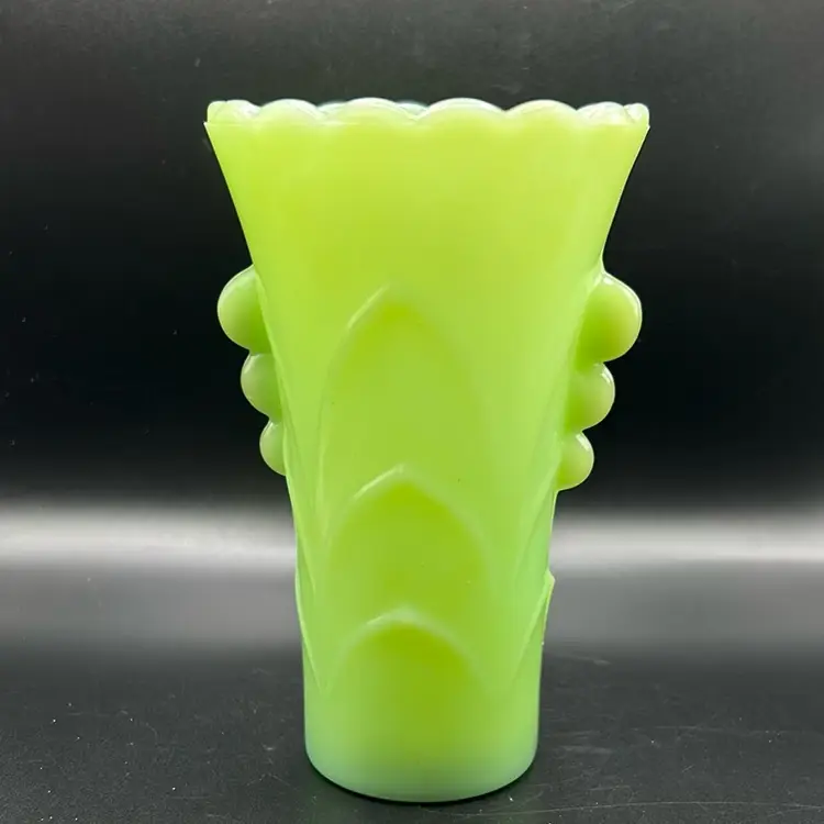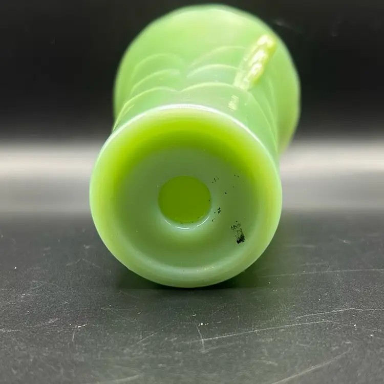 This item is a vintage anchor hocking fire king jadeite glass deco vase. It features an art deco design and iconic mint green color, commonly known as jadeite. His dance is just over 5 inches tall and 3 inches across there are no chips or crack
