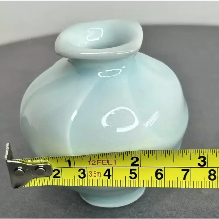 This is a vintage handmade soft blue porcelain bud vase, dated 1992 and signed by J.S. Cummings. It features a round swirl abstract 3D pattern and stands 3.25" inches tall, is almost 3" inches wide and has a base width of 1.25 inches. It is a handmade art pottery piece with a glossy finish, reflecting the abstract art style of the late 20th century.