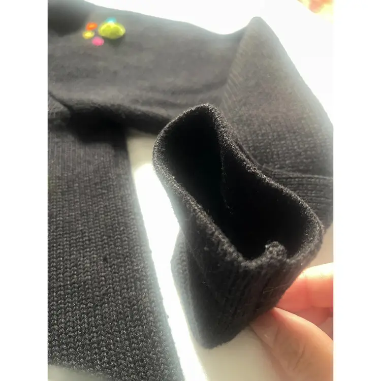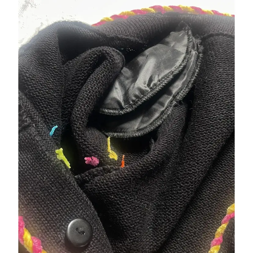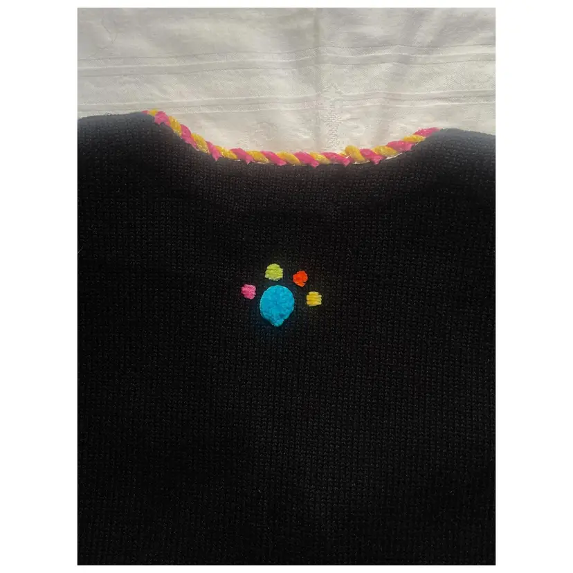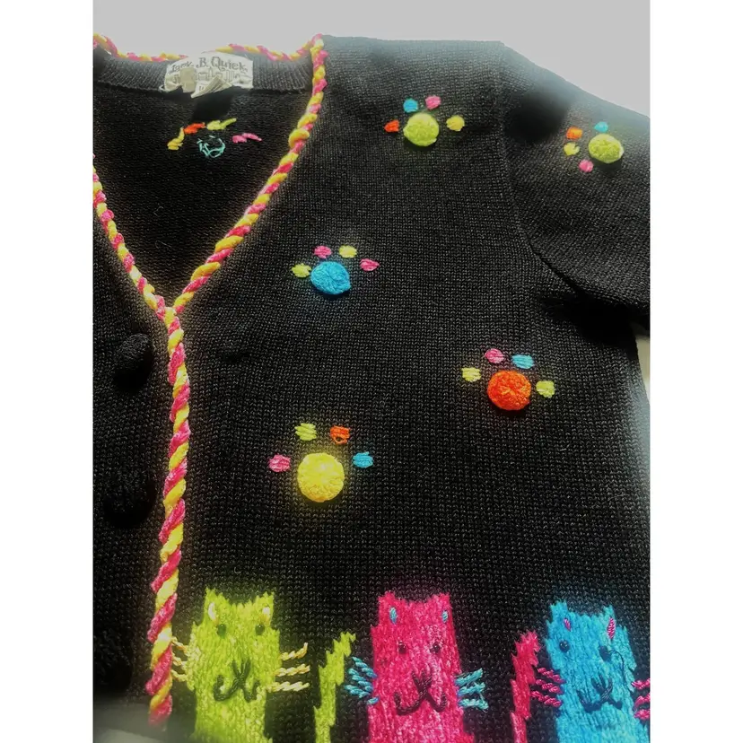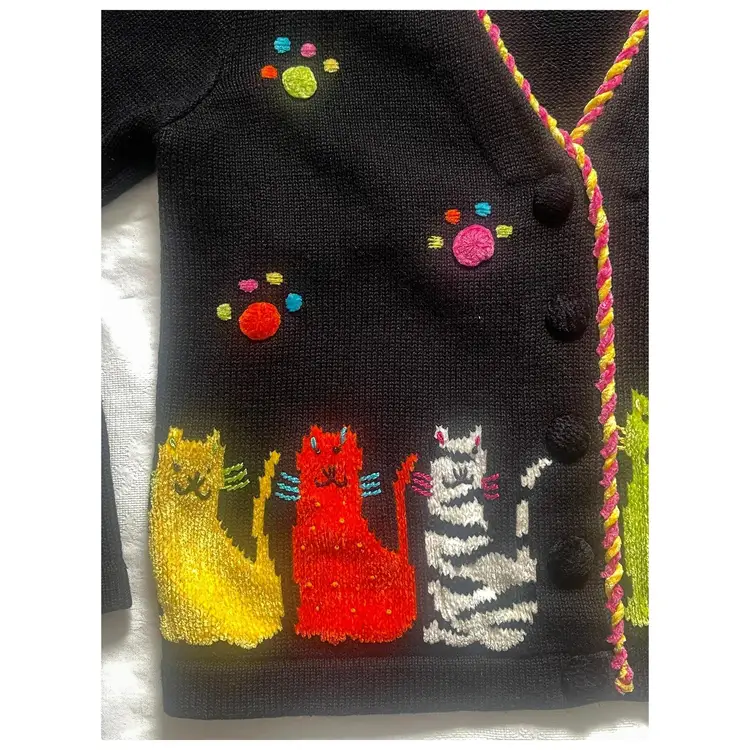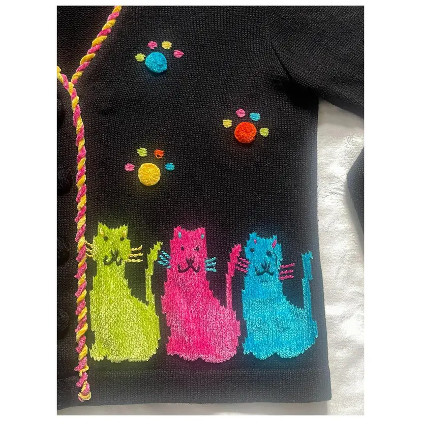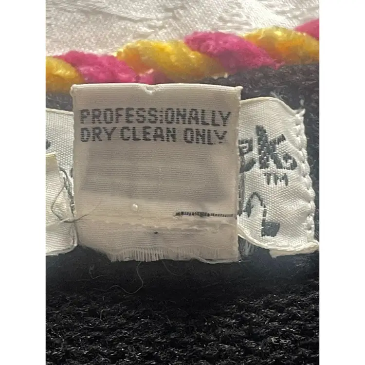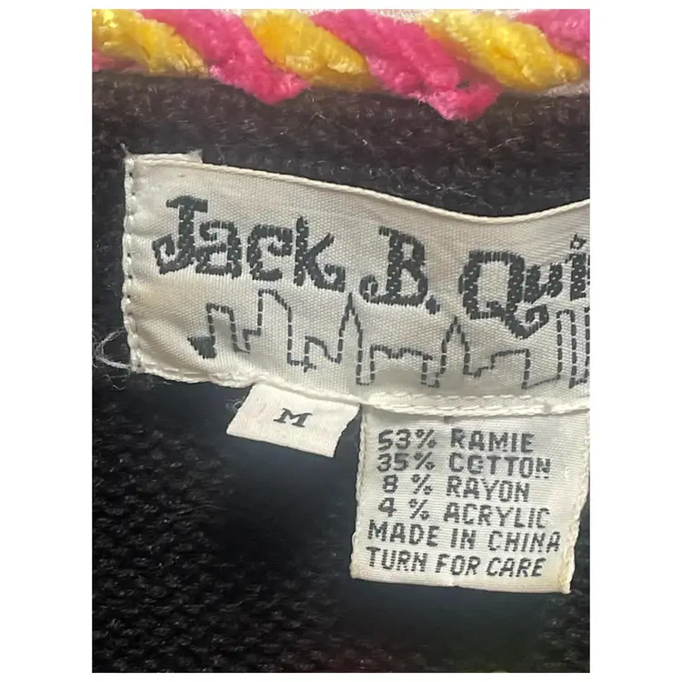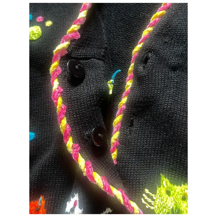This adorable, brightly colored knit sweater is made of 53% Ramie, 35% Cotton, 8% Rayon, and 4% Acrylic. It has shoulder pads, as was customary in the 1990s. It is in GUVC with very little snagging. The buttons may need some tightening up. Please see all photos, as they are part of the description.