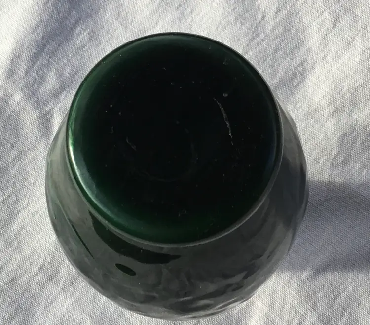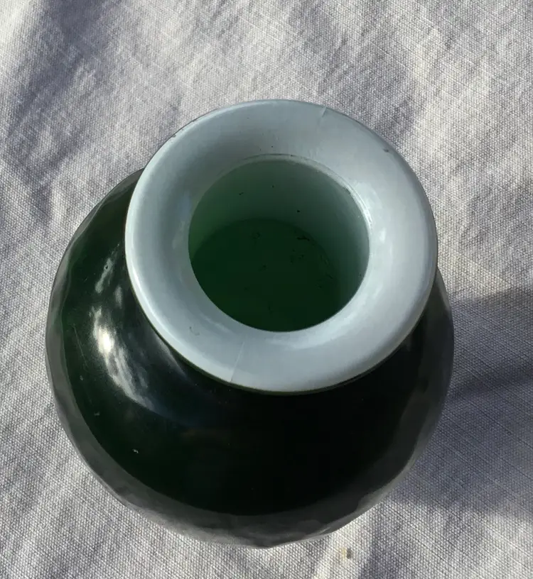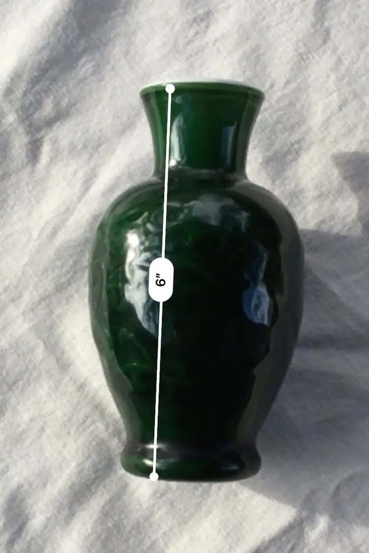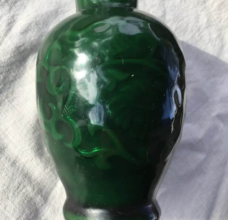 This is a vintage jade green Avon Spring Bouquet fragranced vase. It was manufactured in 1981. The vase is made of cased (white glass interior with a green coating) glass with a coated finish that was originally scented. The vase features an embossed floral design in a Chinese style. The top edge of the vase is white.