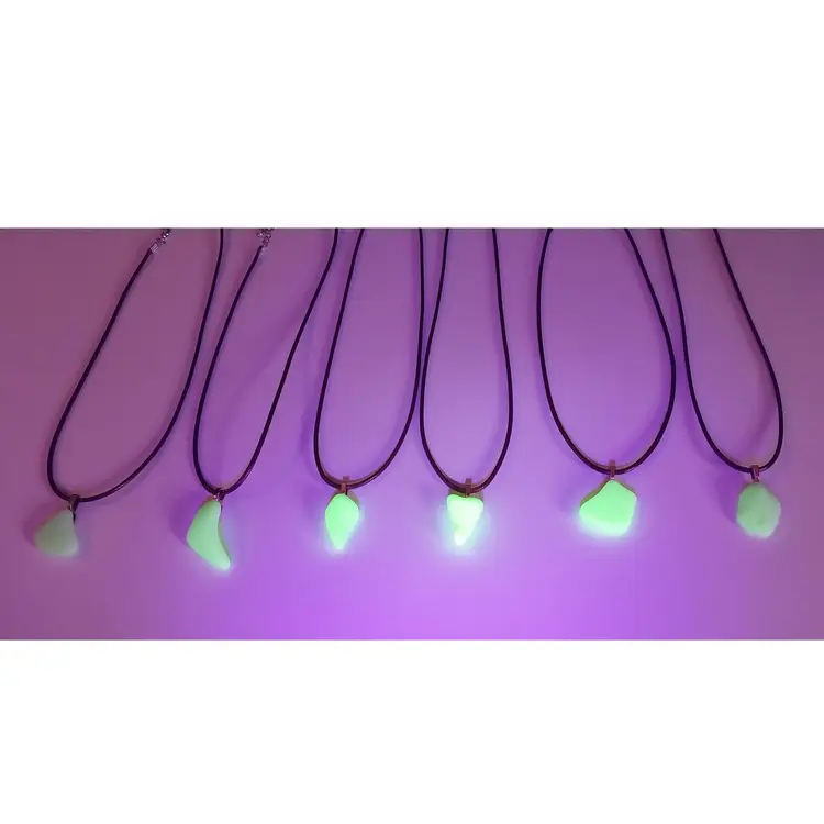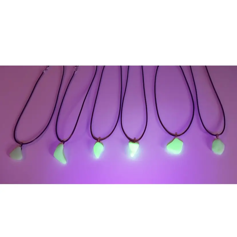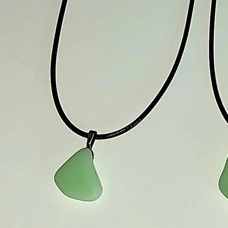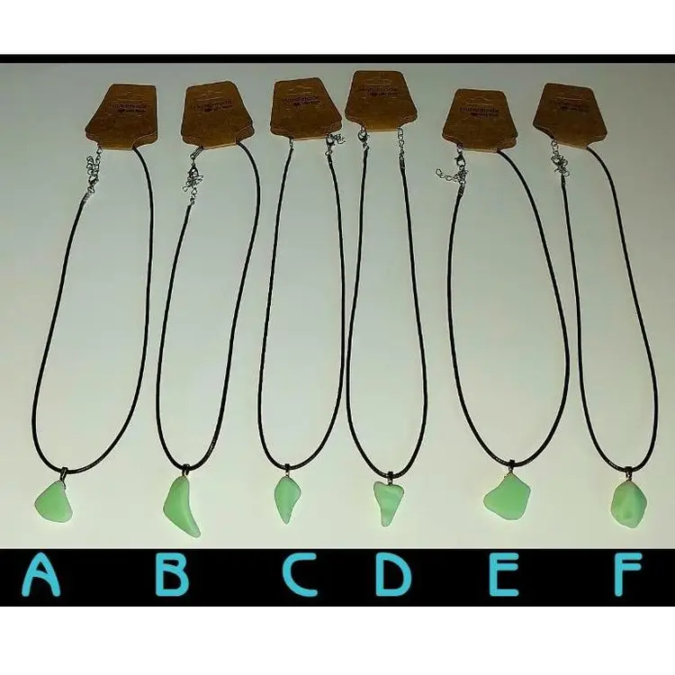 Jadeite Pendant Necklaces!! Handmade by me, from pieces of a broken, almost antique 1930s Sunbeam Juicer attachment bowl that I tumbled in a rock tumbler for many days! And yes, they glow under UV/Black light!! They range in size from about 9" long to 14" long give or take, depending on the pendant and where you clasp the lobster claw on the chain.
