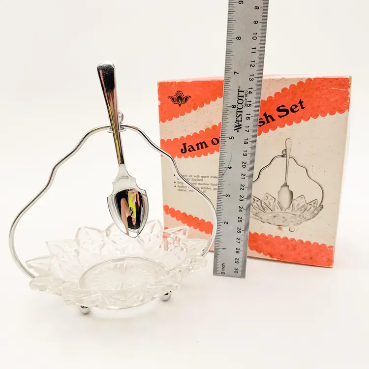 Clear glass dish with chrome stand and spoon In original box, excellent condition, see all photos