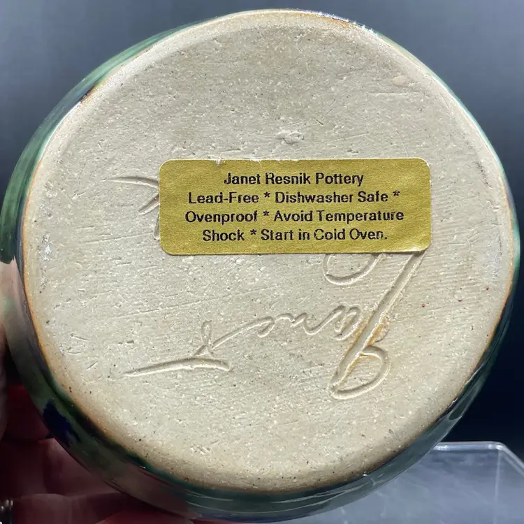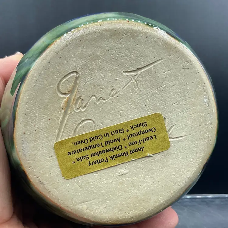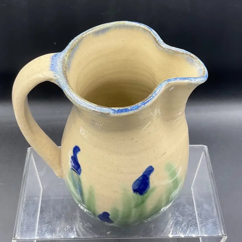 Vintage blue Iris art pottery pitcher by Janet RESNIK no chips or cracks slight crazing to the glaze