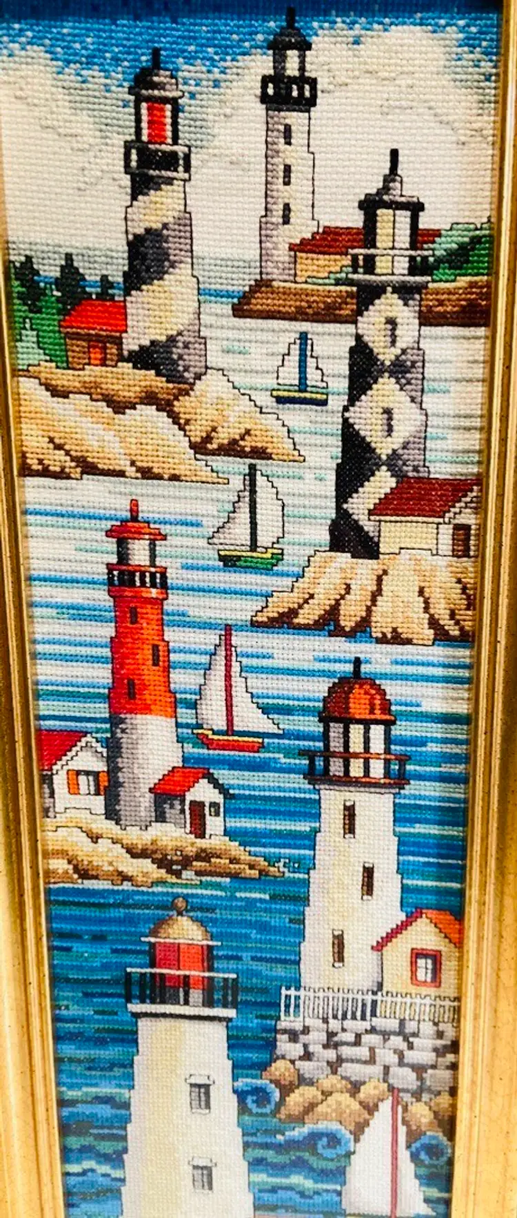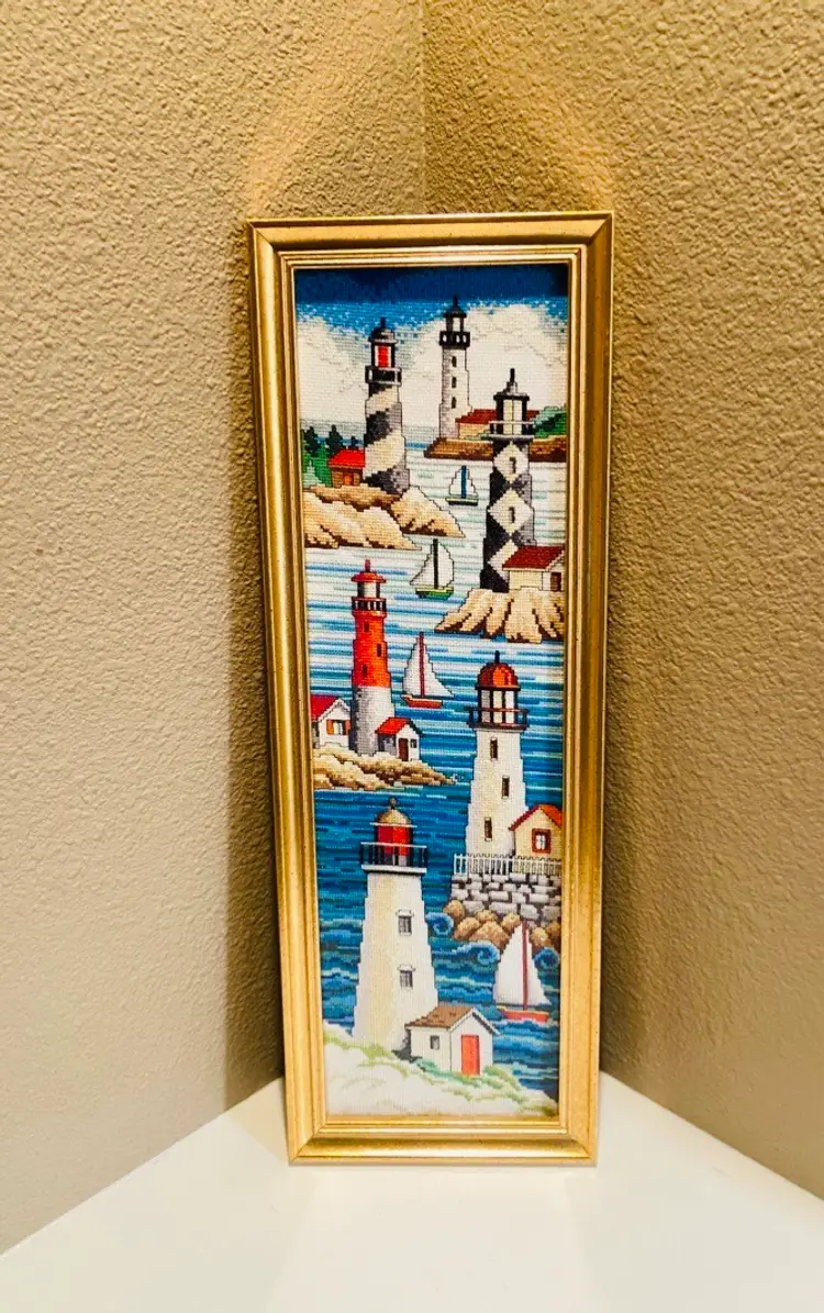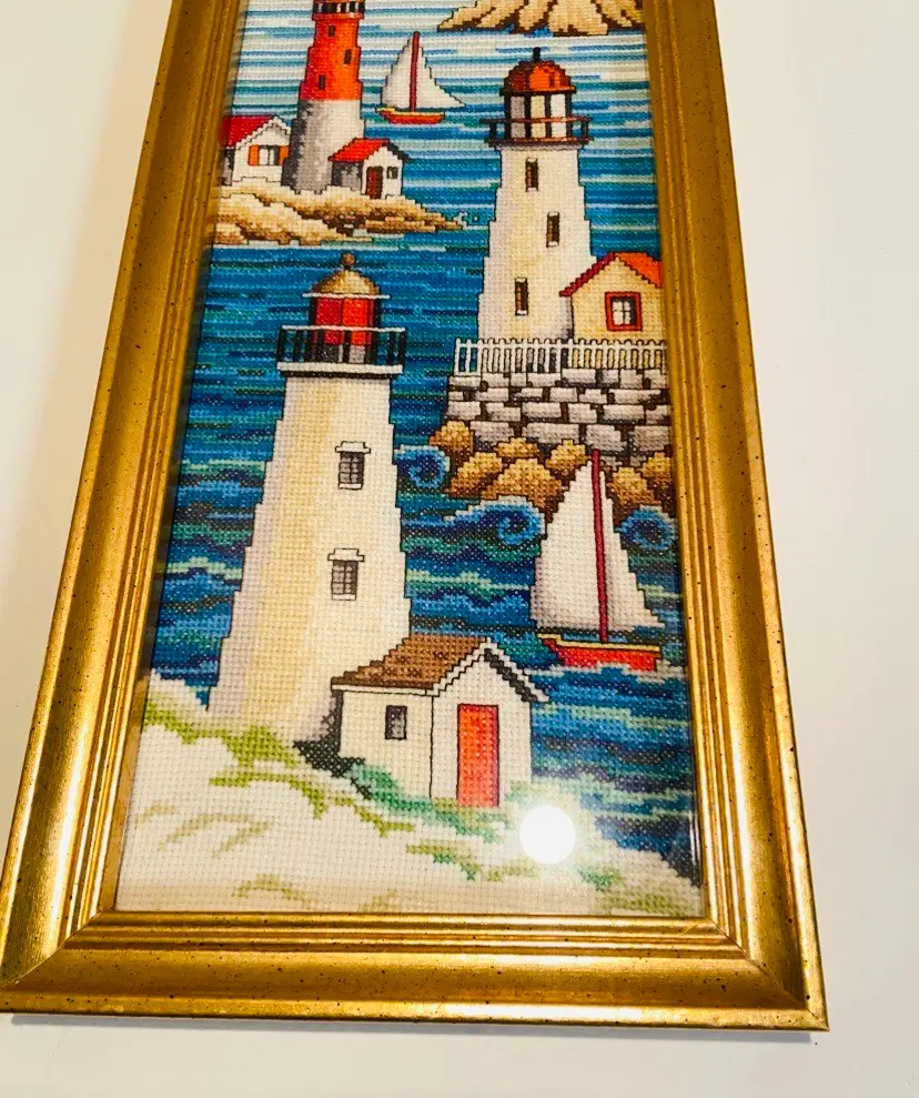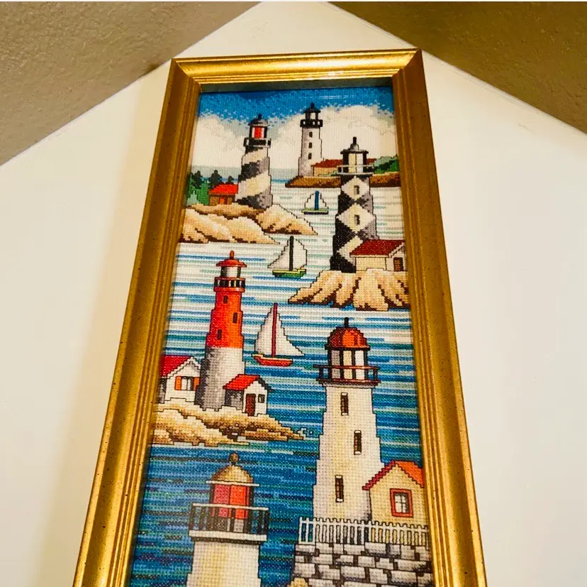 This beautifully completed and framed Janlynn “Lighthouses” counted cross stitch. Meticulously hand-stitched with vibrant detail, this vintage needlework captures the timeless beauty of classic seaside lighthouses — perfect for anyone who loves nautical décor, beach themes, or handcrafted art. 1970-1980 American Folk Art. In good used condition. No stains.