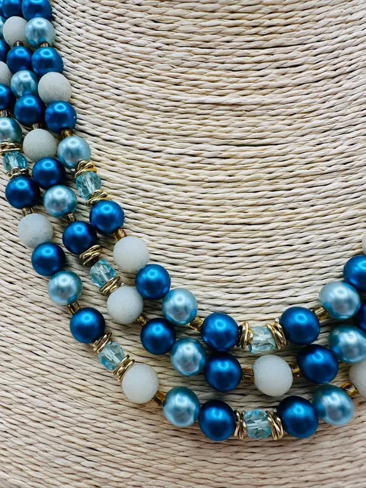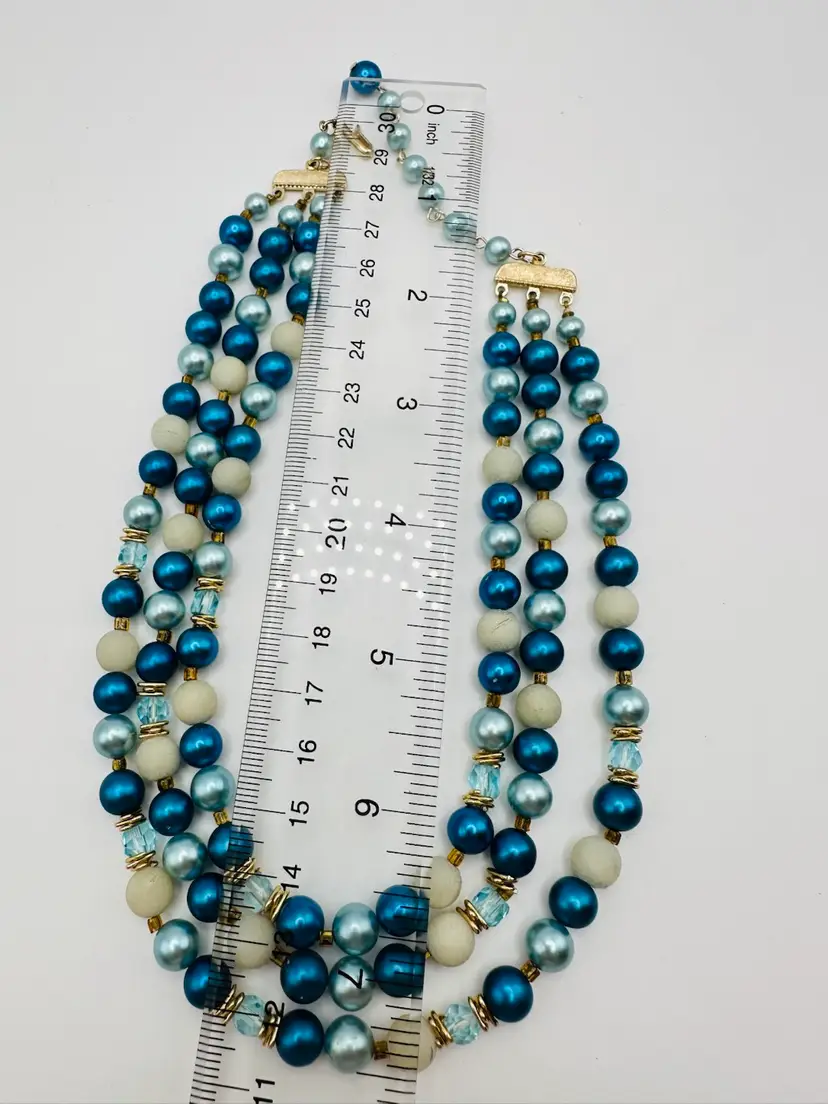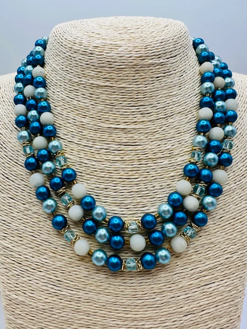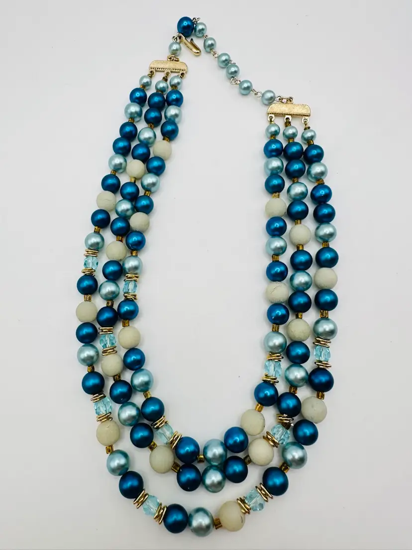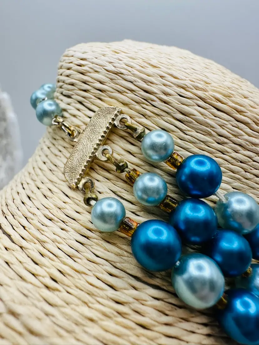 This vintage Japan necklace features three strands of faux pearl beads in blue with crackle beads, creating a unique and retro style. The necklace has a hook closure and a length of 16 inches, making it a statement piece for any fashion-forward individual. The materials sourced from Japan add an extra touch of authenticity and charm to this original piece of vintage jewelry.
