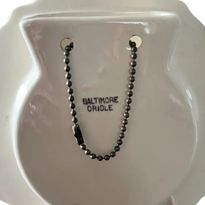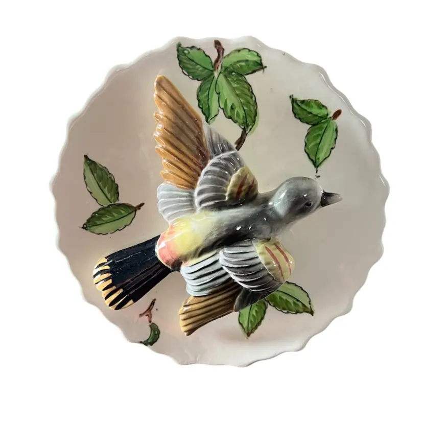 This is a cute vase with 3D Baltimore oriole has a hanger so it can be hung but a flat bottom so it could just sit on a shelf. It is in great condition no chips or cracks.
