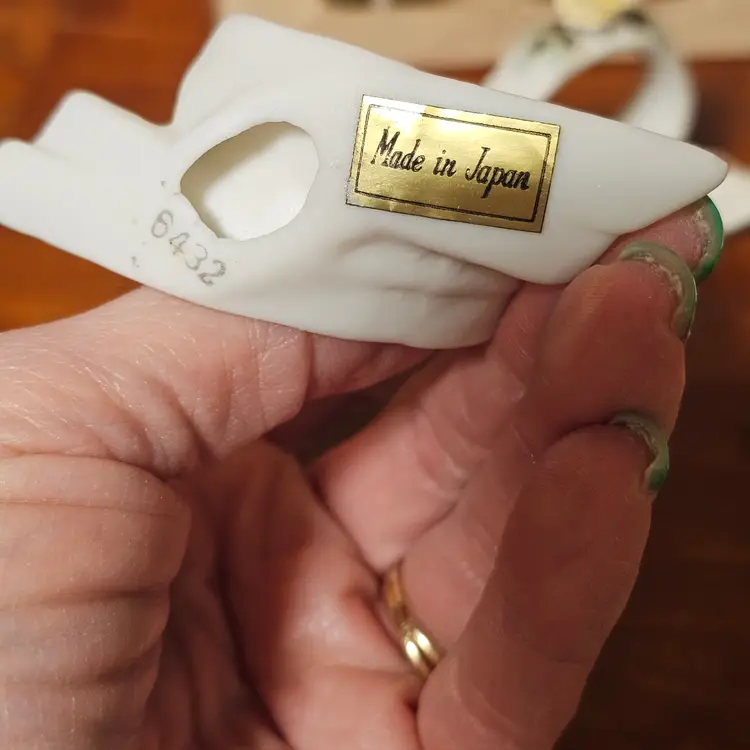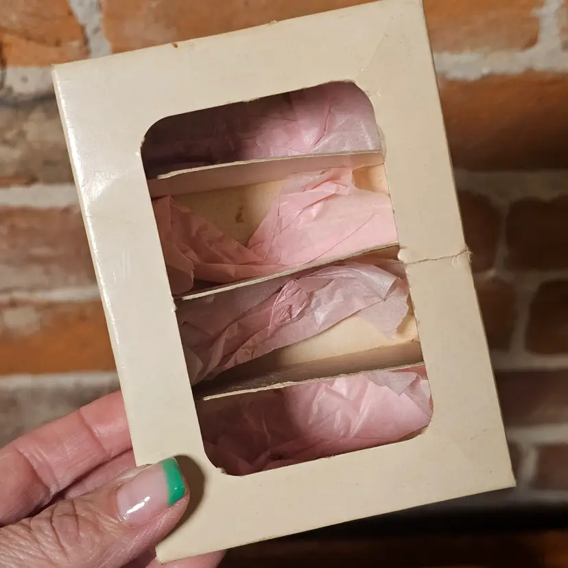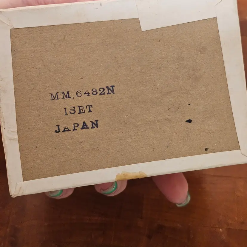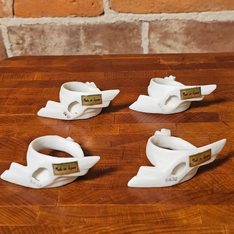 This complete set comes with the original box and features a soft matte bisque finish with elegant mid-century styling. Each ring is marked “Made in Japan” with model number 6432.