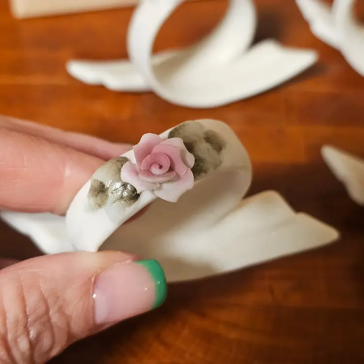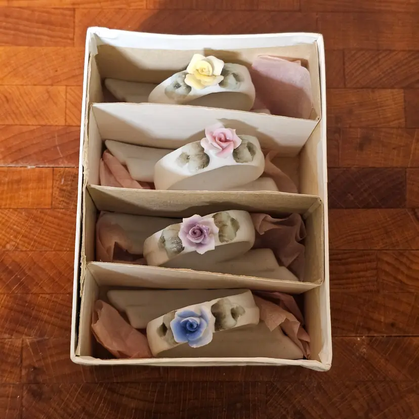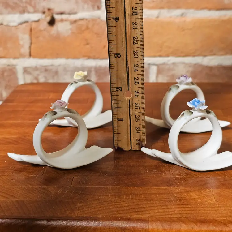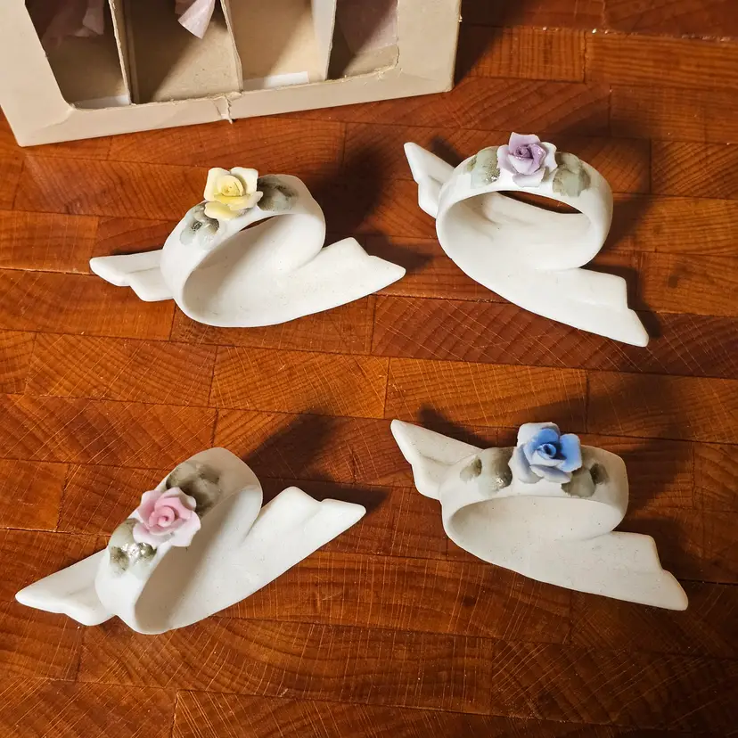 Beautiful vintage set of four bisque porcelain napkin rings made in Japan, each adorned with delicate hand-applied pastel roses in pink, yellow, blue, and lavender.