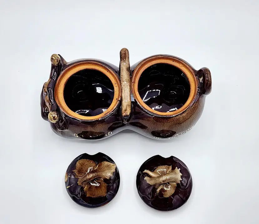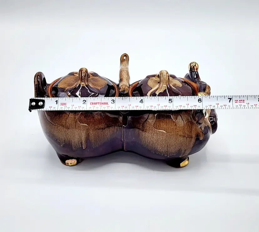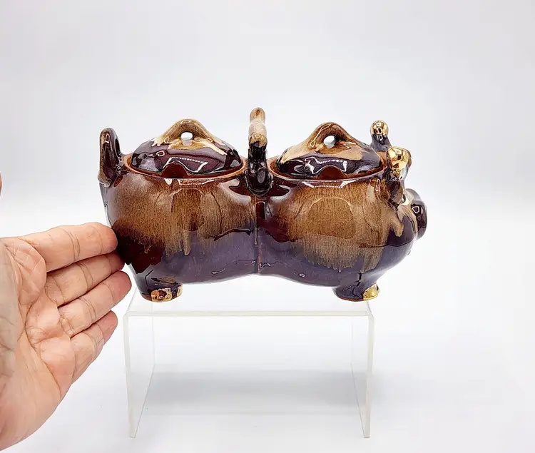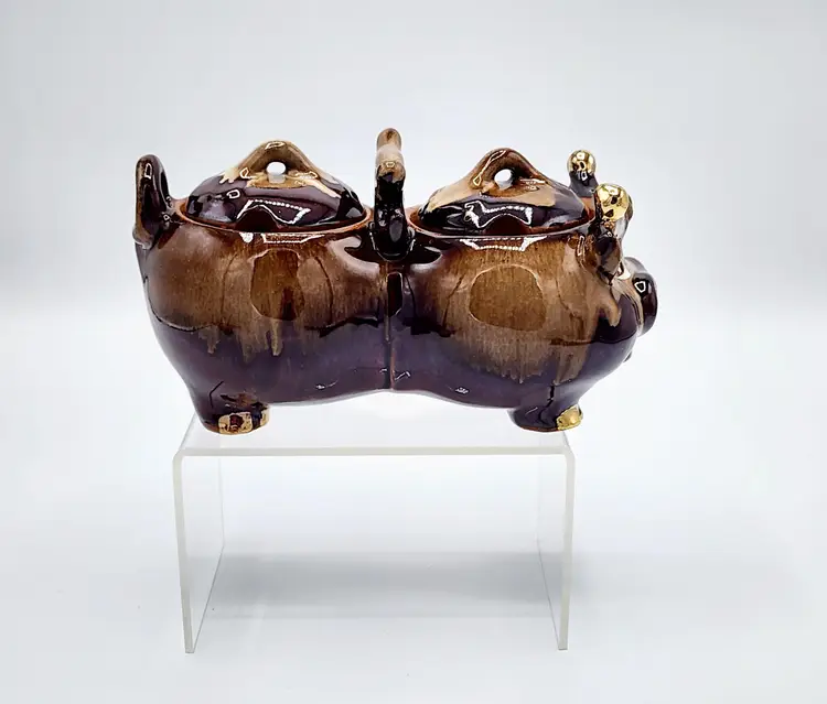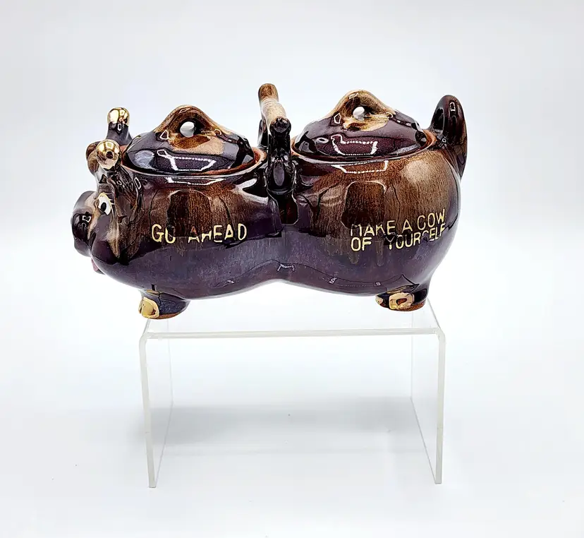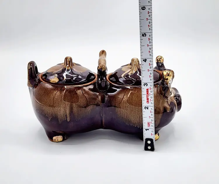 Highly glazed condiments jar set with lids, cow shapped. Redware. Condition: very good, no little spoons included. Measurements: 6 1/2" long, 3 1/2" tall.