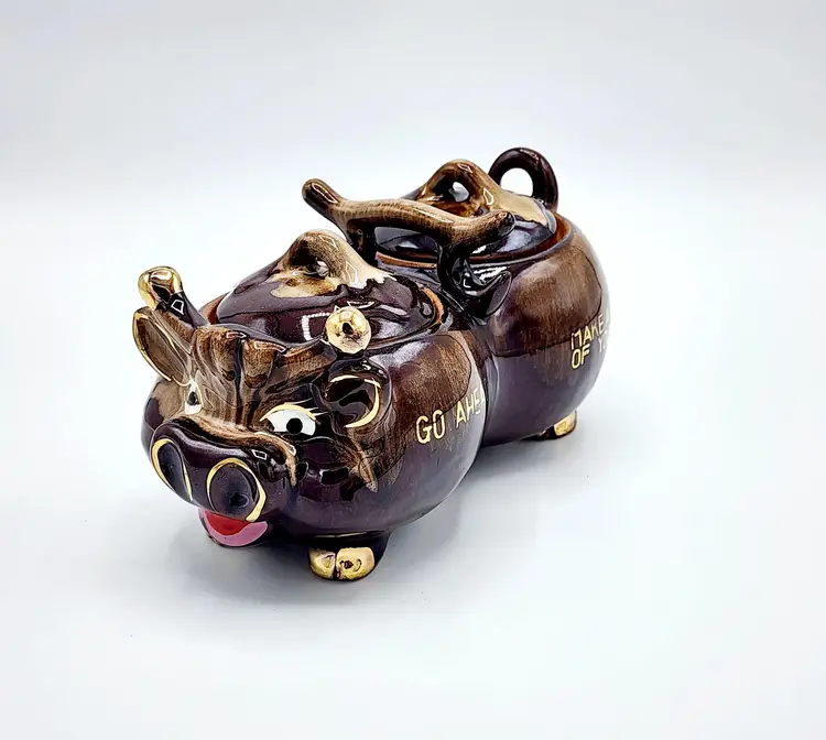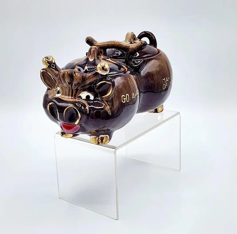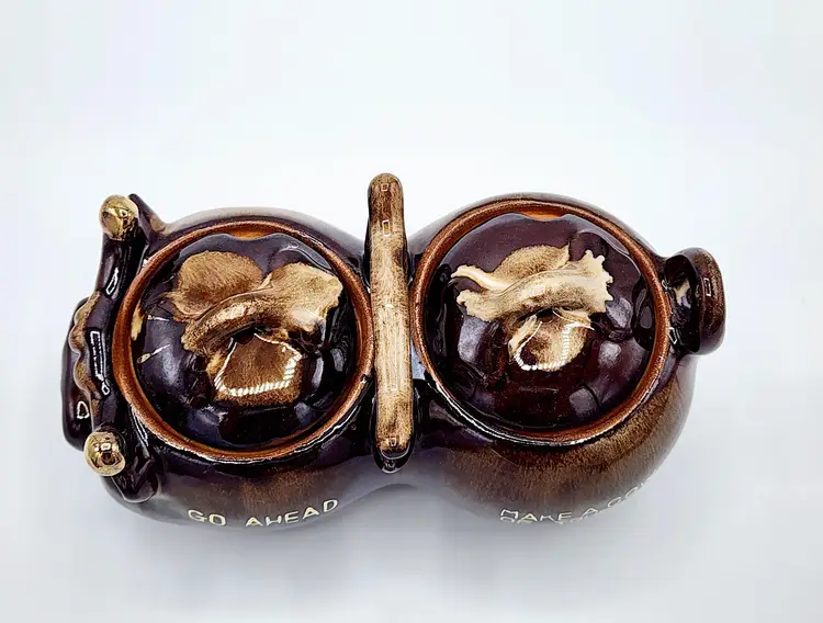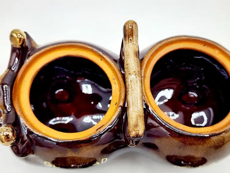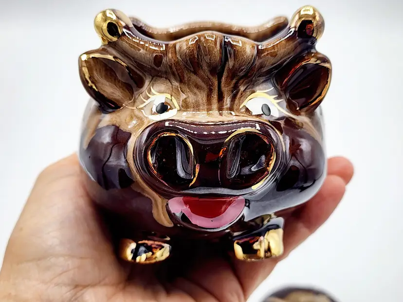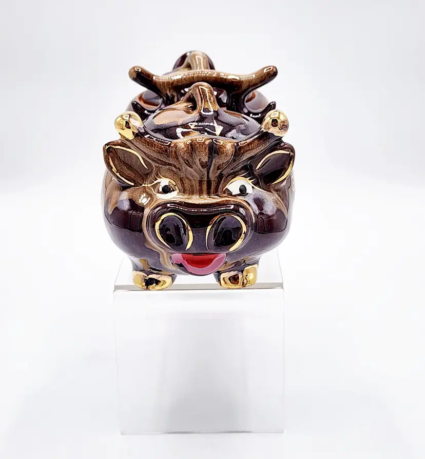 Highly glazed condiments jar set with lids, cow shapped. Redware. Condition: very good, no little spoons included. Measurements: 6 1/2" long, 3 1/2" tall.