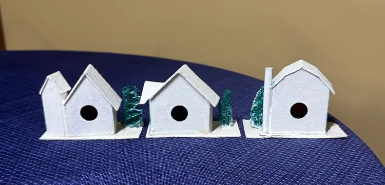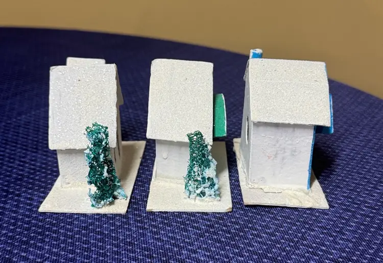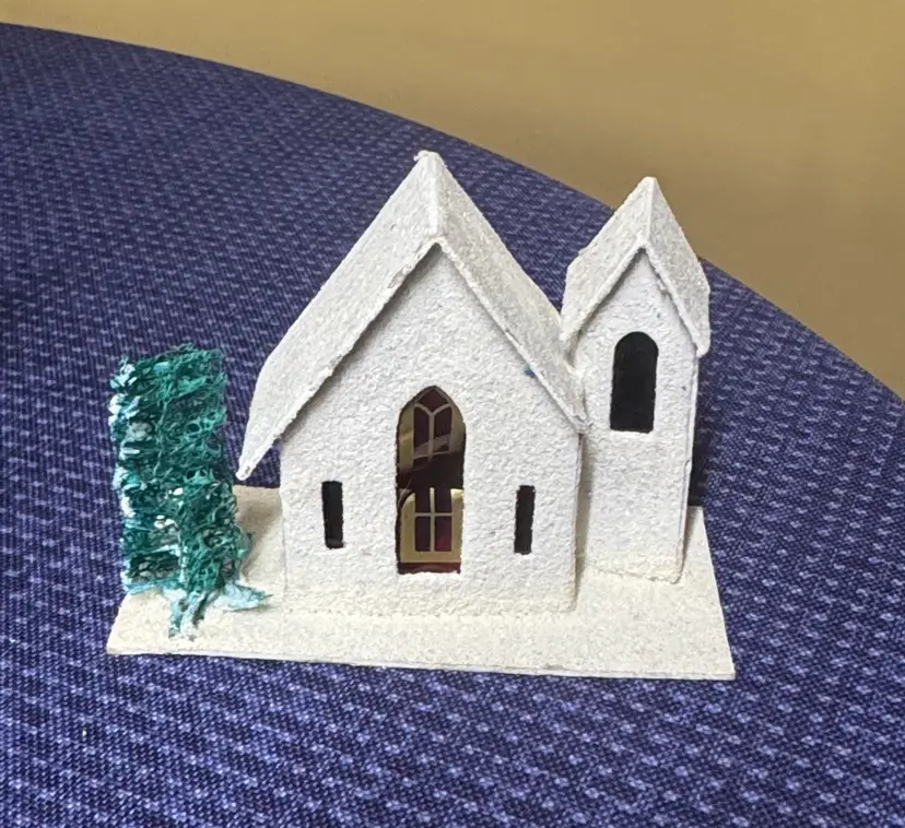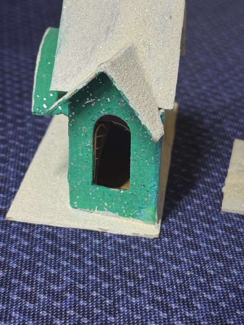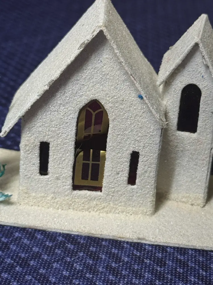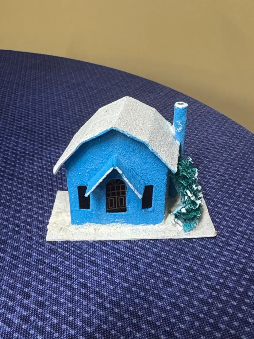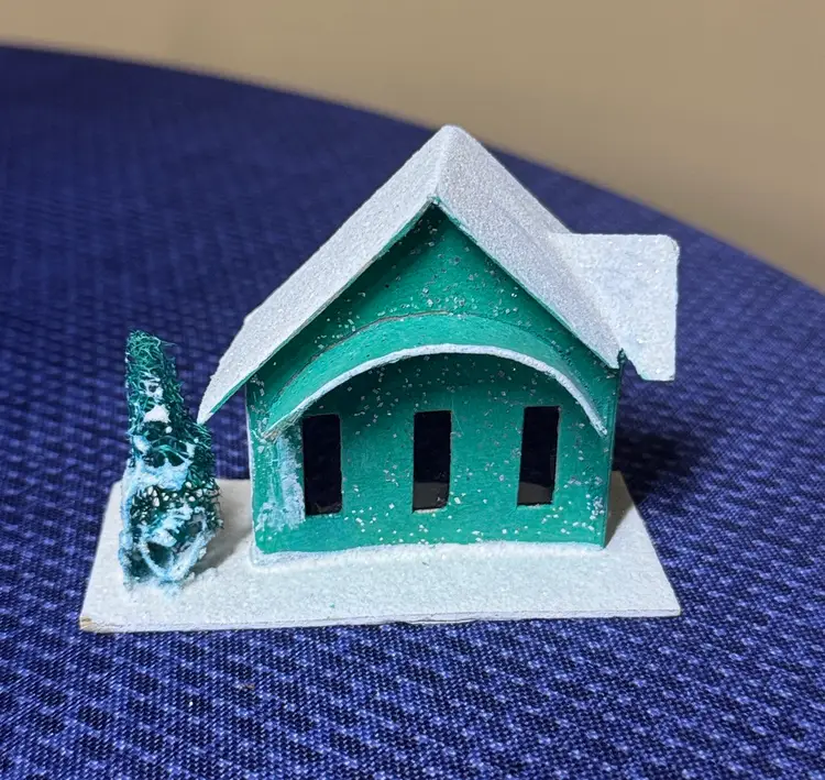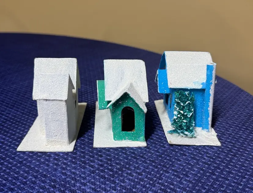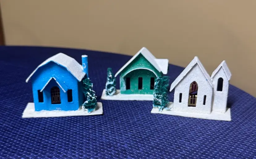 Putz Houses: These are miniature Christmas houses, typically made of cardboard and decorated with glitter and "snow". Origin: The tradition of Putz houses originated in Germany, where they were part of "putz" villages placed around Christmas trees. Features: They often feature intricate details, translucent windows that can be illuminated, and a charming, nostalgic aesthetic. Collecting: Vintage Putz houses are a popular collectible item and can be found at antique stores, estate sales, or online marketplaces. About 3” tall Create a festive atmosphere with this charming holiday village set. Featuring beautifully crafted blue and green houses, this set adds a touch of whimsy to your holiday decor. Perfect for creating a cozy and inviting scene. All are in excellent condition for their age the church has a torn front window and the green house has a torn side window (1008922253)