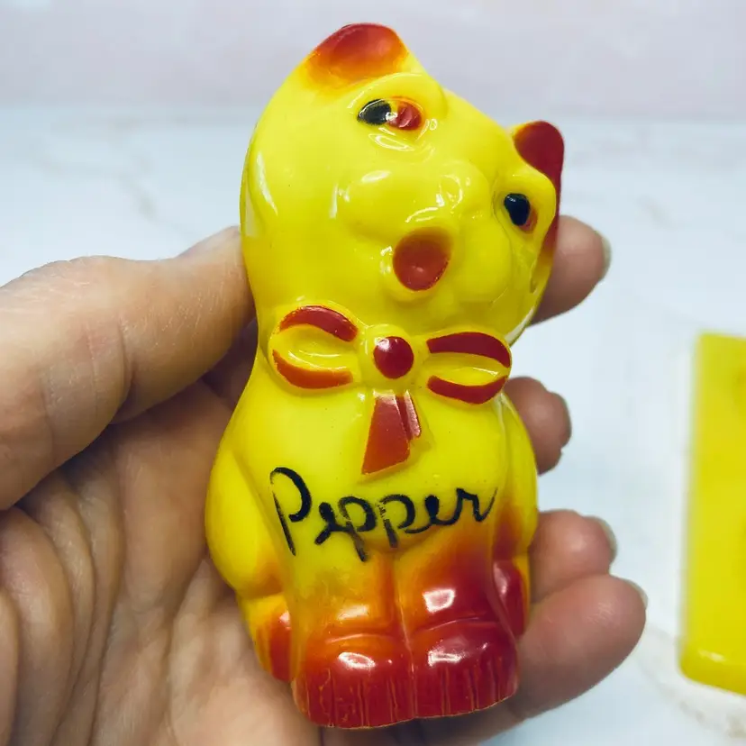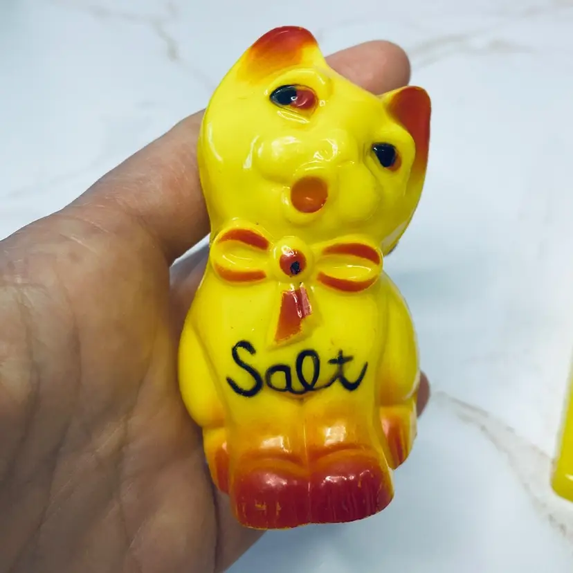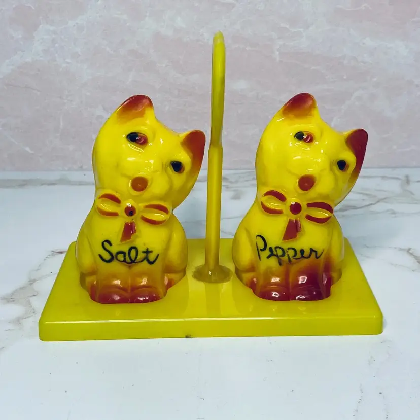Vintage Japan Hard Plastic Singing Cat Salt & Pepper Shaker Set w/Stand, Kitsch, Collectible, Keepsake.