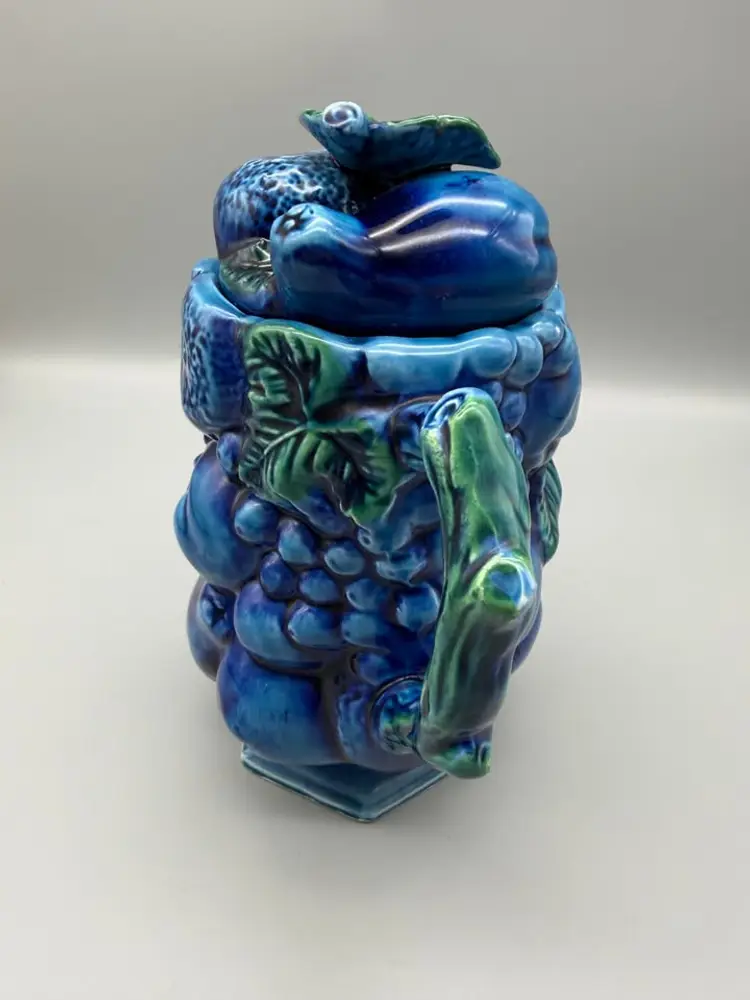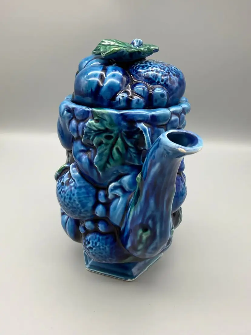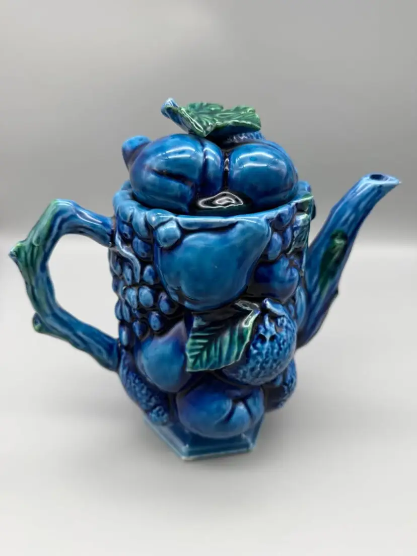 Overall Very Good Condition-One small chip on spout edge-Measures appx 8 1/4" Tall x 9" Wide Including Handle x 5" Depth E-2430 Fruit Design Blue Indigo Mood Tea or Coffee pot!