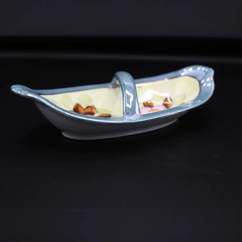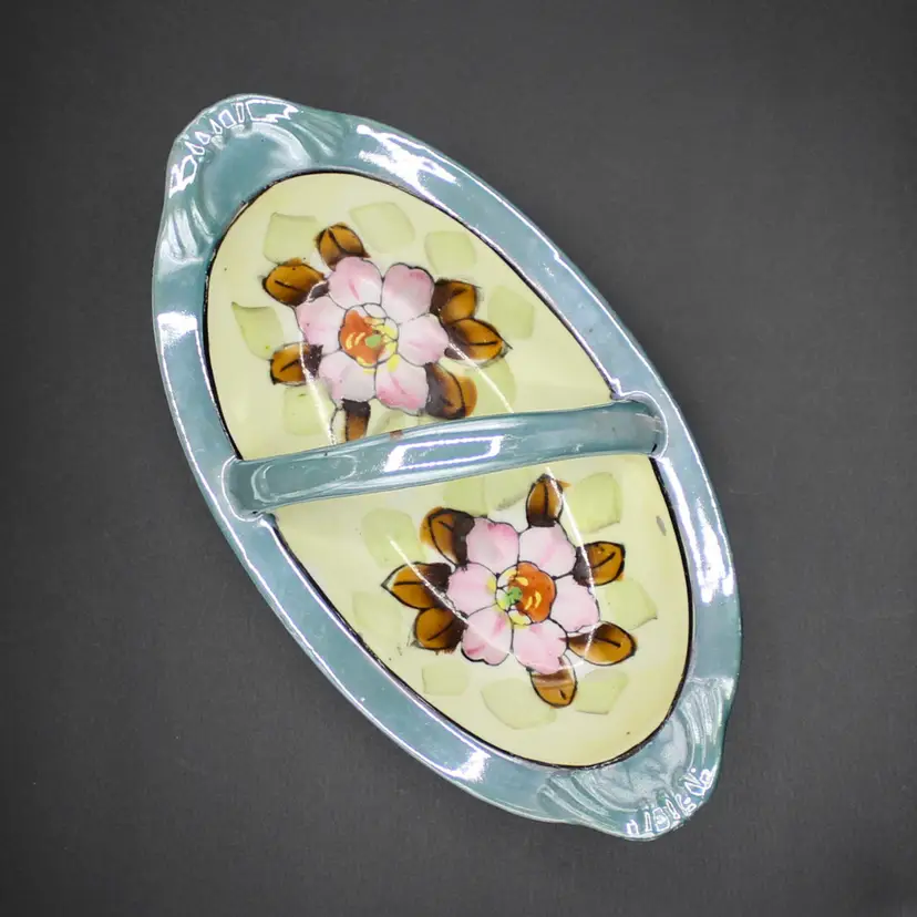 Vintage Japan Lusterware Divided Candy Dish, Hand Painted Floral Relish Tray with Handle, Iridescent Trinket Dish, 1940s 1950s Decor