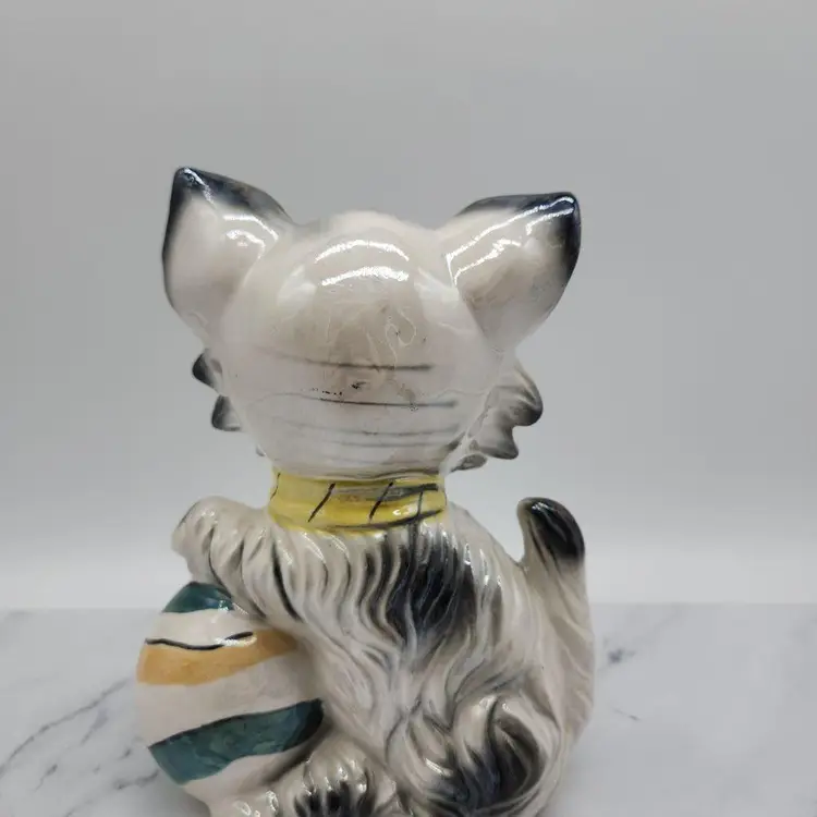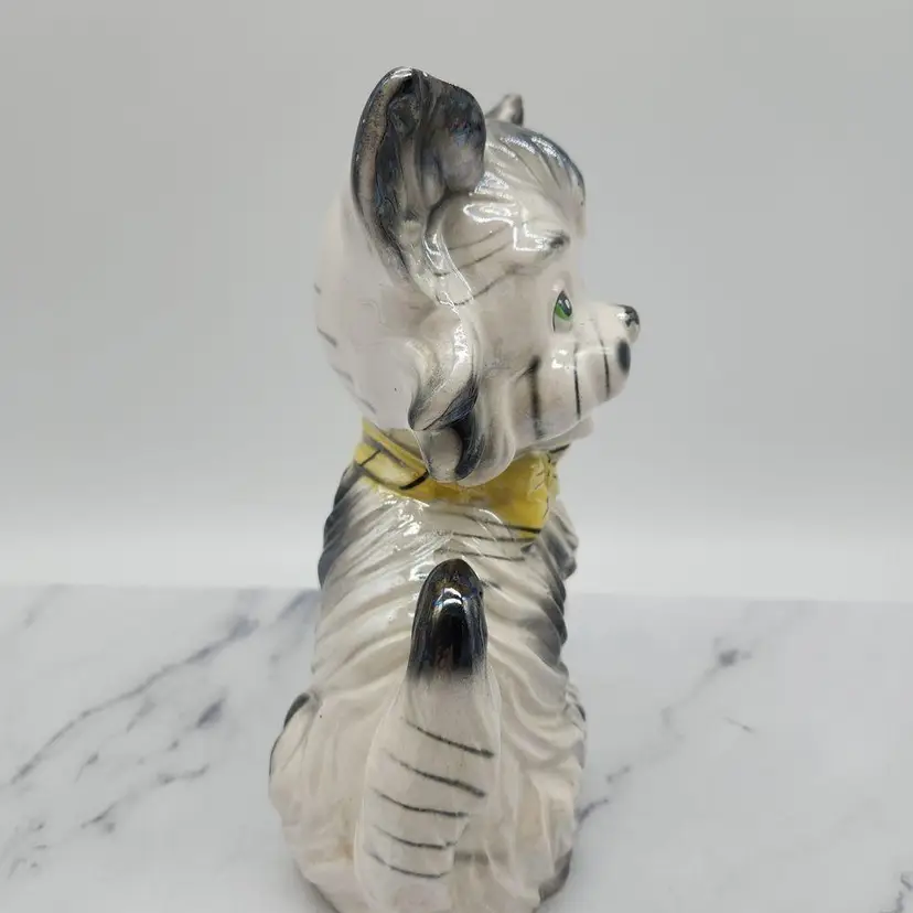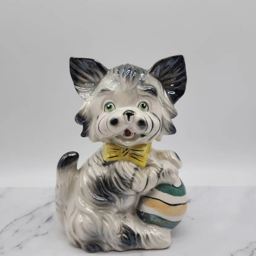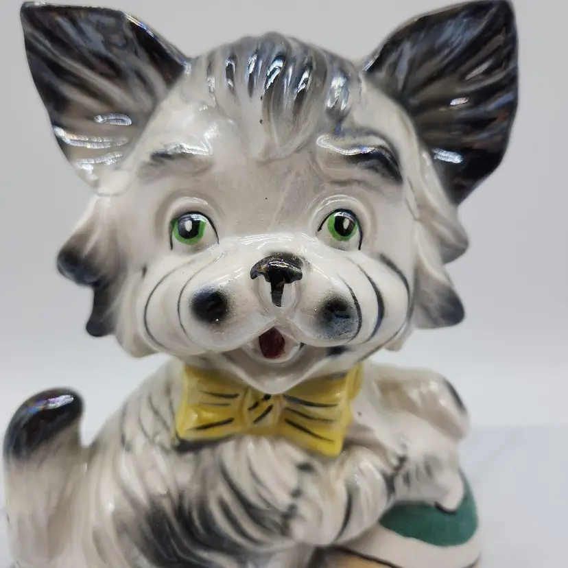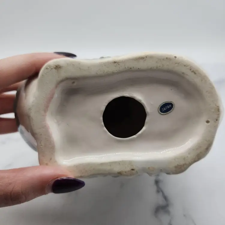 This kitschy figurine measures 7.5”h X 6” W and has a beautiful lusterware glaze. No chips or cracks. In great vintage condition.