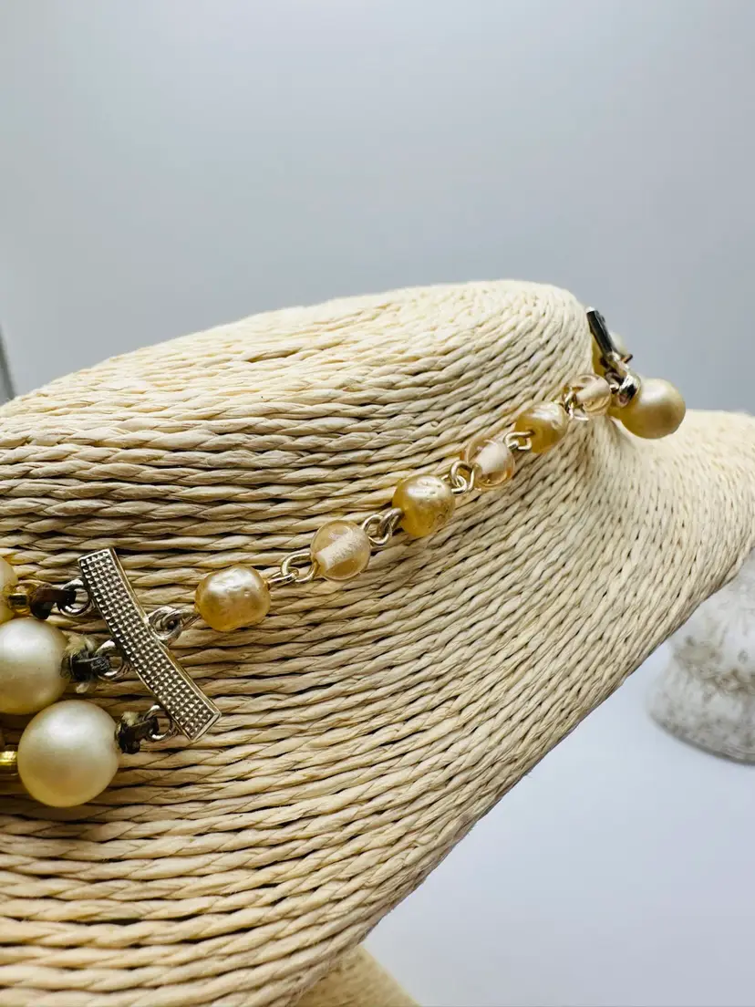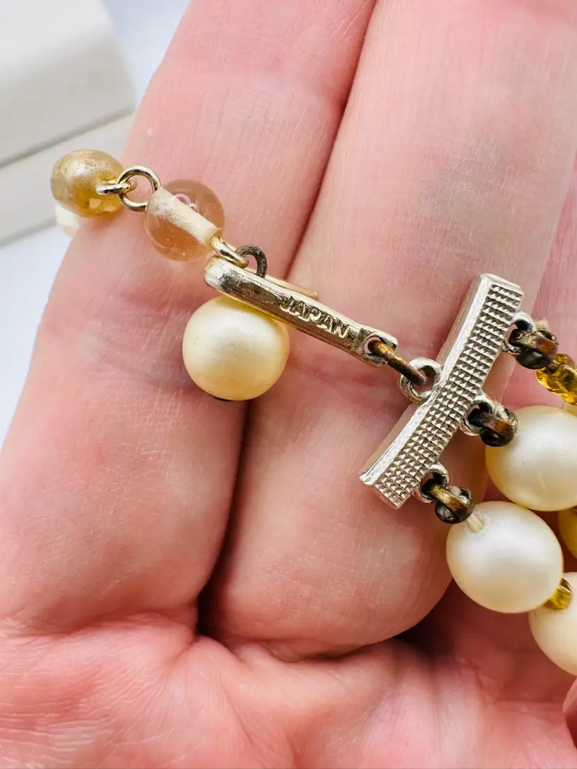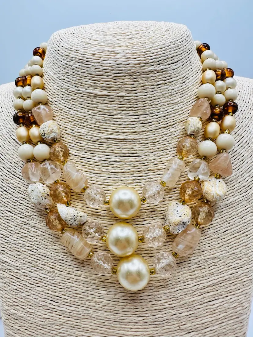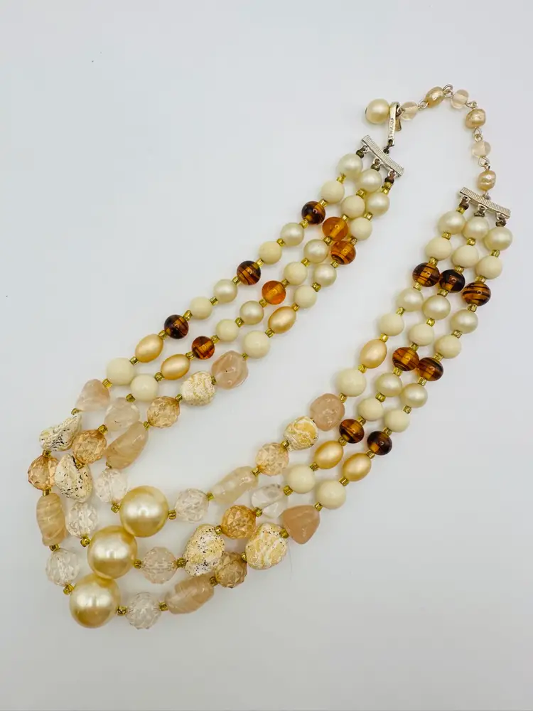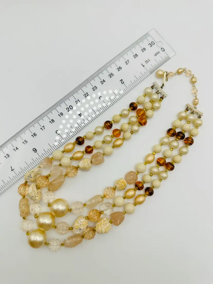 The Vintage Japan Multi Mix Glass & Stone 3 Strand Necklace is a unique and stylish piece of jewelry from the 1950s. This original beaded necklace features a multicolor design with glass and stone materials, making it a standout accessory for any fashion-forward individual. With a vintage flair and a length of 14-16 inches, this necklace is sure to add a touch of charm and nostalgia to any outfit.