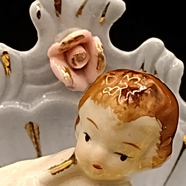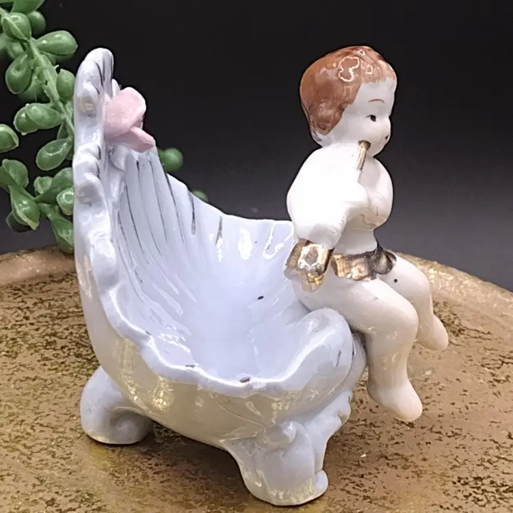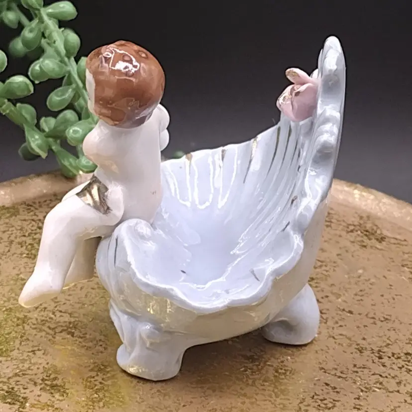This vintage porcelain dish from Japan features a charming cherub sitting atop a vibrant blue clamshell. The glossy finish and intricate detailing make it an ideal addition to any room, including the entryway, bathroom, bedroom, or dining room. The small size and lightweight design make it easy to display or use for practical purposes. Perfect for collectors, this mid-20th century piece is an original and not a reproduction. It has a handmade quality and comes unboxed, adding to its unique charm. The dish is versatile and can be used for any occasion or theme, making it a great gift for any collector or lover of vintage decor.
