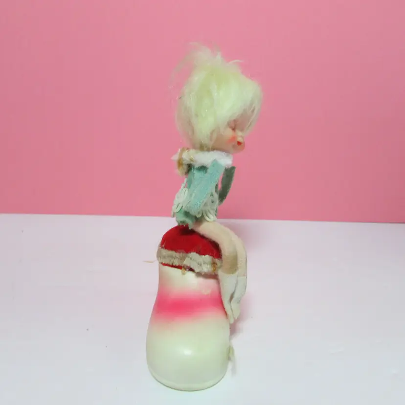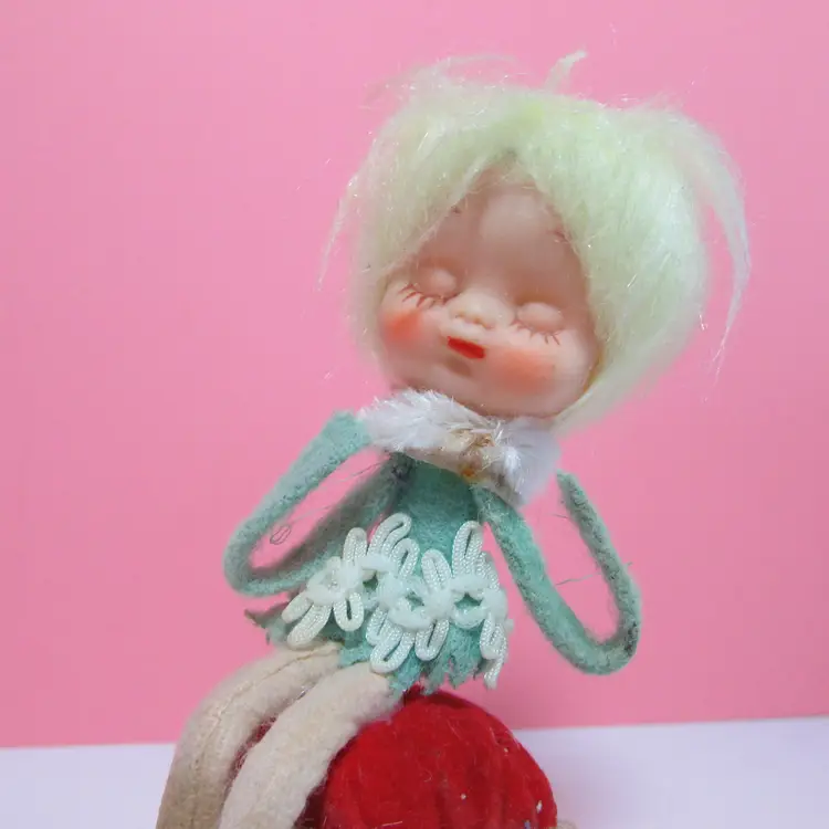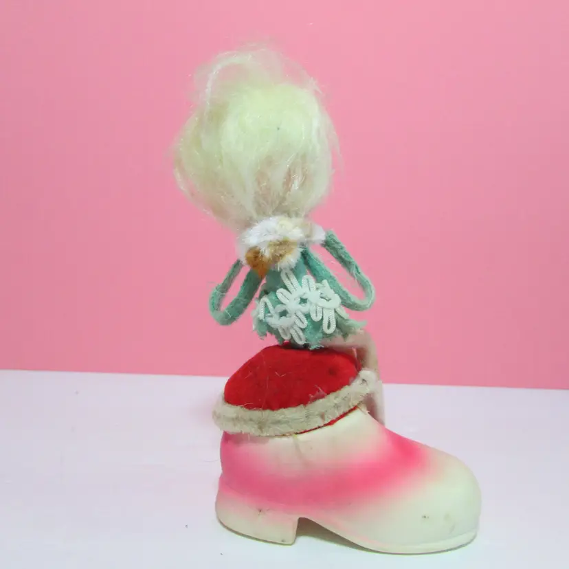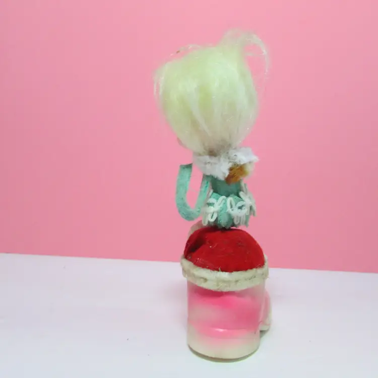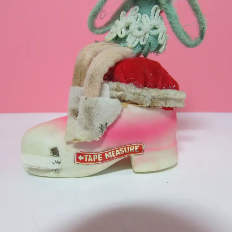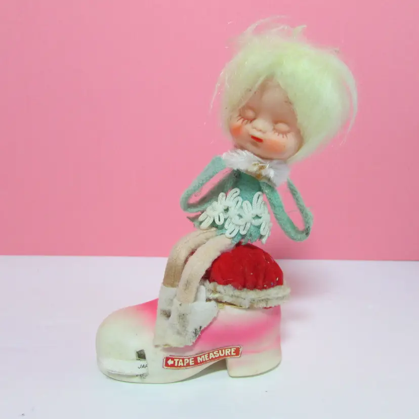 This adorable figure has some wear and stains. Her shoes and pipecleaners have stains, the tape measure does not retract. Still a cute piece to display. She is about 5" x 3" x 1 1/2". This is shipped from a smoke free home. Thanks for looking!