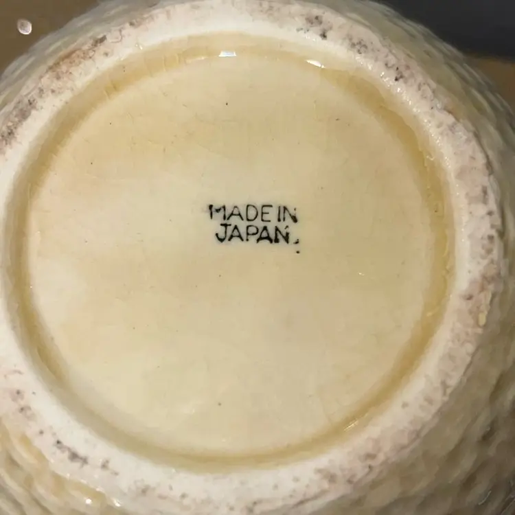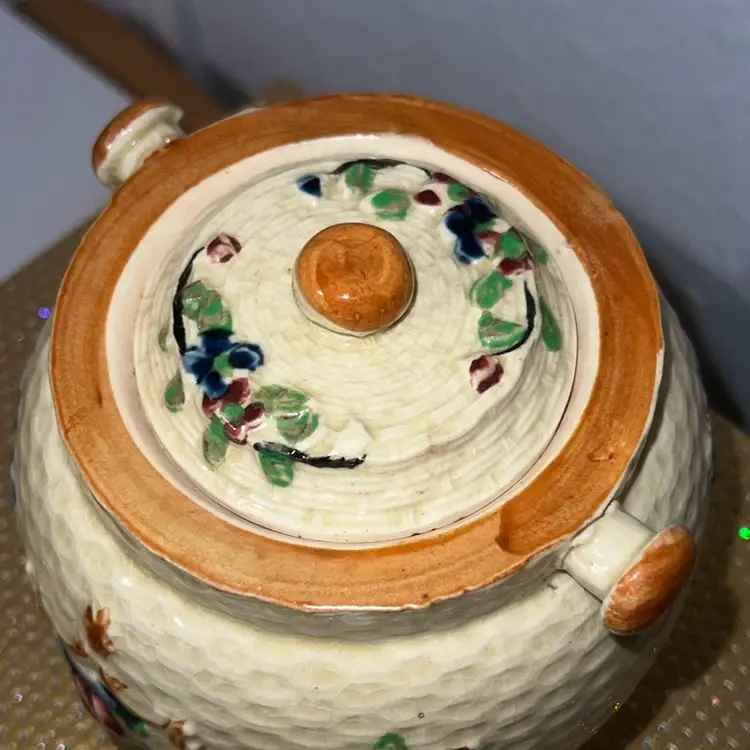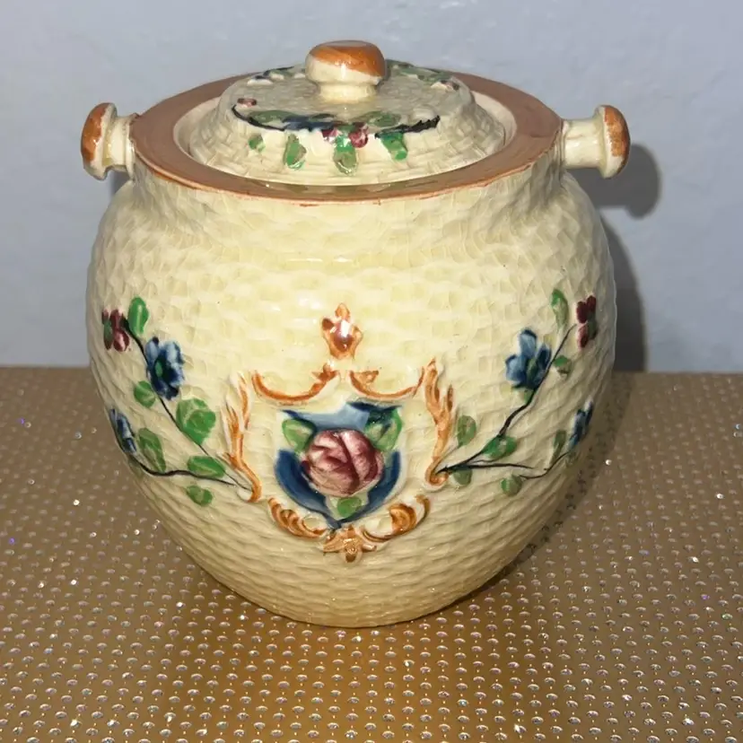 Floral basket weave pattern. Missing rattan handle. Stands approx 6" tall. No chips or cracks. Hand painted.