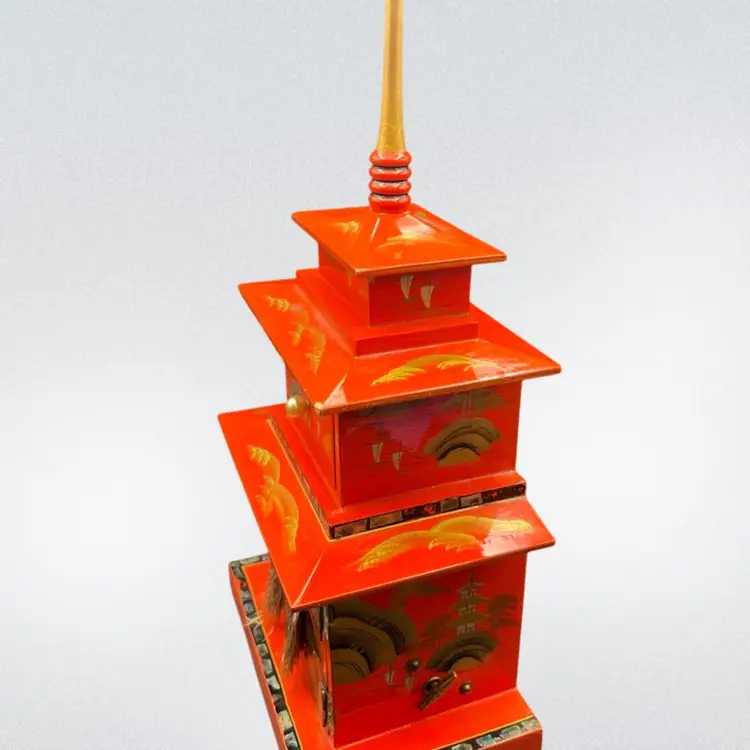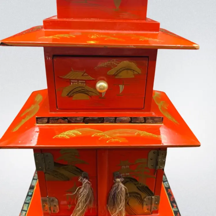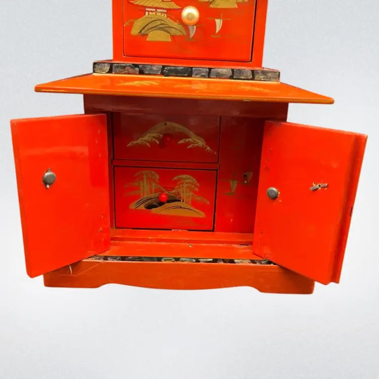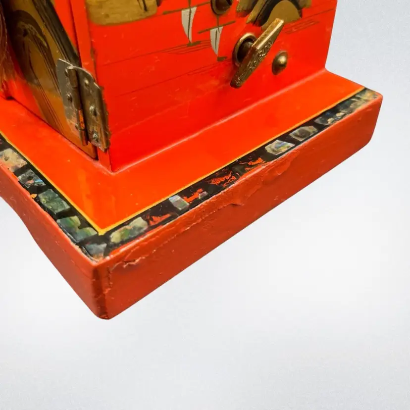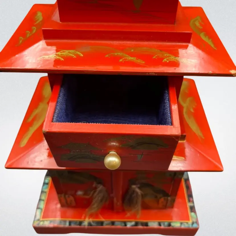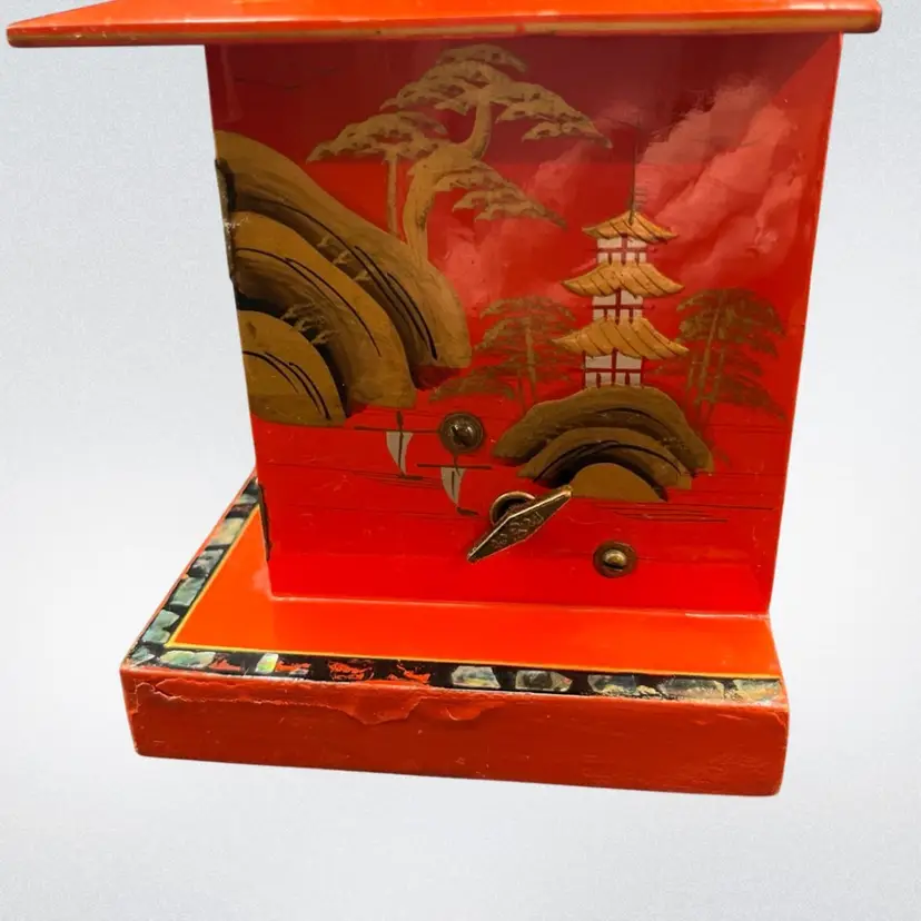 Features: • Pagoda-tiered design • Red lacquer finish • Gold hand-painted scenery • Abalone/MOP inlay accents • Upper drawer + lower double doors • Original tassels and hardware . Music plays well • Approx. size: with finial 17”x5”x 8” • Vintage condition with light wear consistent with age