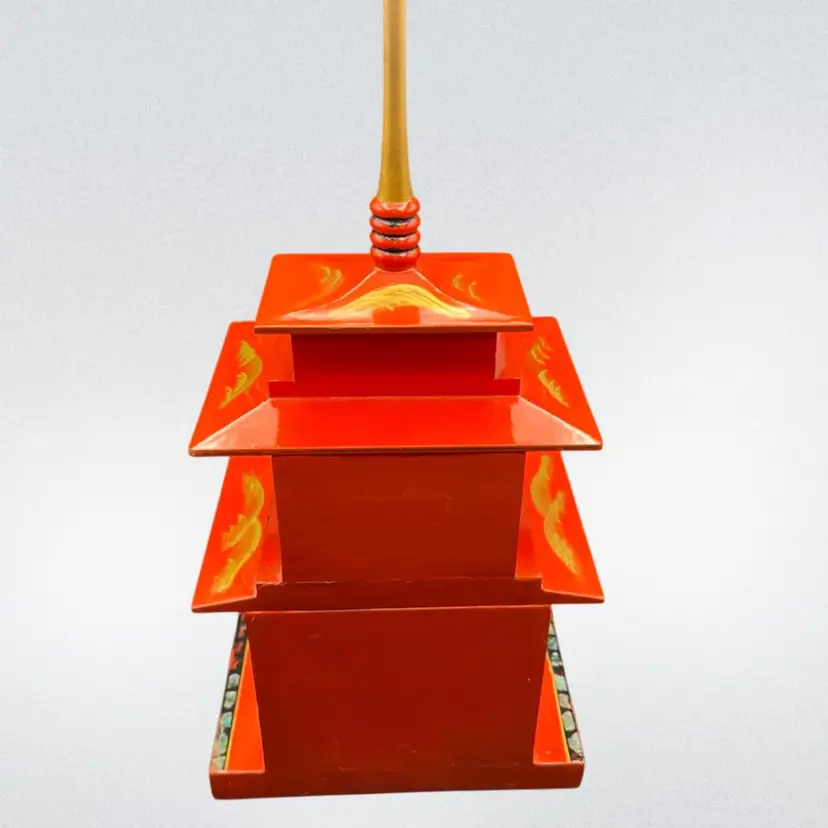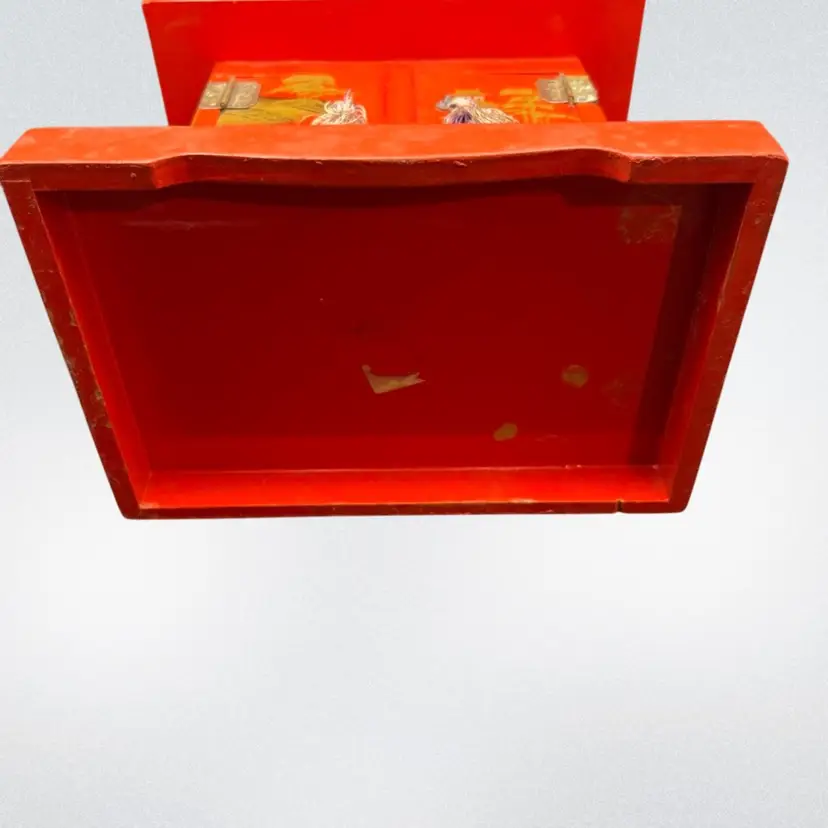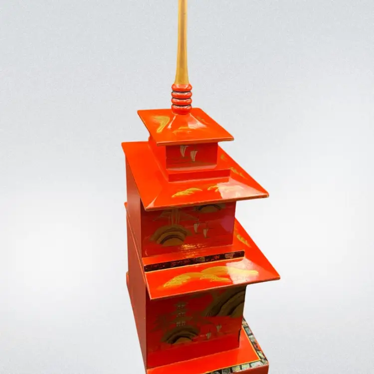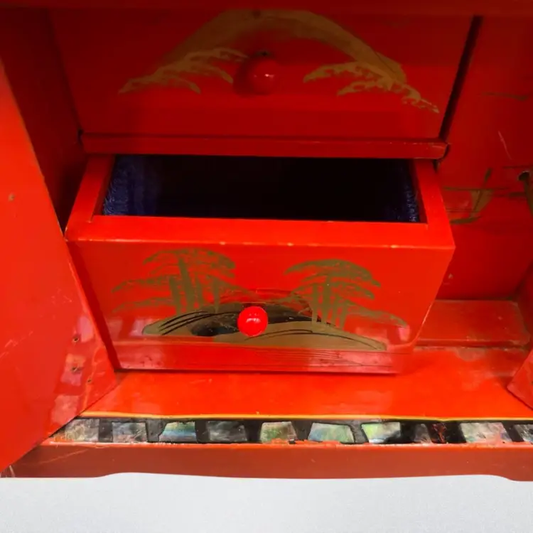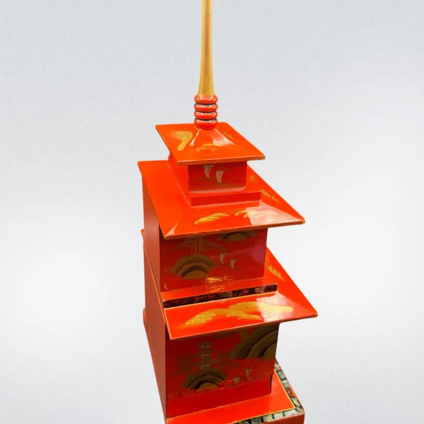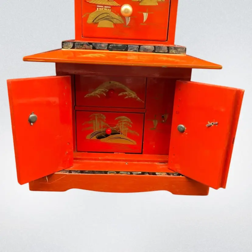 Features: • Pagoda-tiered design • Red lacquer finish • Gold hand-painted scenery • Abalone/MOP inlay accents • Upper drawer + lower double doors • Original tassels and hardware . Music plays well • Approx. size: with finial 17”x5”x 8” • Vintage condition with light wear consistent with age