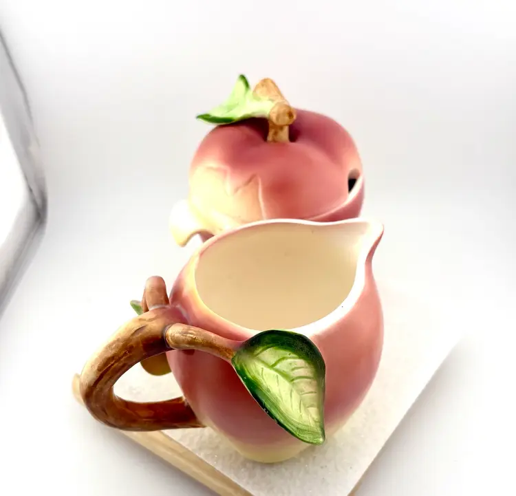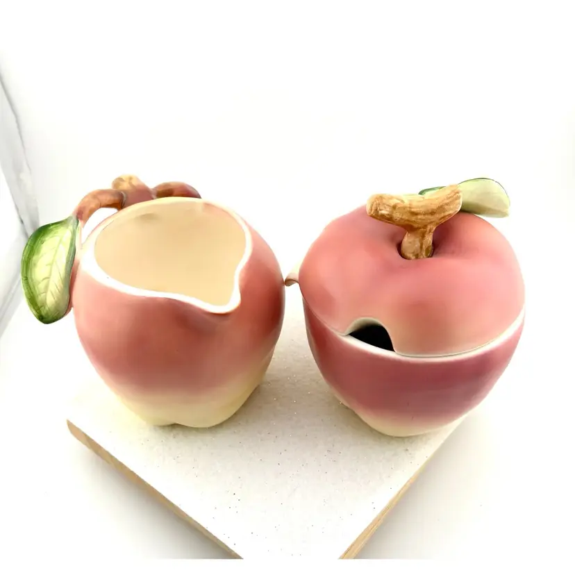 This set goes with the salt & pepper set in my store. The creamer measures 3.75” Tall x 5.5” wide. There are stickers on the bottom that say Japan but I do not know the maker. There is a flea bite on the leaf of the sugar lid. There are no chips or cracks.