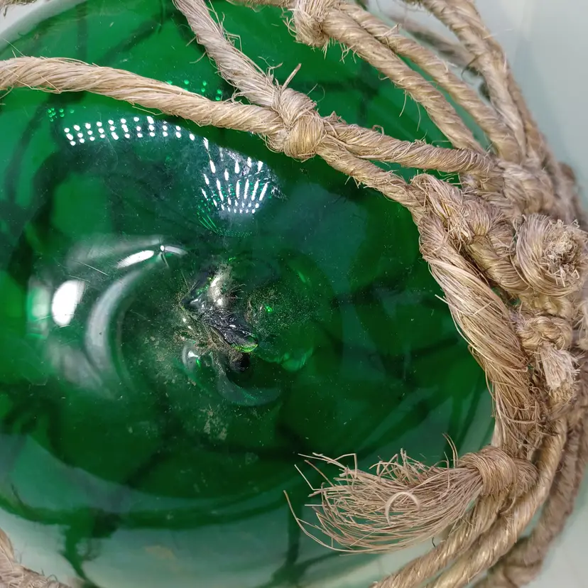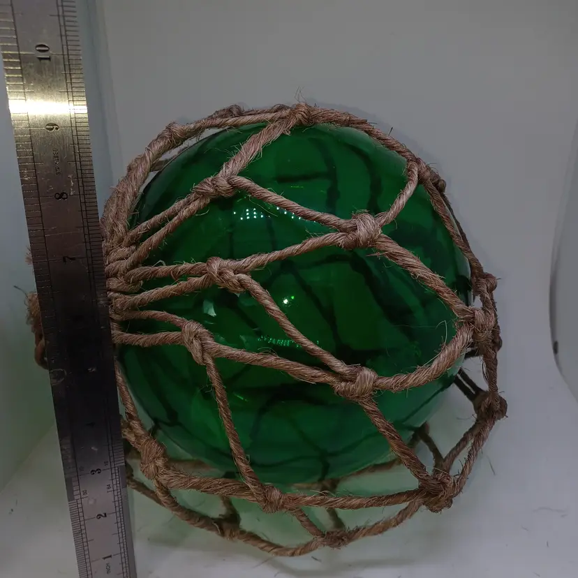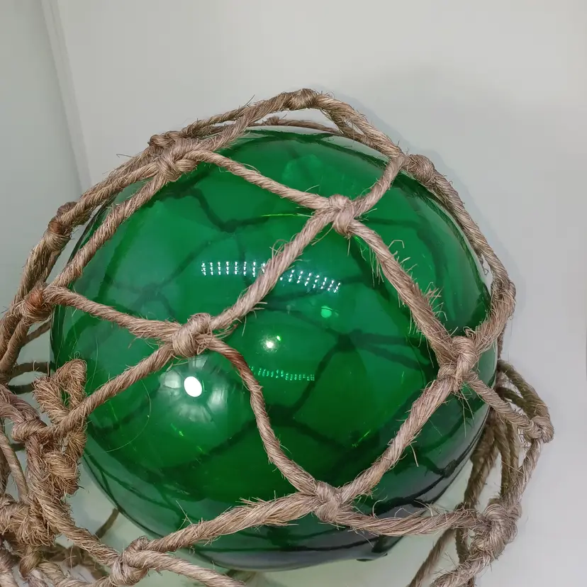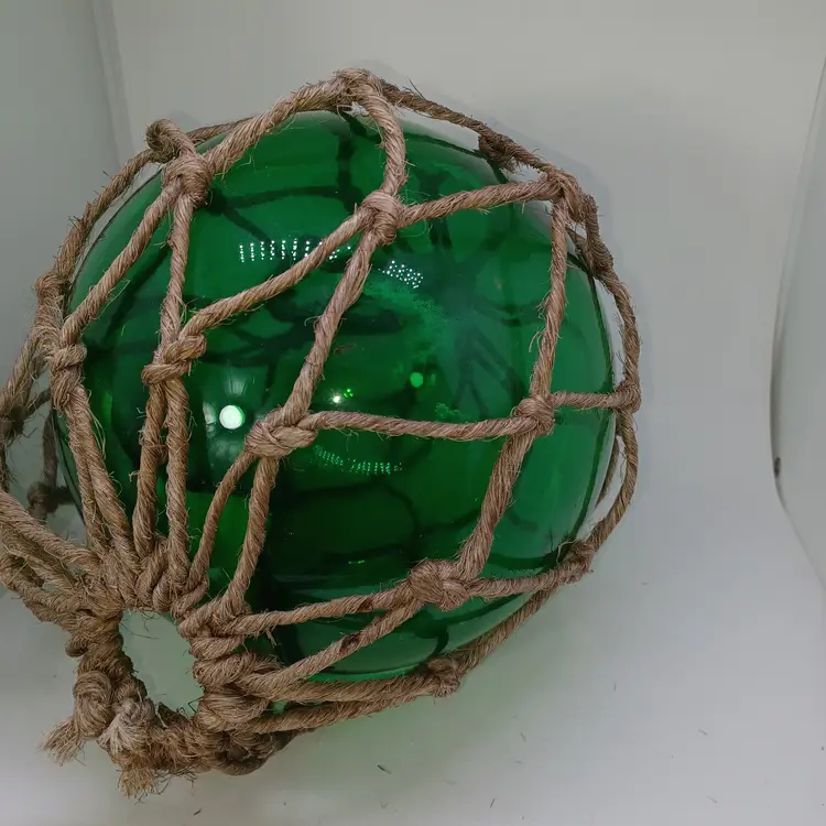 Vintage Japanese Blown Glass Green Fishing Buoy Jute Rope 9 in In good vintage condition the jute rope does have a few holes Etc but the glass has no cracks some discoloration to the inside but that is to be expected from a piece that is this old please see all pictures as they are the best description all items from a smoke-free home with pets experienced fragile shipper