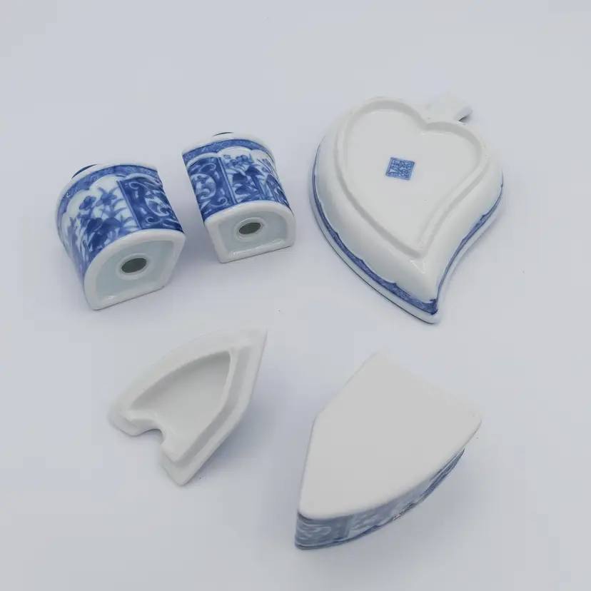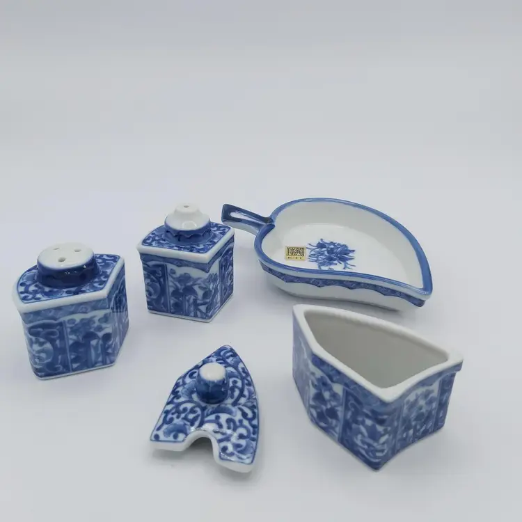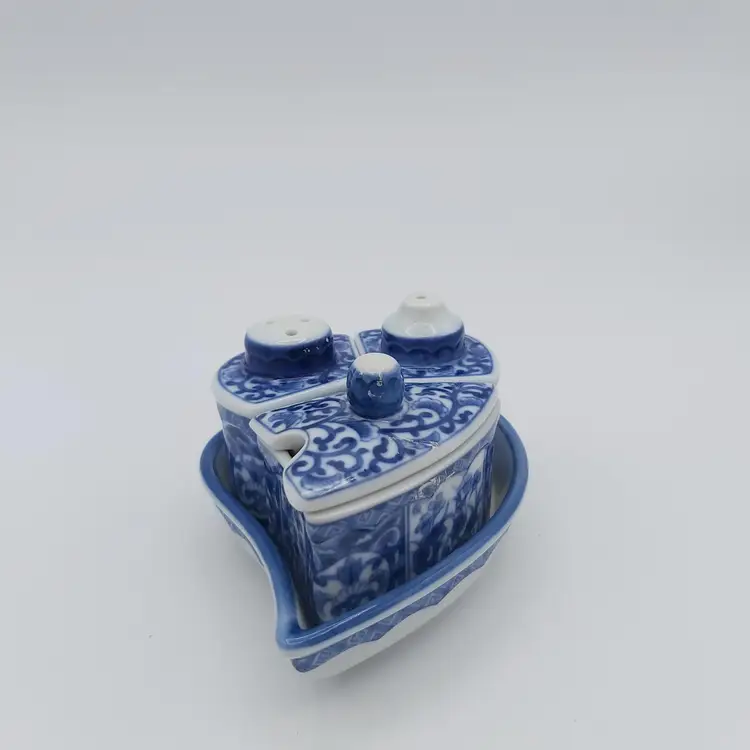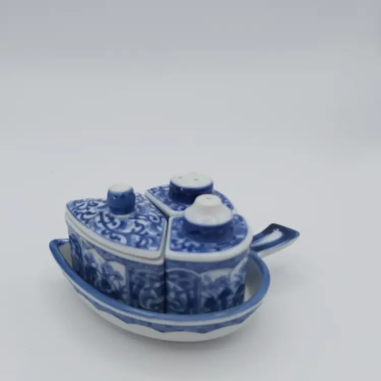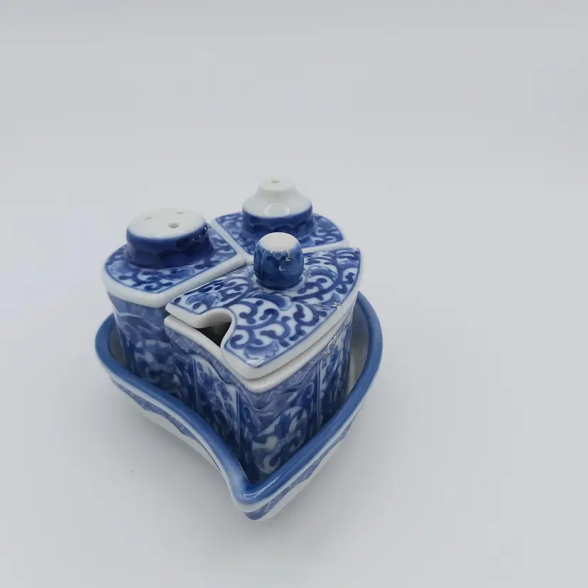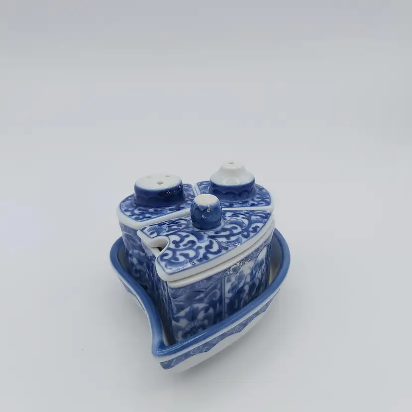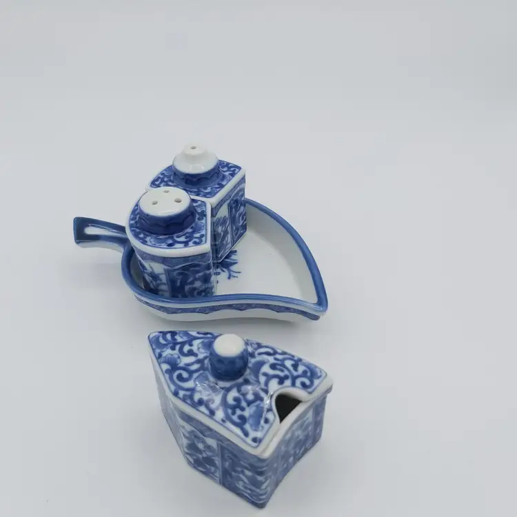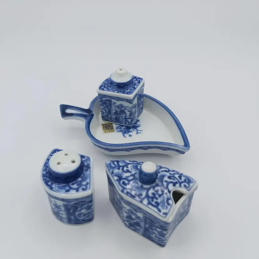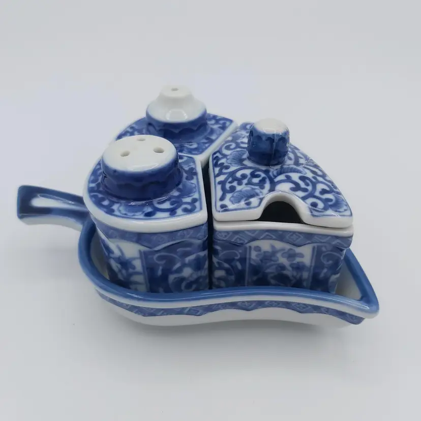 All pieces nestle inside the leaf shaped tray. Includes salt, pepper and jam/sugar/mustard jar/pot. Darling little set. Love how everything fits in together. Excellent Used Condition. See pictures for details. Measures approx 5.5" long x 3.5" wide tray x 2.85" high when all pieces in place.