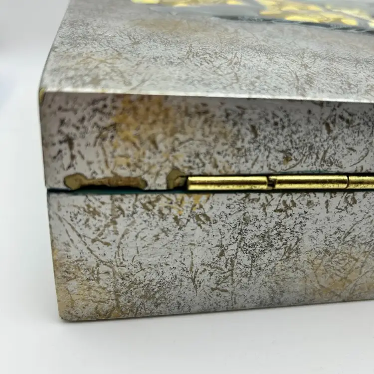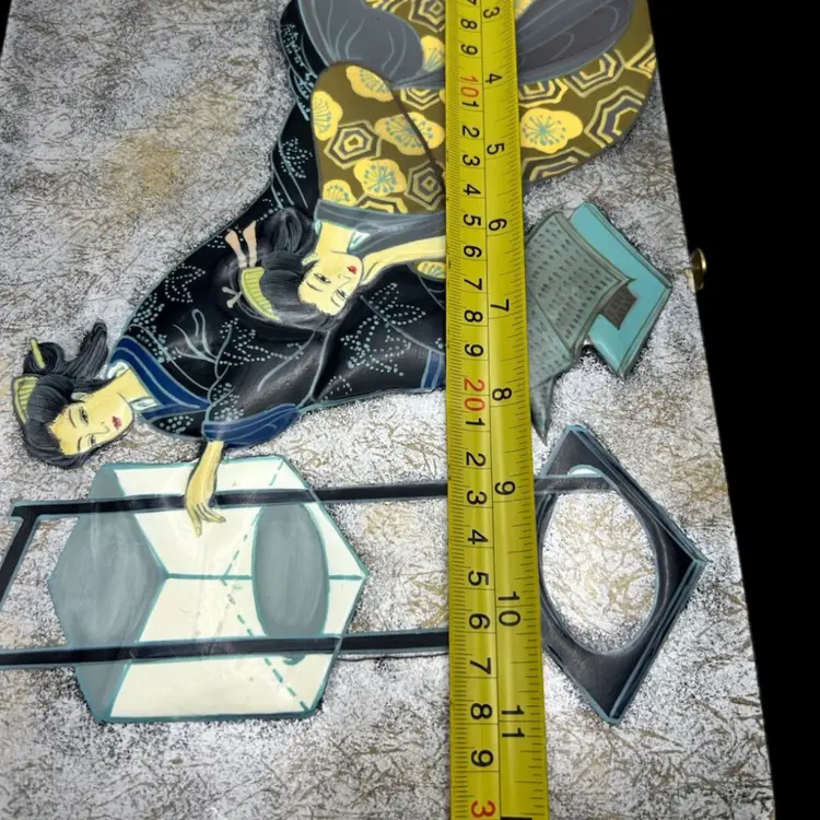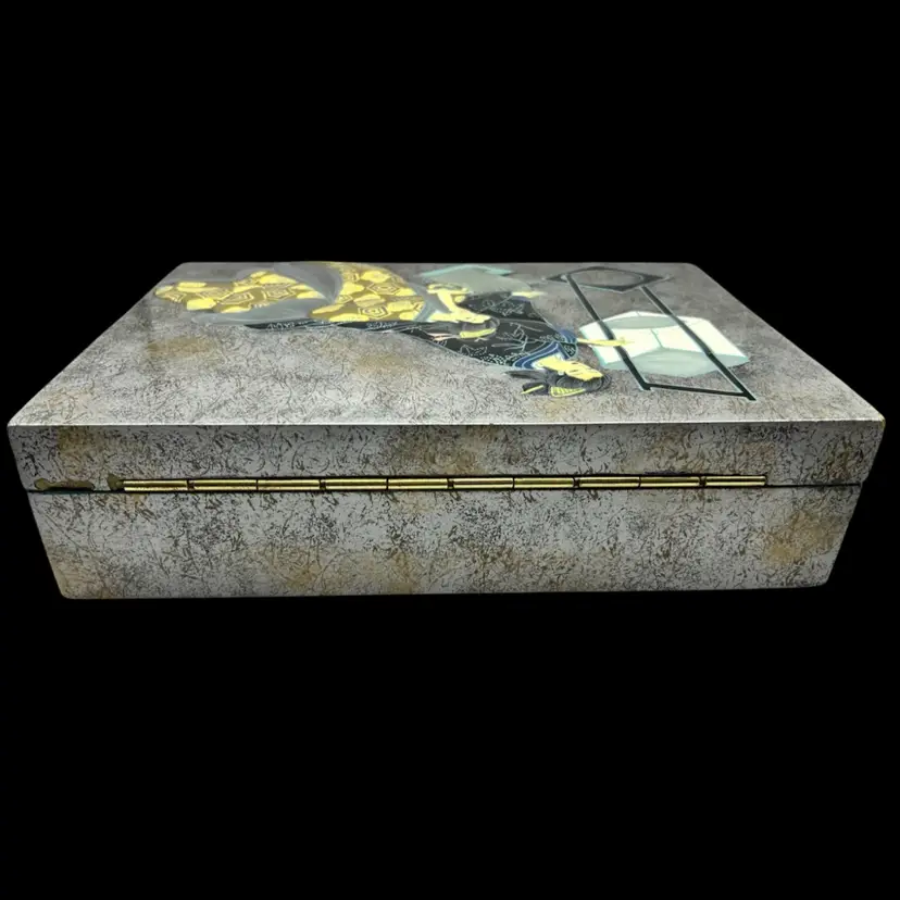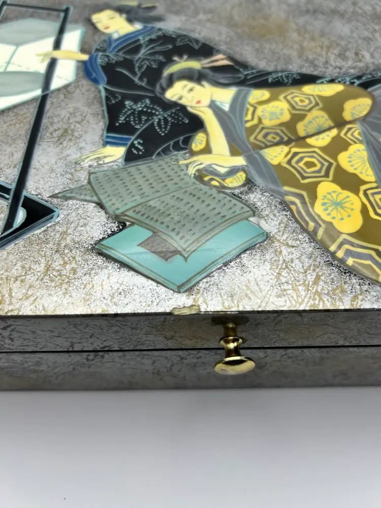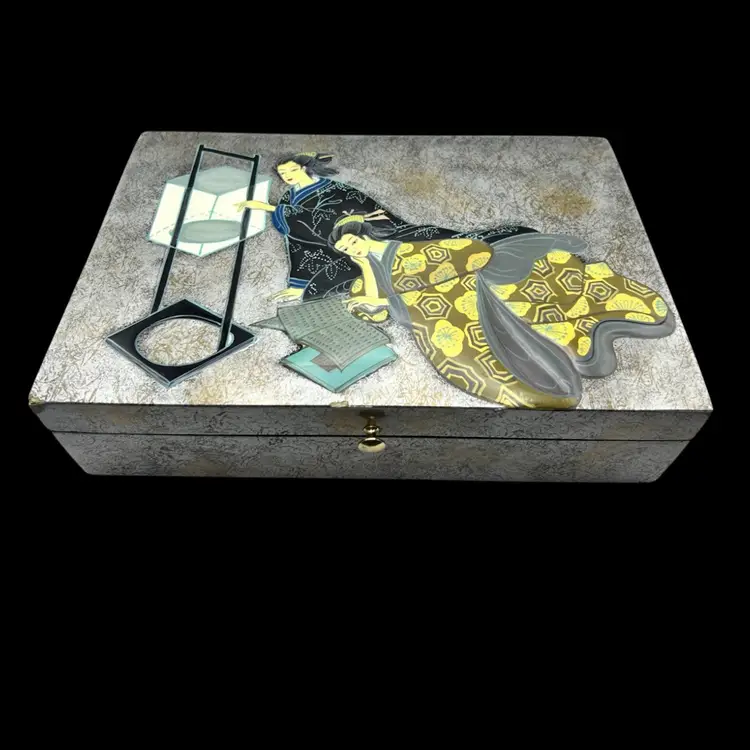 Wooden jewelry box featuring an enameled image on the hinged lid depicting two Japanese women relaxing near a lamp.