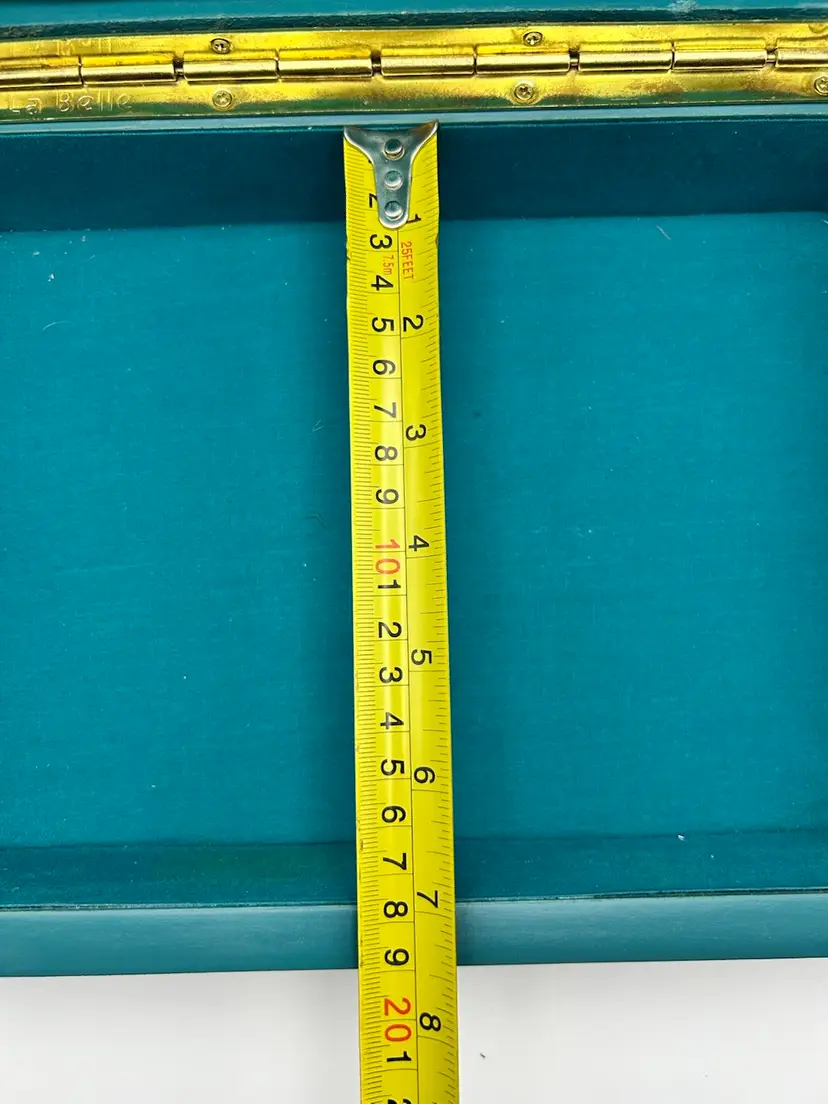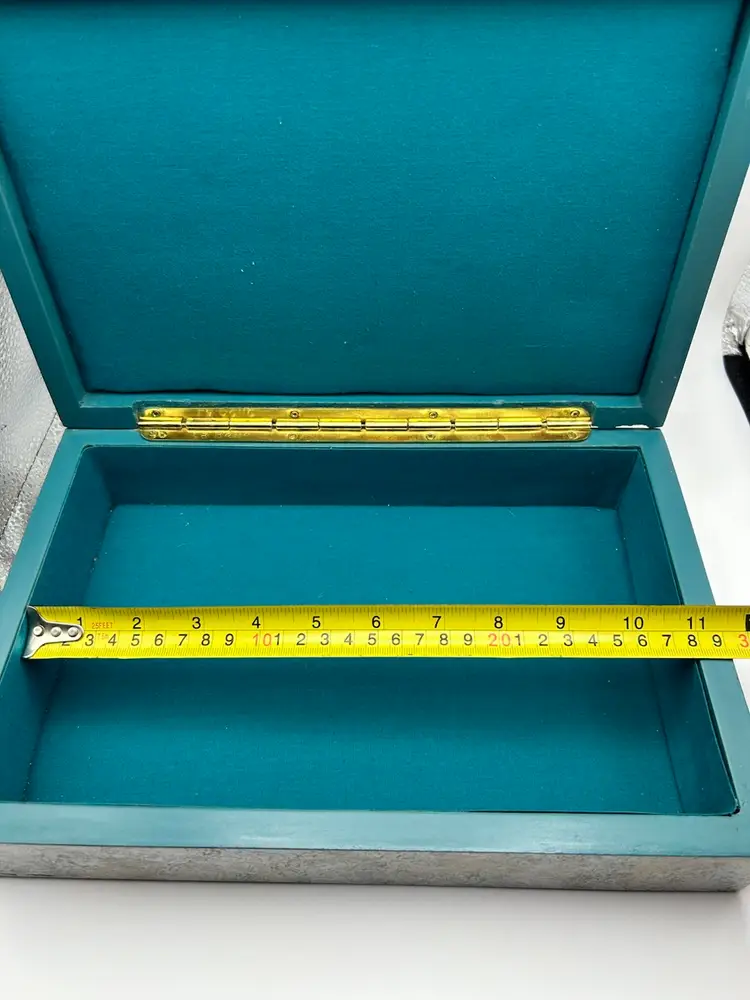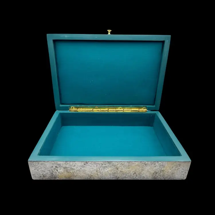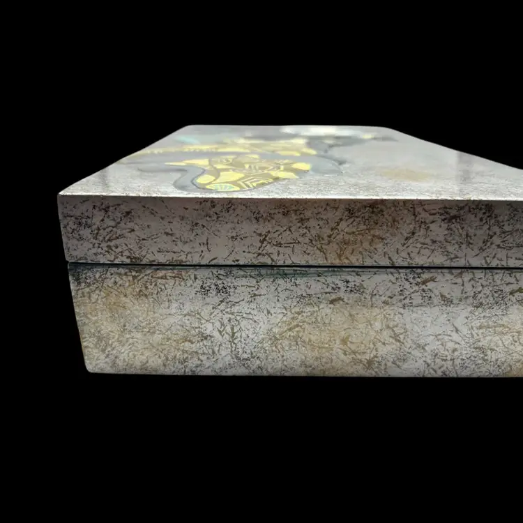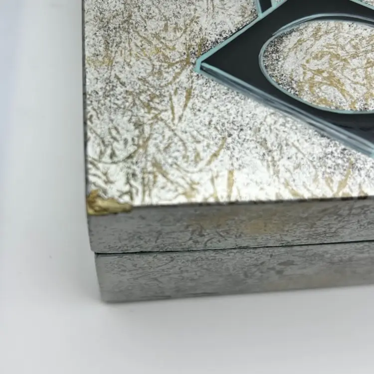 Wooden jewelry box featuring an enameled image on the hinged lid depicting two Japanese women relaxing near a lamp.
