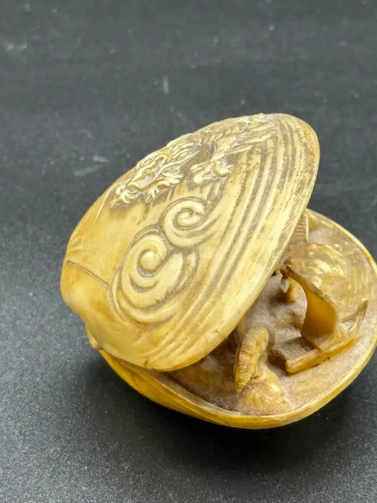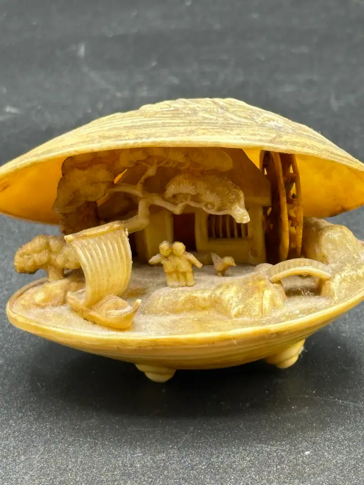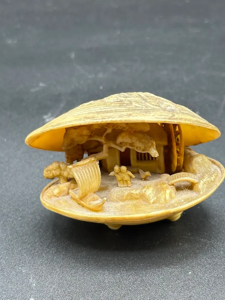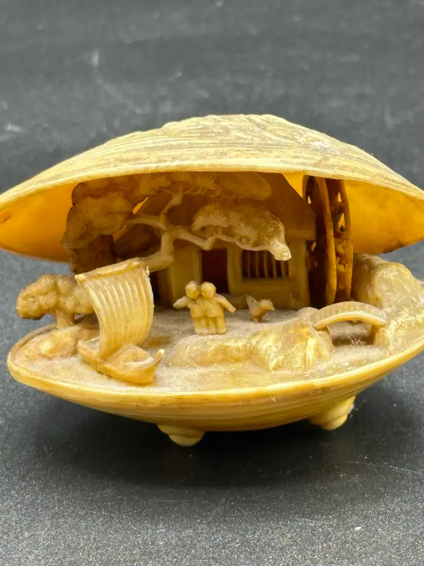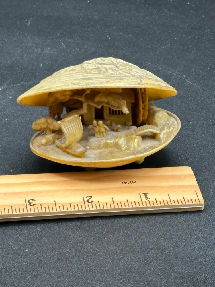 This vintage Japanese folk art figurine from the 1950s is a unique piece of post-war craftsmanship, depicting intricate scenes in a beige color palette. Made of celluloid plastic, it showcases traditional Japanese design and storytelling, reflecting the cultural significance of the era. This Netsuke figurine, originating from Japan, is a charming and nostalgic collectible item that captures the essence of Japanese folk art from the mid-20th century. It’s 3 by 2 ins. Great piece! Water wheel spins!!