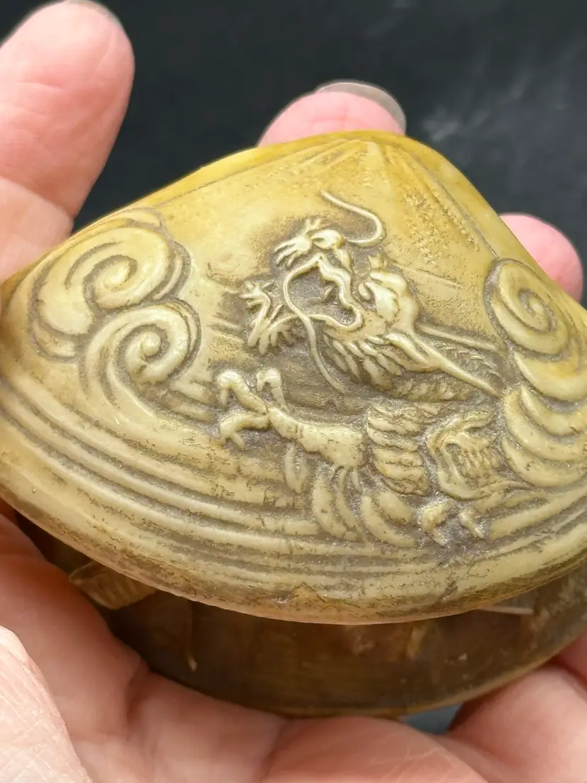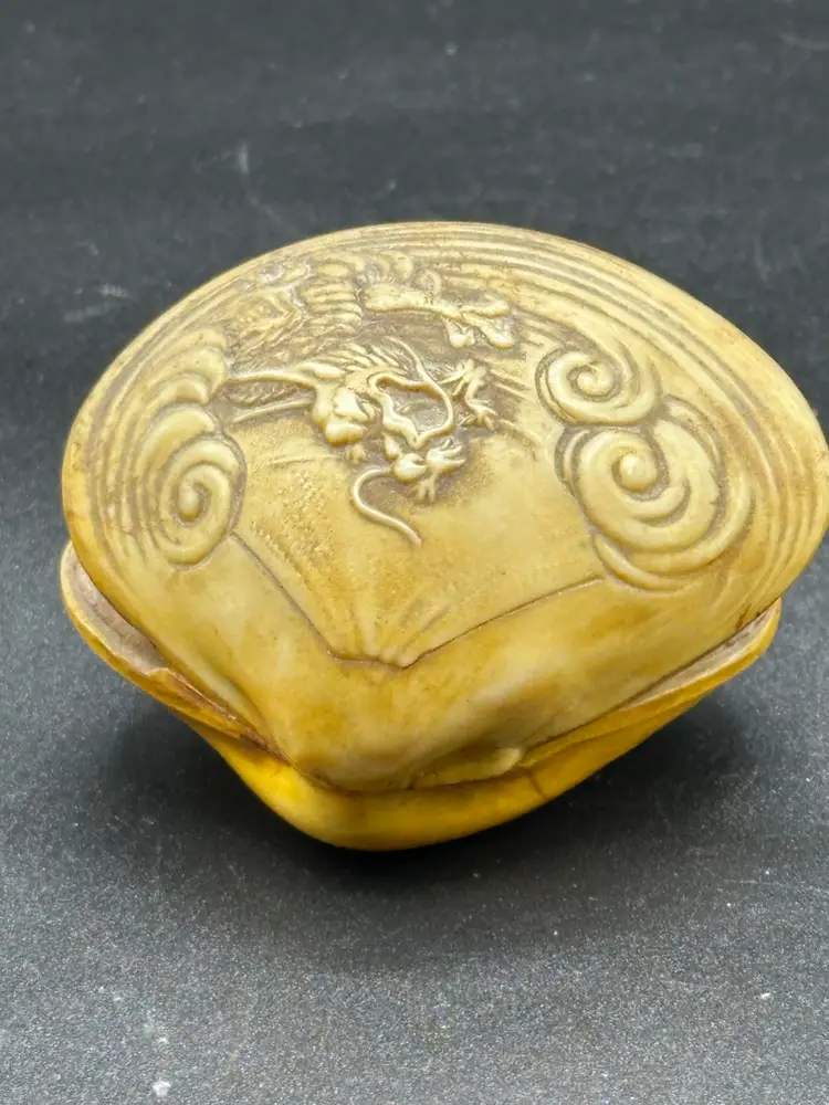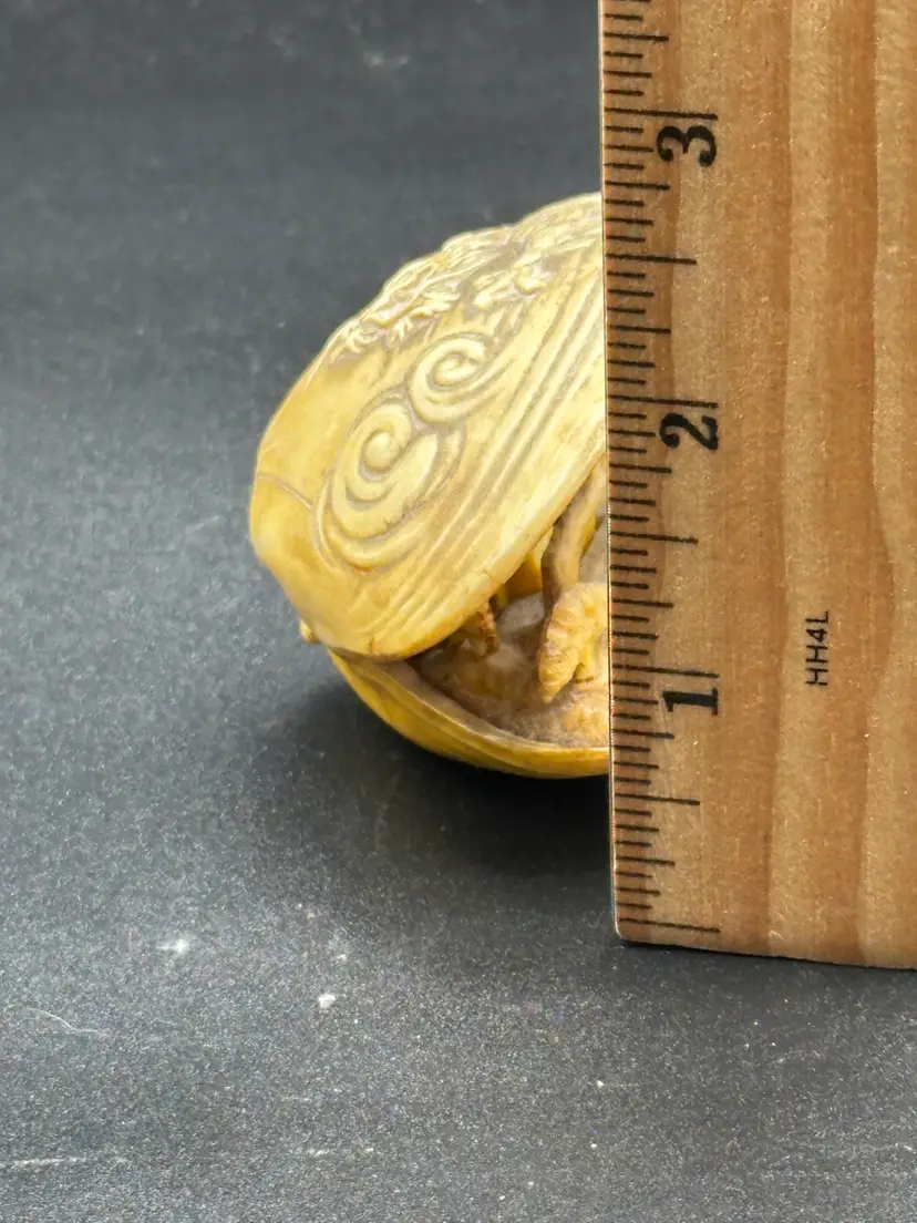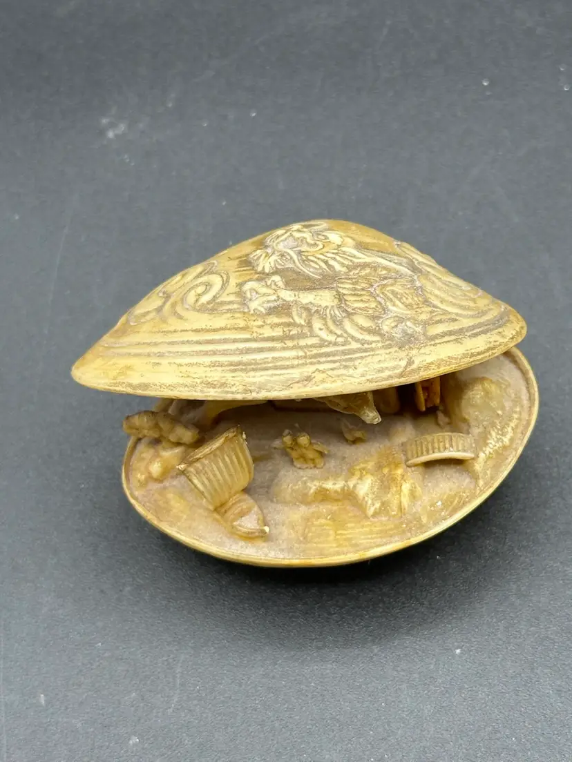 This vintage Japanese folk art figurine from the 1950s is a unique piece of post-war craftsmanship, depicting intricate scenes in a beige color palette. Made of celluloid plastic, it showcases traditional Japanese design and storytelling, reflecting the cultural significance of the era. This Netsuke figurine, originating from Japan, is a charming and nostalgic collectible item that captures the essence of Japanese folk art from the mid-20th century. It’s 3 by 2 ins. Great piece! Water wheel spins!!