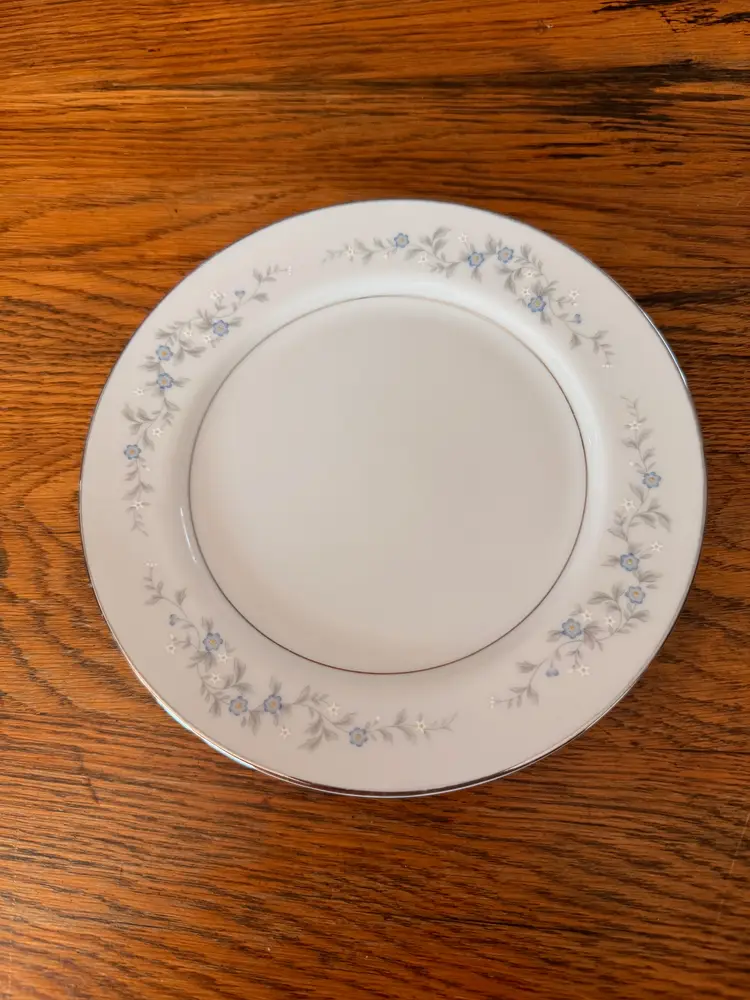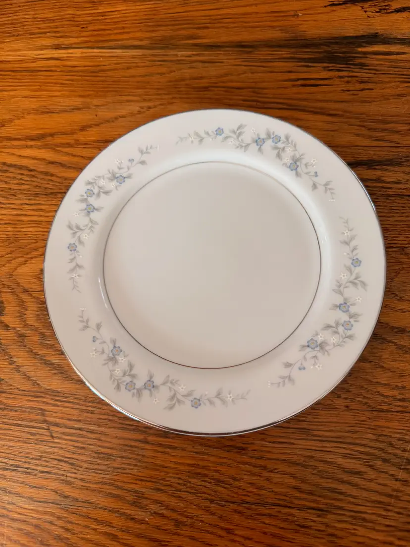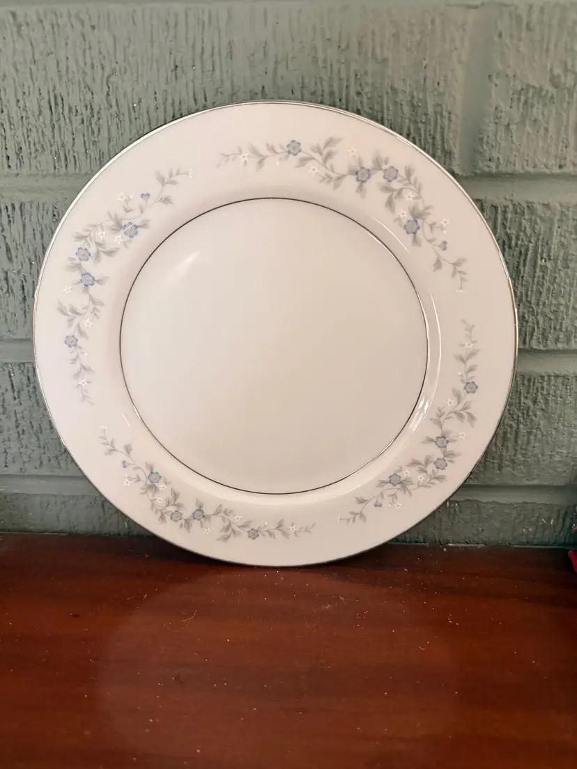 Beautiful vintage Japanese porcelain plate featuring a delicate Forget-Me-Not floral wreath in soft blue with gray foliage. This timeless mid-century design is finished with a subtle platinum/silver rim, giving it an elegant, understated charm that works perfectly for everyday use or special occasions.