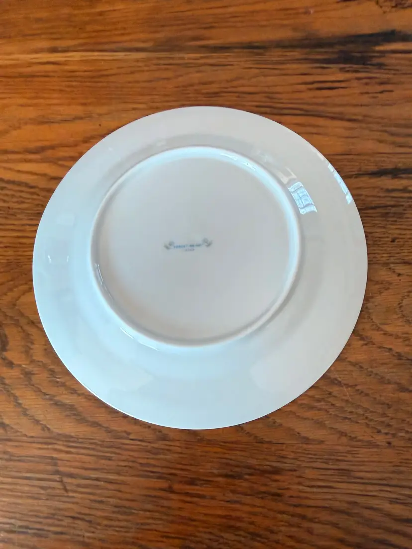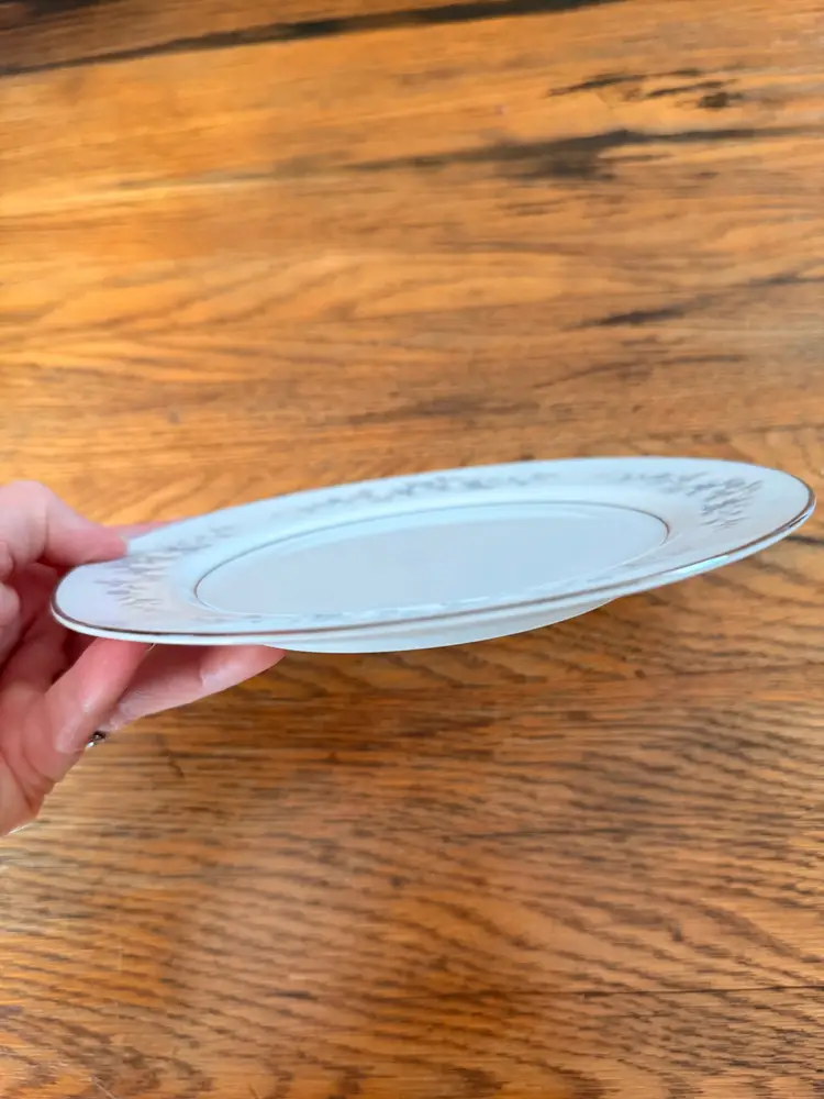✿ Details Origin: Japan Era: Mid-century (circa 1950s–1960s) Material: Porcelain Diameter: Approximately 7.5 inches Pattern: Forget-Me-Not floral wreath Trim: Platinum / silver rim Quantity: One (1) plate