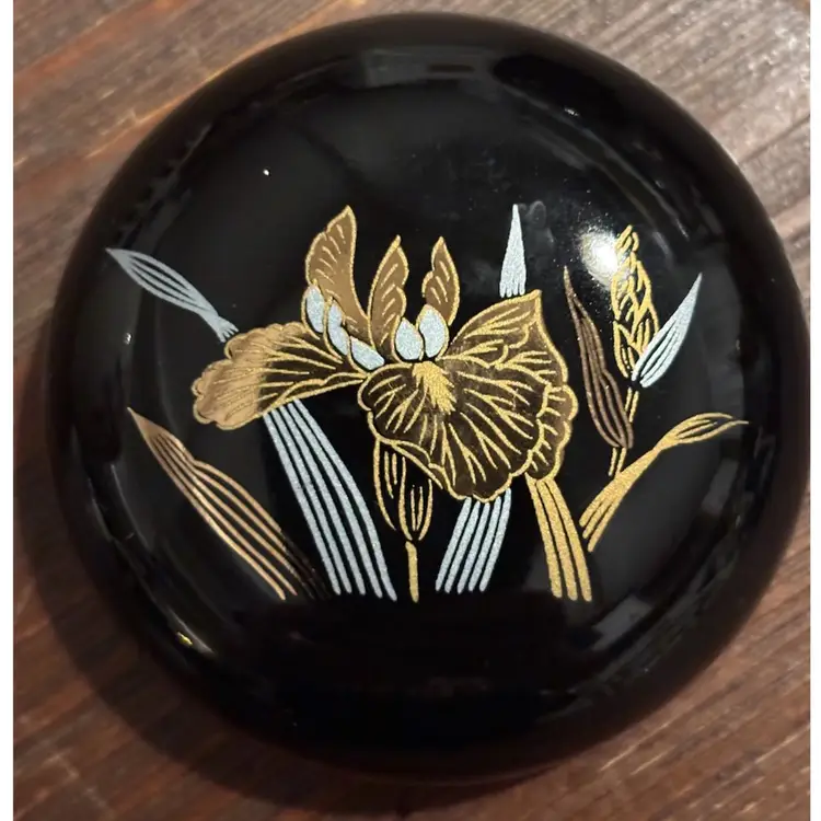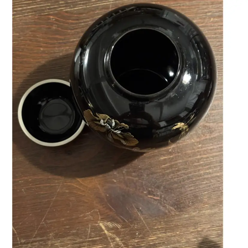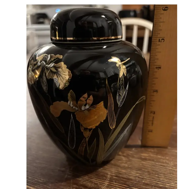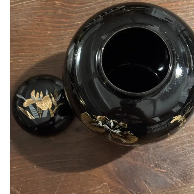 Approx. 6” Vintage black Japanese ginger jar, decorated with an iris flower design and gold accents. No chips or cracks! Excellent condition