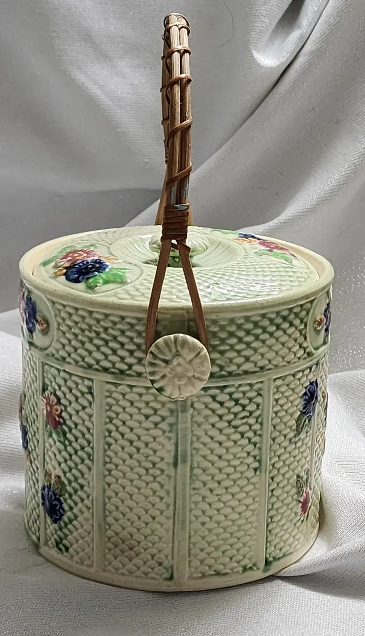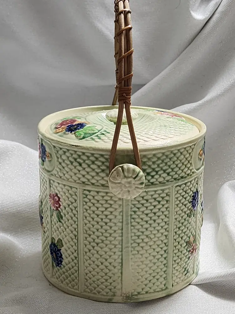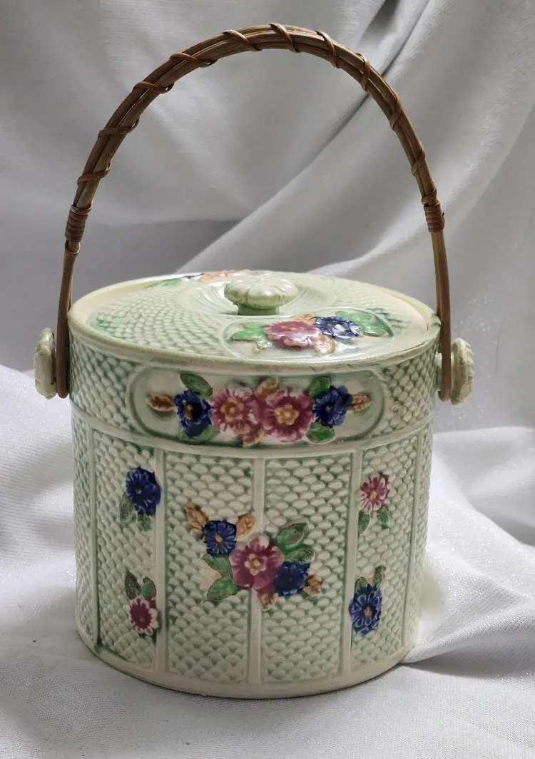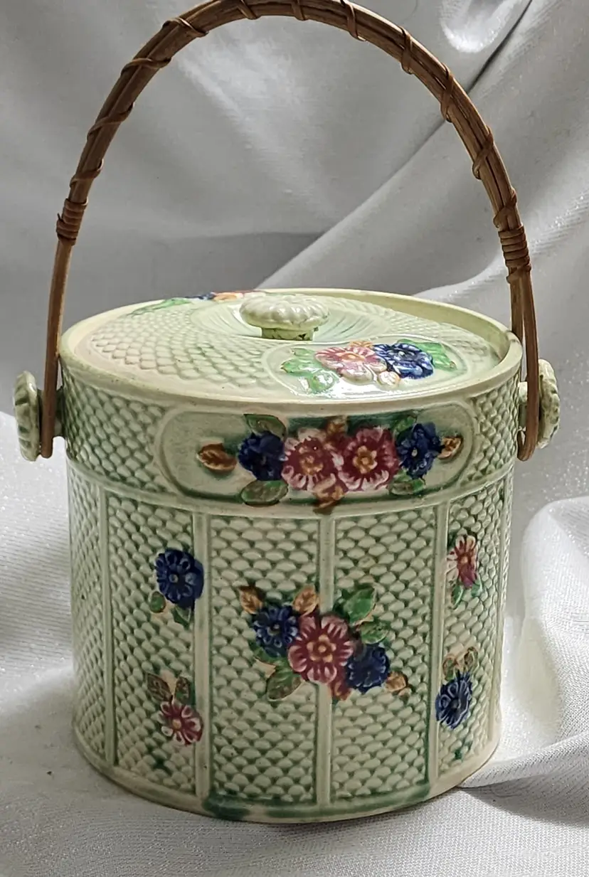 Vintage Japan biscuit or cookie jar with lid & wicker handle. No damage. There is some stains interior and on the bottom. Crazing present. Majolica green on off white ground with pink, blue, yellow & green floral.