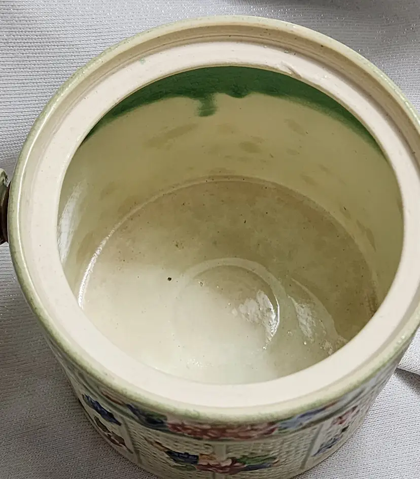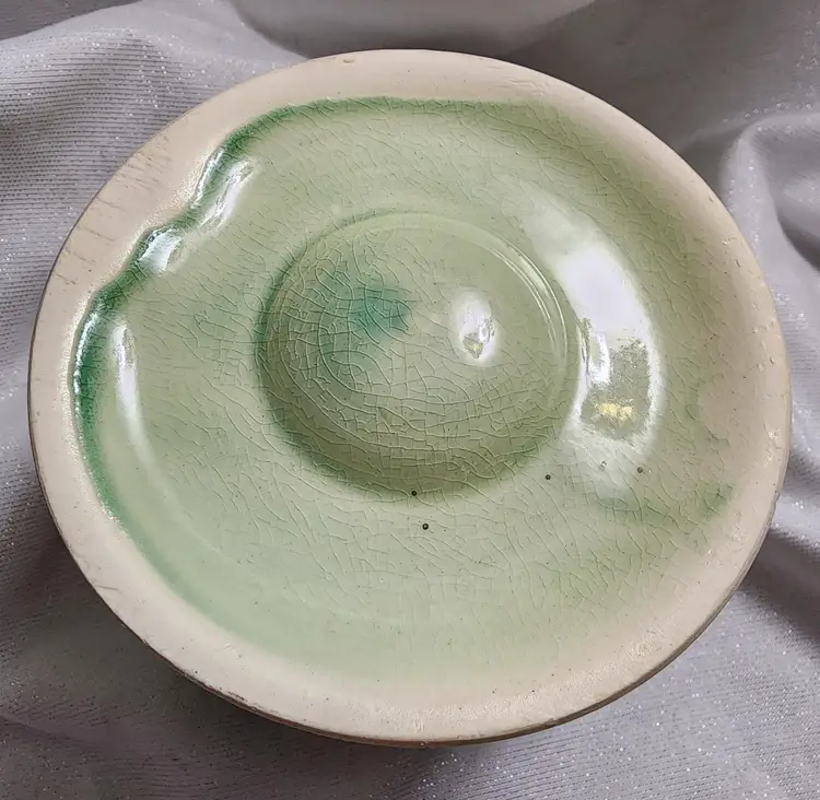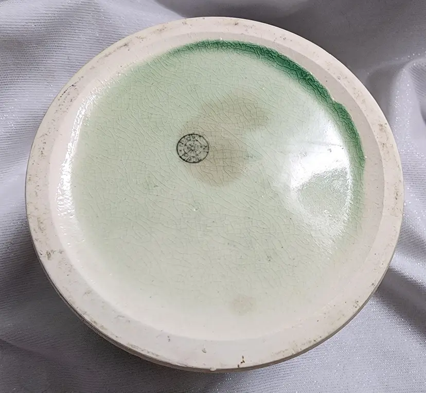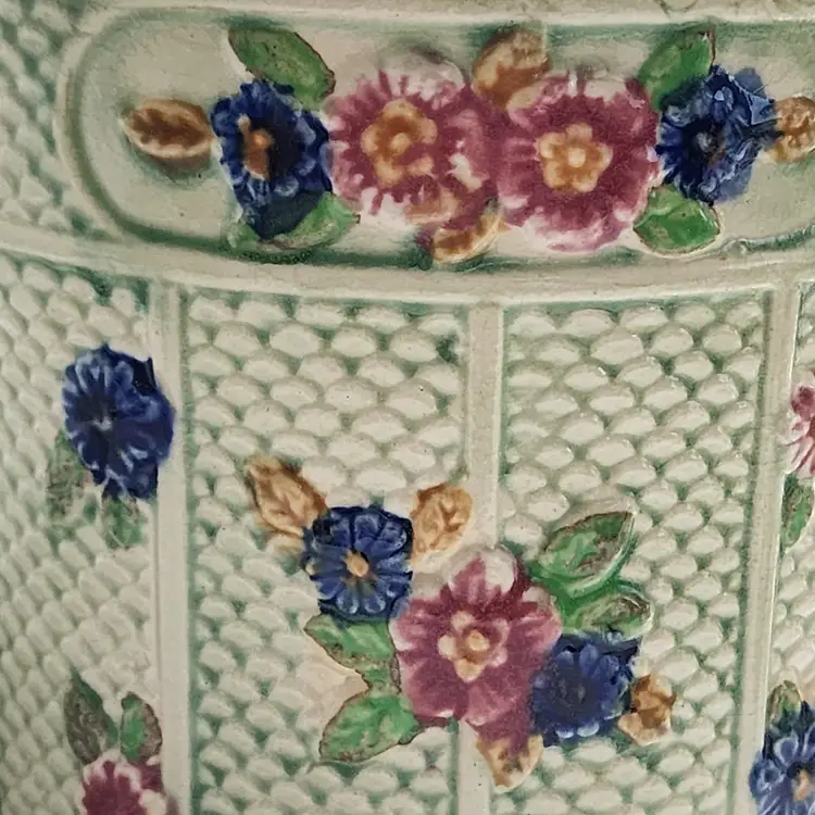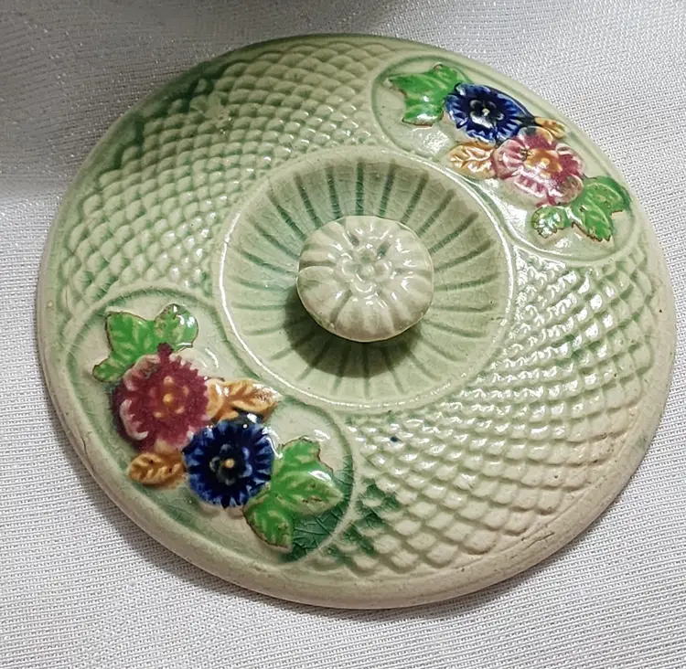Vintage Japan biscuit or cookie jar with lid & wicker handle. No damage. There is some stains interior and on the bottom. Crazing present. Majolica green on off white ground with pink, blue, yellow & green floral.