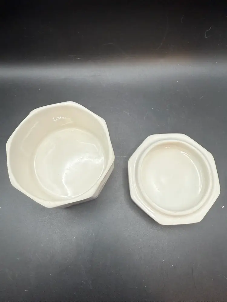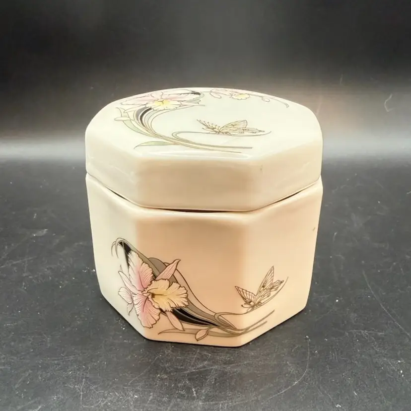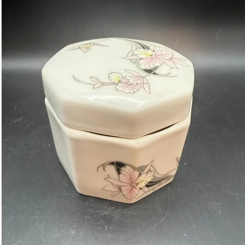 Bone china, a type of porcelain known for its strength and translucence, became particularly popular in the 19th and 20th centuries for fine tableware and decorative objects. Many Japanese manufacturers excelled in producing high-quality bone china. This particular box, with its orchid and butterfly design, is from the mid to late 20th century. The hexagonal shape adds a touch of elegance.