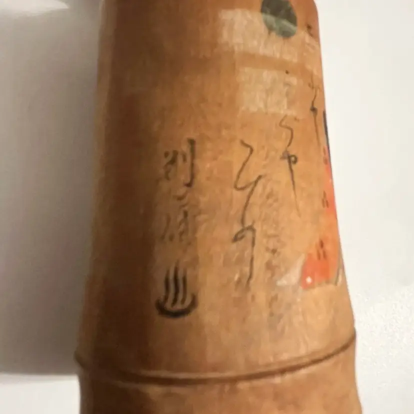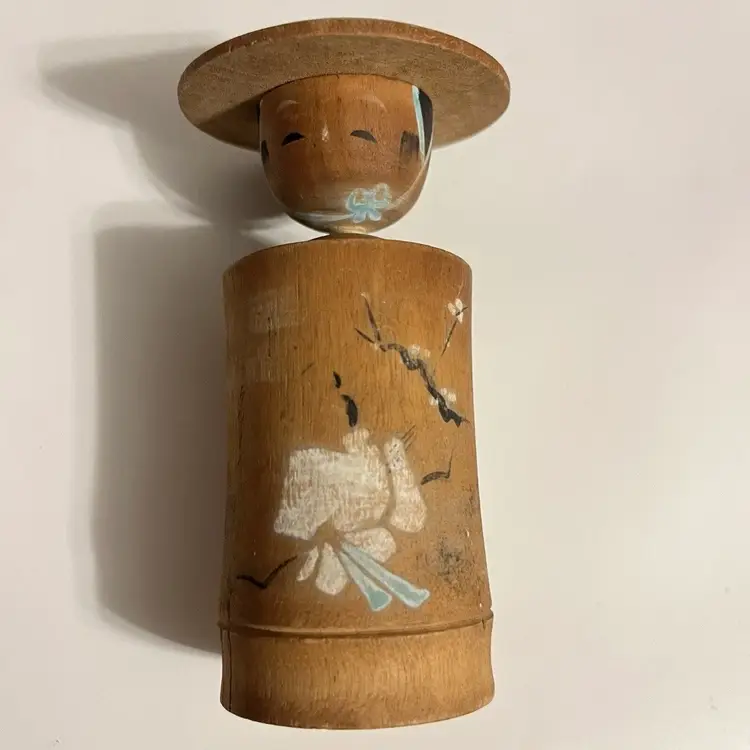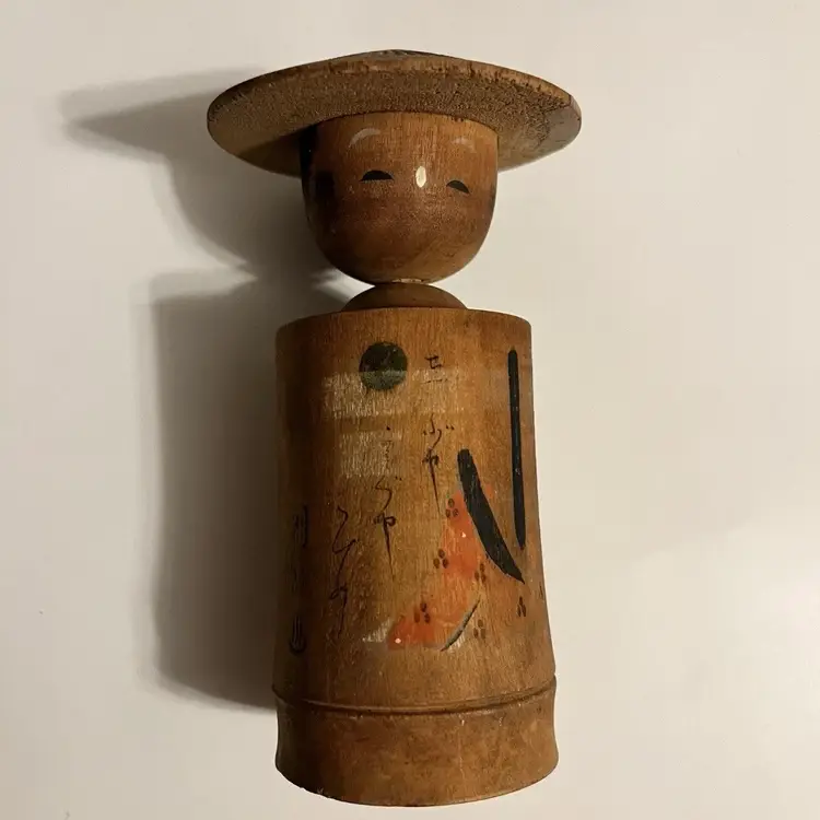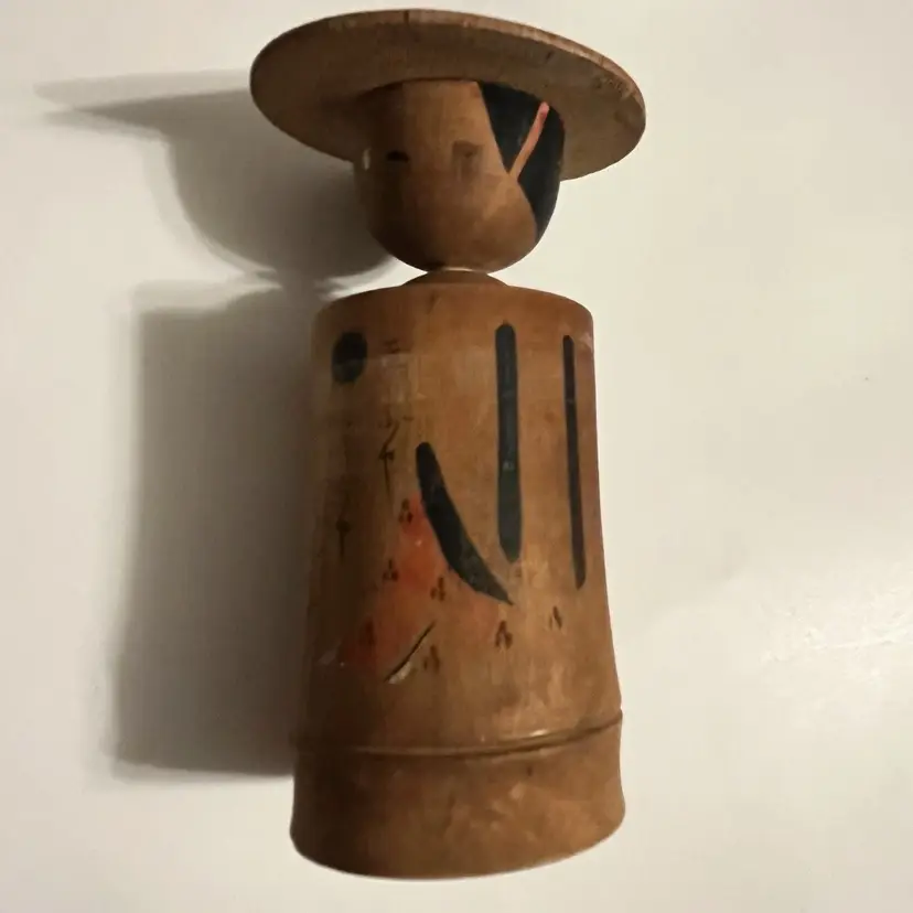 2 Handmade, hand painted wood Kokeshi dolls - Japanese folk art - nodder style (movable head). Each is wearing a shade hat. Although paint is faded characters can be seen easily on one with red and black design on body and on the other is a delicate whoite flower and branch. SEE PHOTOS.