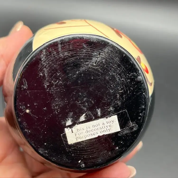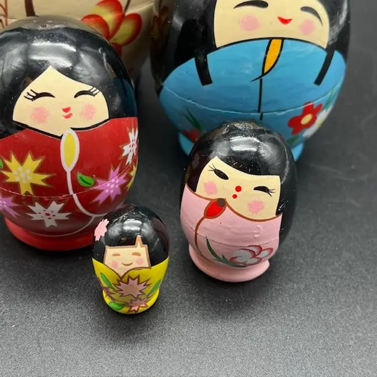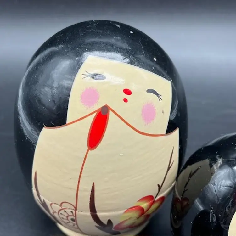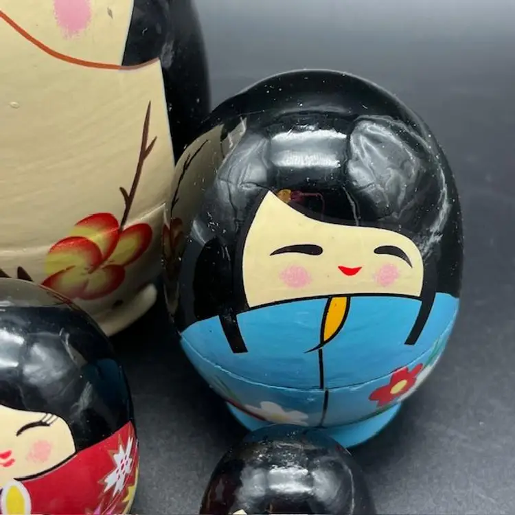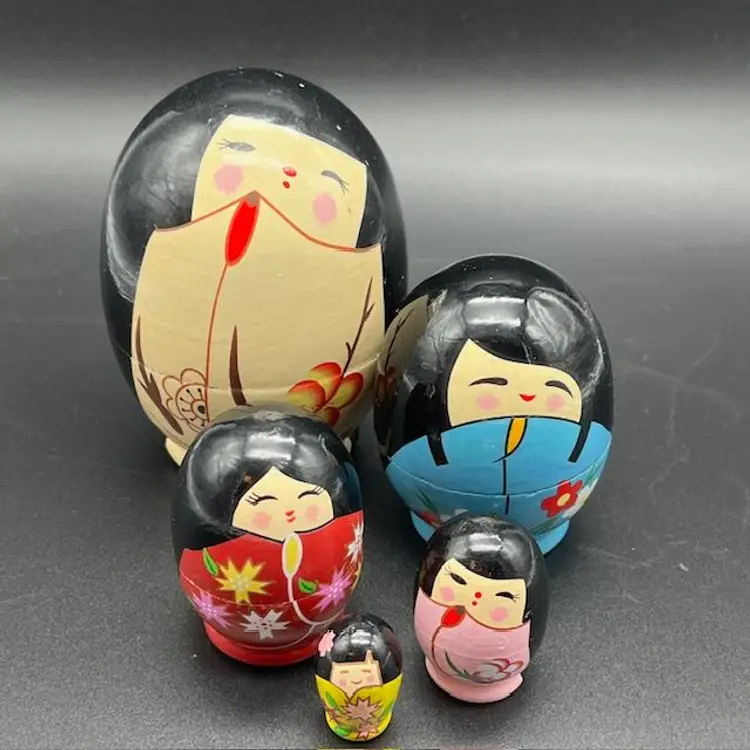 This delightful set of vintage Japanese Kokeshi nesting dolls features five beautifully hand-painted wooden dolls. Each doll fits perfectly inside the next, showcasing traditional Japanese artistry and charm. A perfect addition to any collection or as a unique gift. "From across the room I thought this was a penguin :)