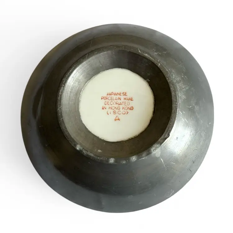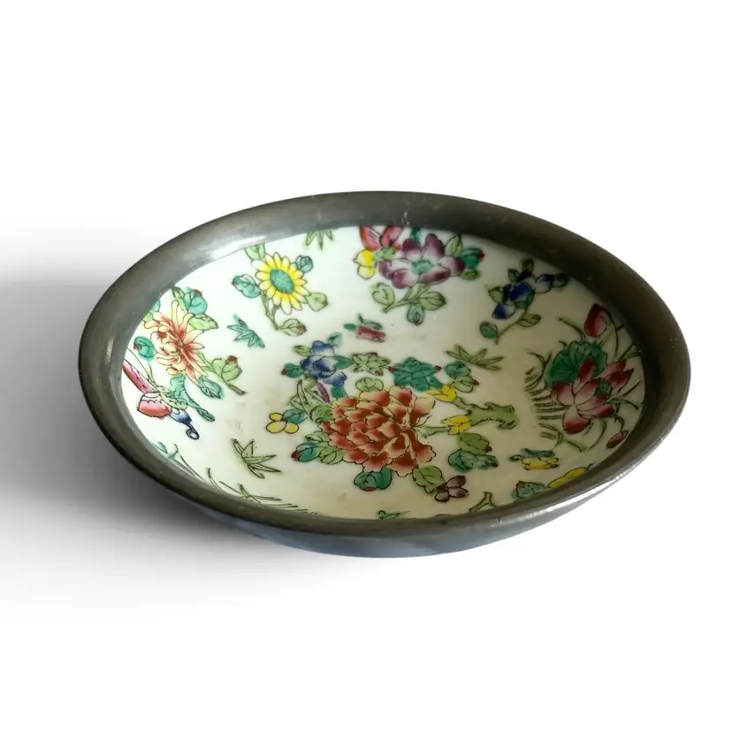 The porcelain rests securely within a pressed pewter mounting, whose muted patina provides a gentle contrast to the bright, botanical motif. The pewter base lends a touch of antique elegance while keeping the bowl steady on a dresser, vanity, or coffee table. Its compact size makes it an ideal catchall for jewelry, cufflinks, or small trinkets, or it can be used as a decorative suzuri-style bowl in a refined shelf vignette.There is some crazing due to age. Size: 6" D | Weight: 1 lb