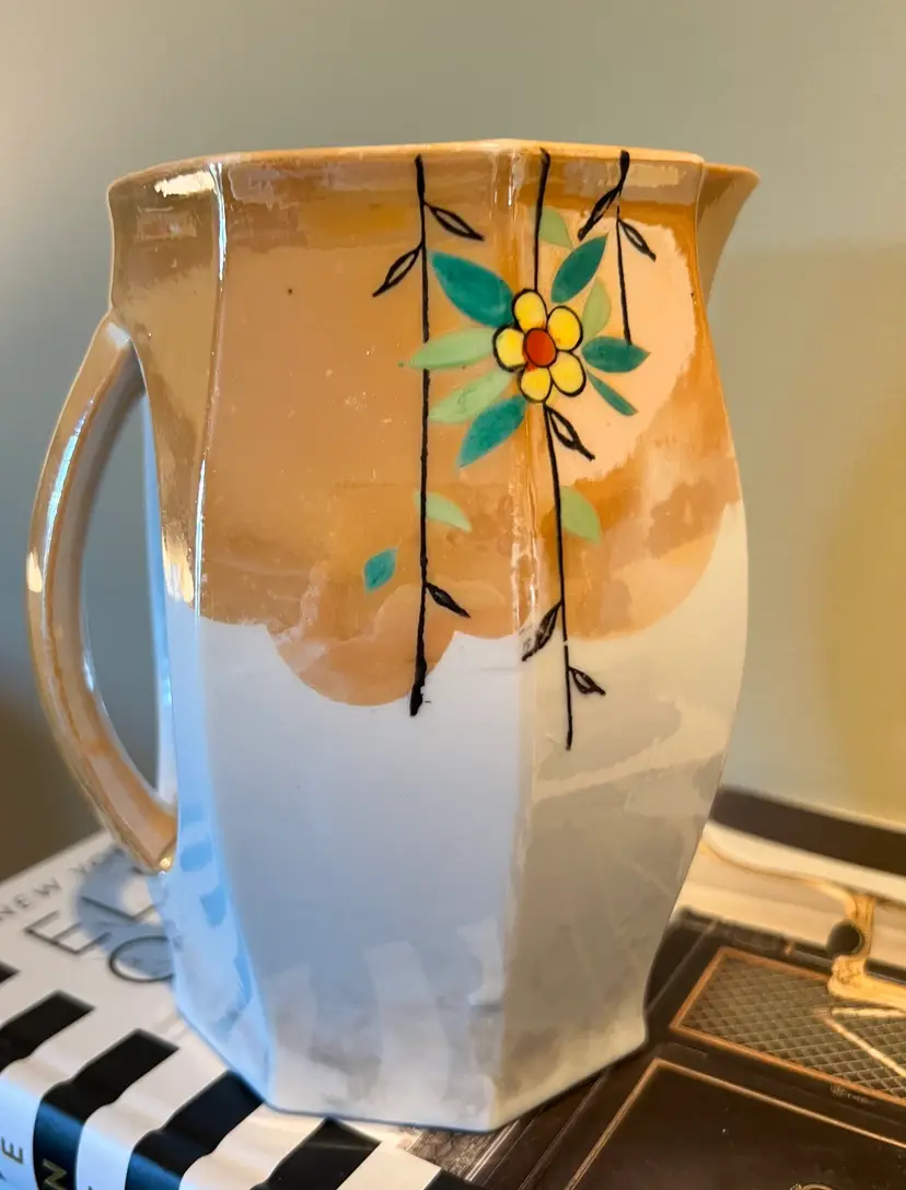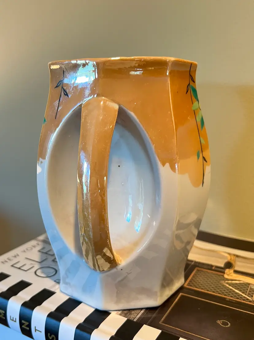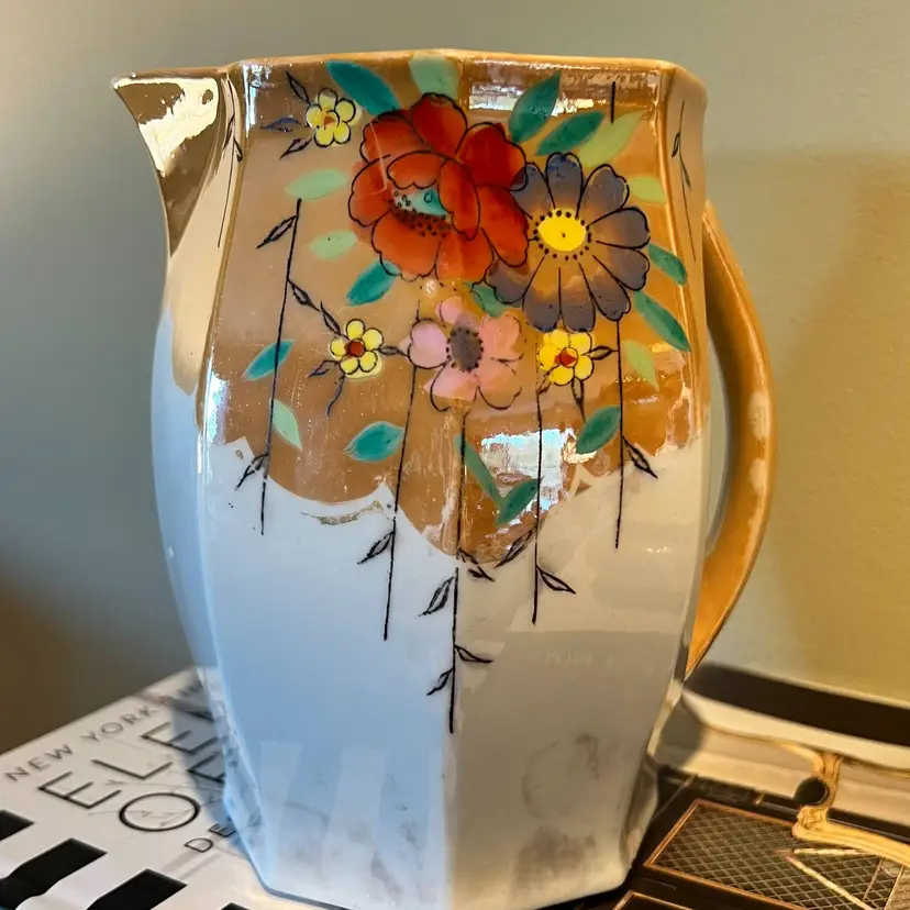 Vintage Japanese lusterware pitcher with a hand painted floral design. Lusterware is porcelain with a metallic , iridescent glaze. This piece possibly dates back to the mid-20th century. This vase has beautiful age markings along the bottom and is in good vintage condition.